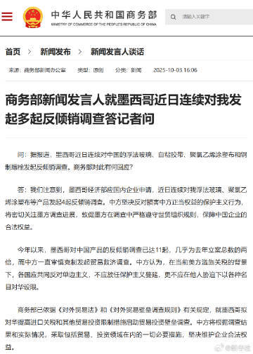 #商务部回应墨西哥对我发起多起反倾销调查#【商务部新闻发言人就墨西哥近日连续对我发起多起反倾销调查答记者问】问:据报道,墨西哥近日连续对中国的浮法玻璃、自粘胶带、聚氯乙烯涂塑布和钢制螺栓发起反倾销调查。商务部对此有何回应?