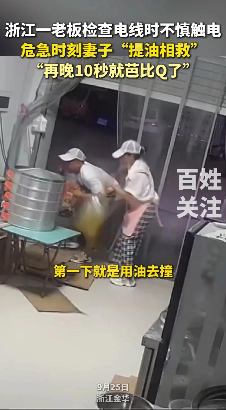 早餐店老板被漏电的电线粘住,关键时刻,妻子提着大油桶,给了老板一油桶,事后老板不但没责怪妻子的“野蛮”,还感激妻子“如果再晚10秒就完了” 浙江金华这对经营早餐店的夫妻,遇到了蒸锅漏电的问题,在老板动手检查的时候,没想到被漏电的电线粘住了。 老板发出的叫声惊动了店里的老板娘,老板娘提着大油桶就撞了上去,愣是把老板和电线给撞开了。 这反应速度和机智,让我佩服不已,一般的女的,看见这种场面估计都吓蒙圈了,只能原地抱着俩小手手,说怎么办怎么办! 换成我,我也做不到反应这么快,这老板娘的反应太机智了!