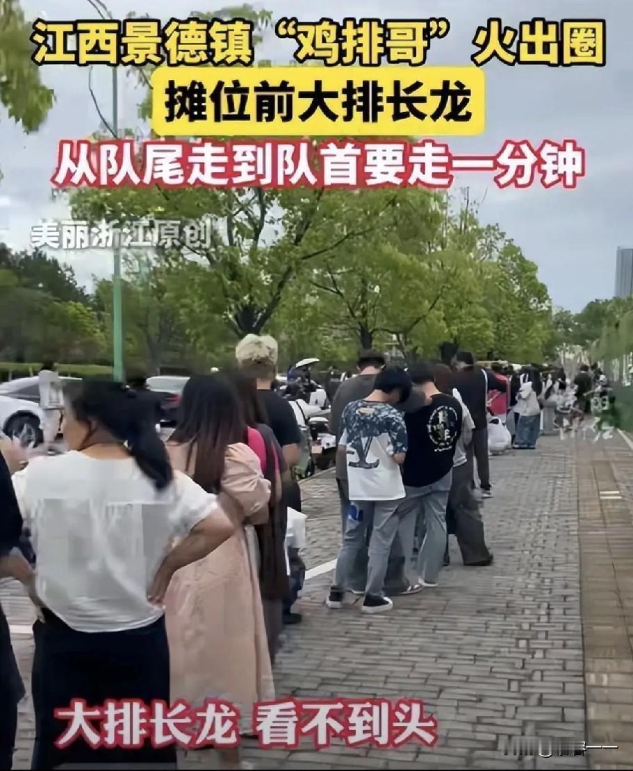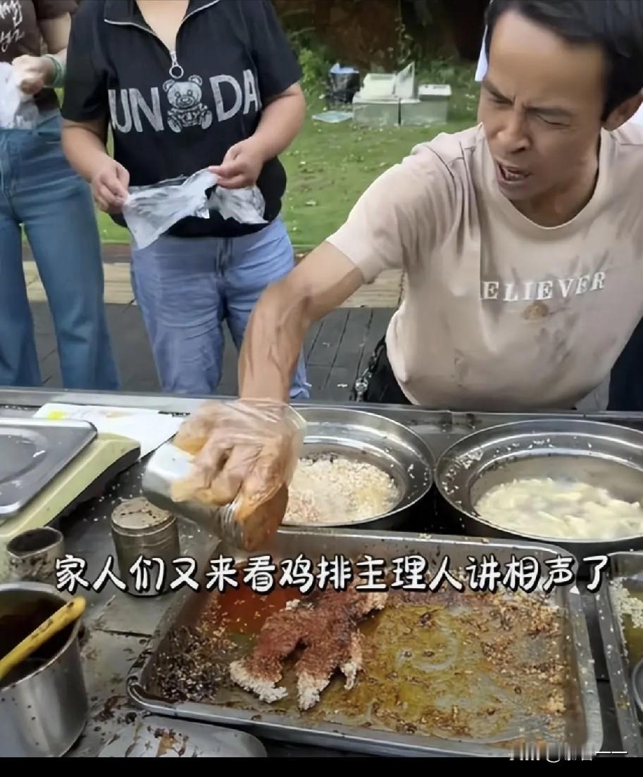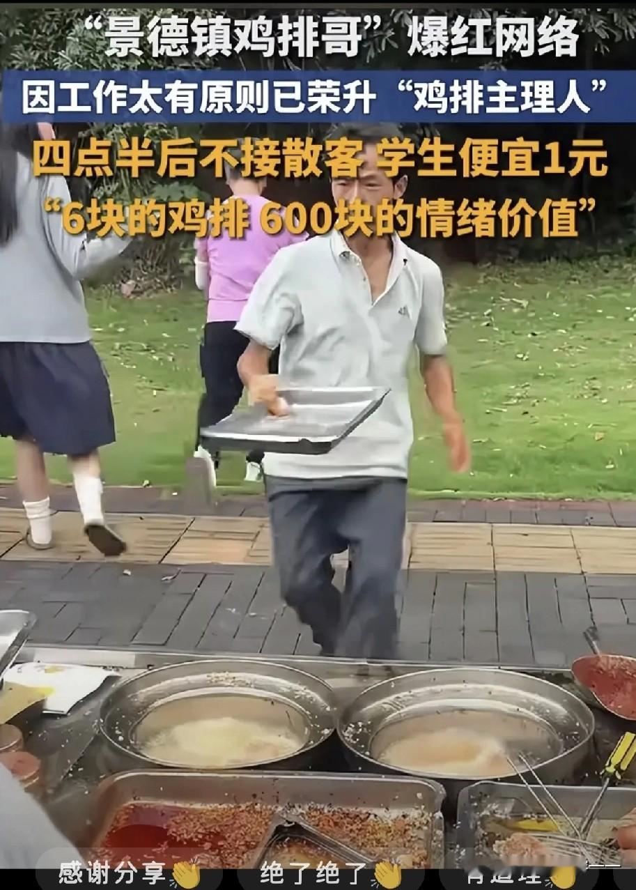“一人带火一座城”的神话,在景德镇鸡排哥身上实现了。 这个在景德镇卖鸡排的哥叫李俊永,今年48岁,江西南昌人。 6岁左右他就跟随父母来到景德镇,在景德镇生活。 后来中学毕业后,没有考上高中,于是他就去工厂打工,后来感觉工厂生活太受拘束,工资又低,于是他就去学厨师,想着以后自己开饭店,自己当老板,自由又赚钱。 后来事与愿违,饭店没开起来,给还是给别人当厨师。工资太低,又不能顾家,也不能养家。 于是他开始摆摊卖小吃。 他卖过很多小吃,后来他主攻学校周边的生意,主卖鸡柳和鸡排。他的鸡排6元一个,学生5元。 鸡排哥的鸡排6元一个,但是他给人提供的情绪价值最起码值60元。 因为鸡排哥张口就是金句频出,什么"我没有任何理由让你等了"、"请做好准备,您的美味马上到来"、"我最需要的是速度"、"最主要的是不会好久"…… 他能让每一个去买鸡排的人都感觉到不会被冷落。 所以大家都愿意去他那里买鸡排,就这样,鸡排哥火了,连带着鸡排哥的家乡景德镇都火了。 很多人从外地过来就是为了一睹鸡排哥的"芳容"[尬笑]。 再后来,景德镇也注意到了鸡排哥,邀请鸡排哥成为景德镇旅游推介官。 这个国庆假期,鸡排哥一家出动十辆车卖鸡排,天天人满为患,大家算算他一天到底能赚多少?