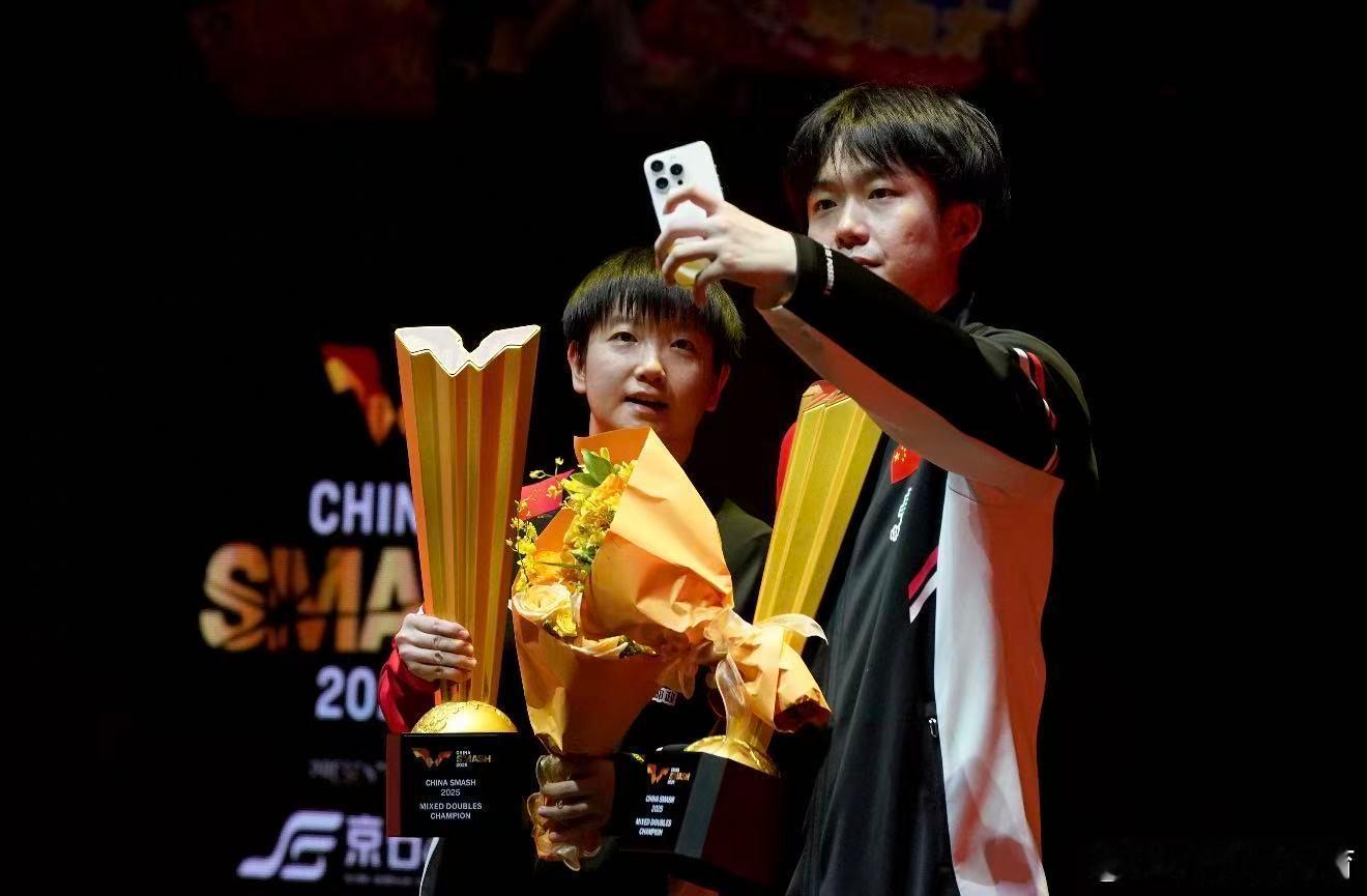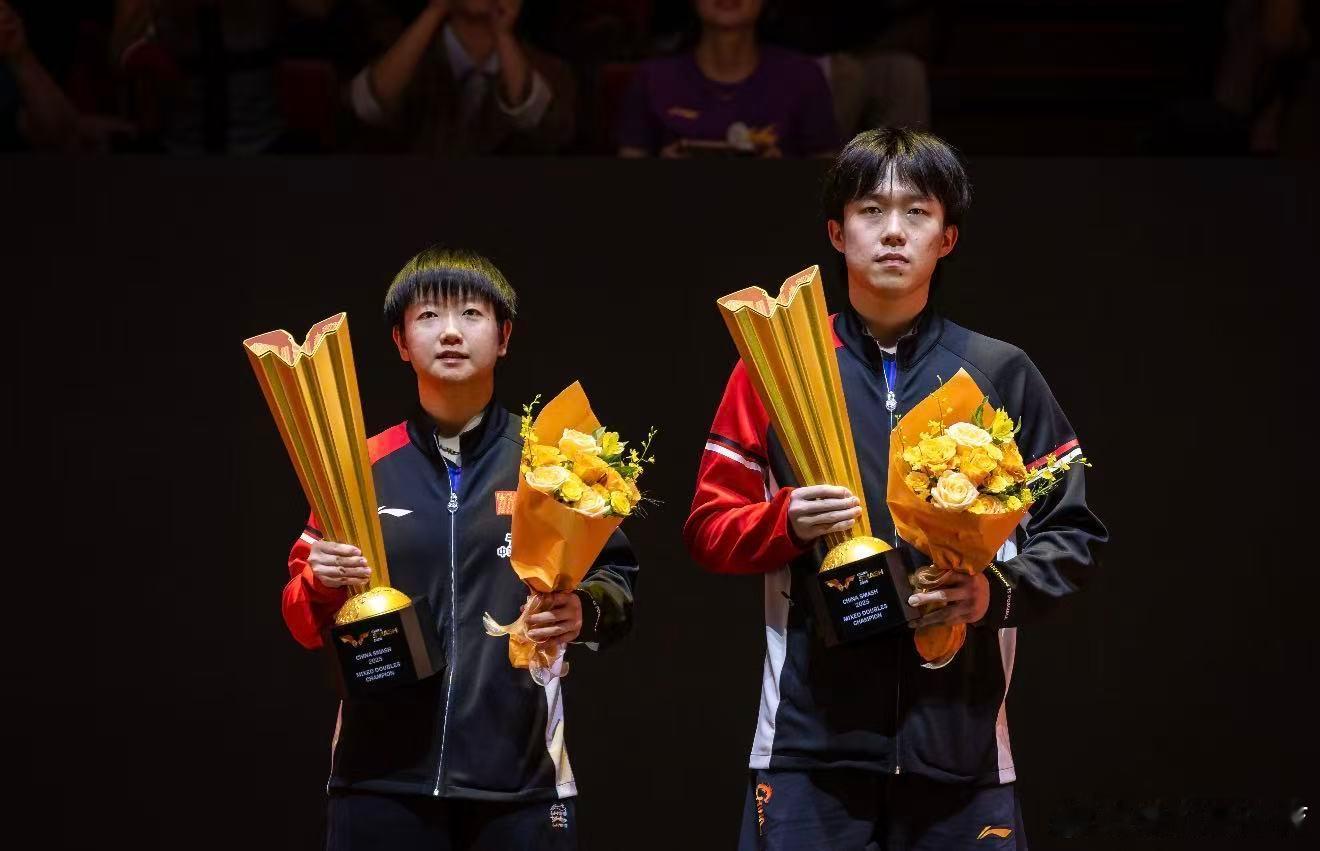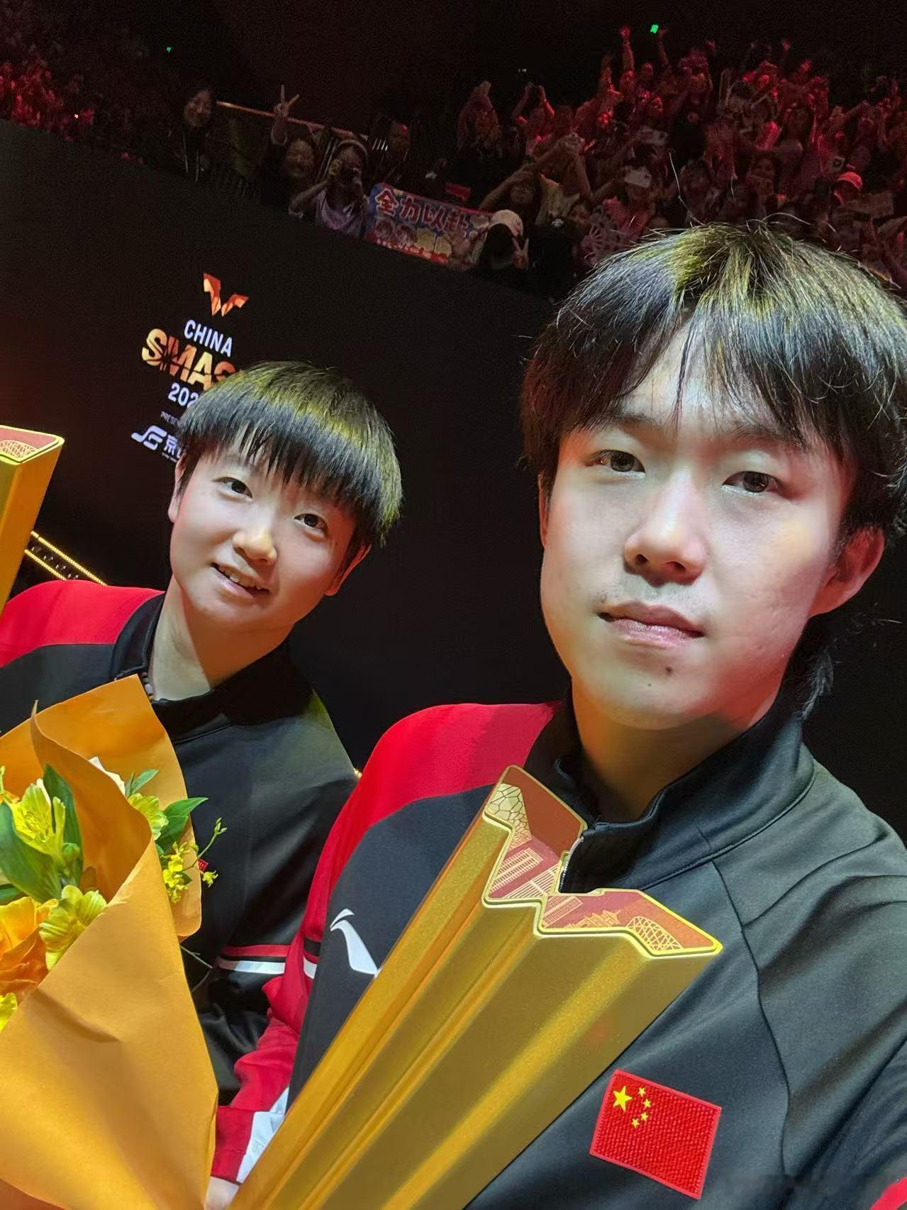 我觉得其实不能说要比那会更强大,我觉得我们两个经历了所有的大赛,配合了这么多年,再到奥运会拿到冠军以后,我认为是在我这一边,思想、心态,包括对于球的理解、混双项目的认知,能跟莎莎做到同频的状态。所以整个场面从世乒赛到现在显得越来越稳定。我这边来说,男子在混双中相当于一个火力点。但这个火力点可能有时候状态很好,有时候状态很差,对于以前的自己来说。但现在我觉得自己能够保持一个比较平稳。并且有质量的一个方式来去面对混双的比赛。(图片来自WTT世界乒联)孙颖莎王楚钦中国大满贯捧杯孙颖莎王楚钦没有太多时间练混双