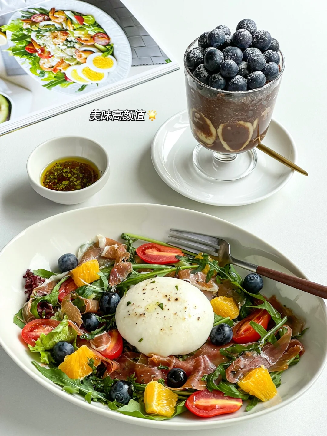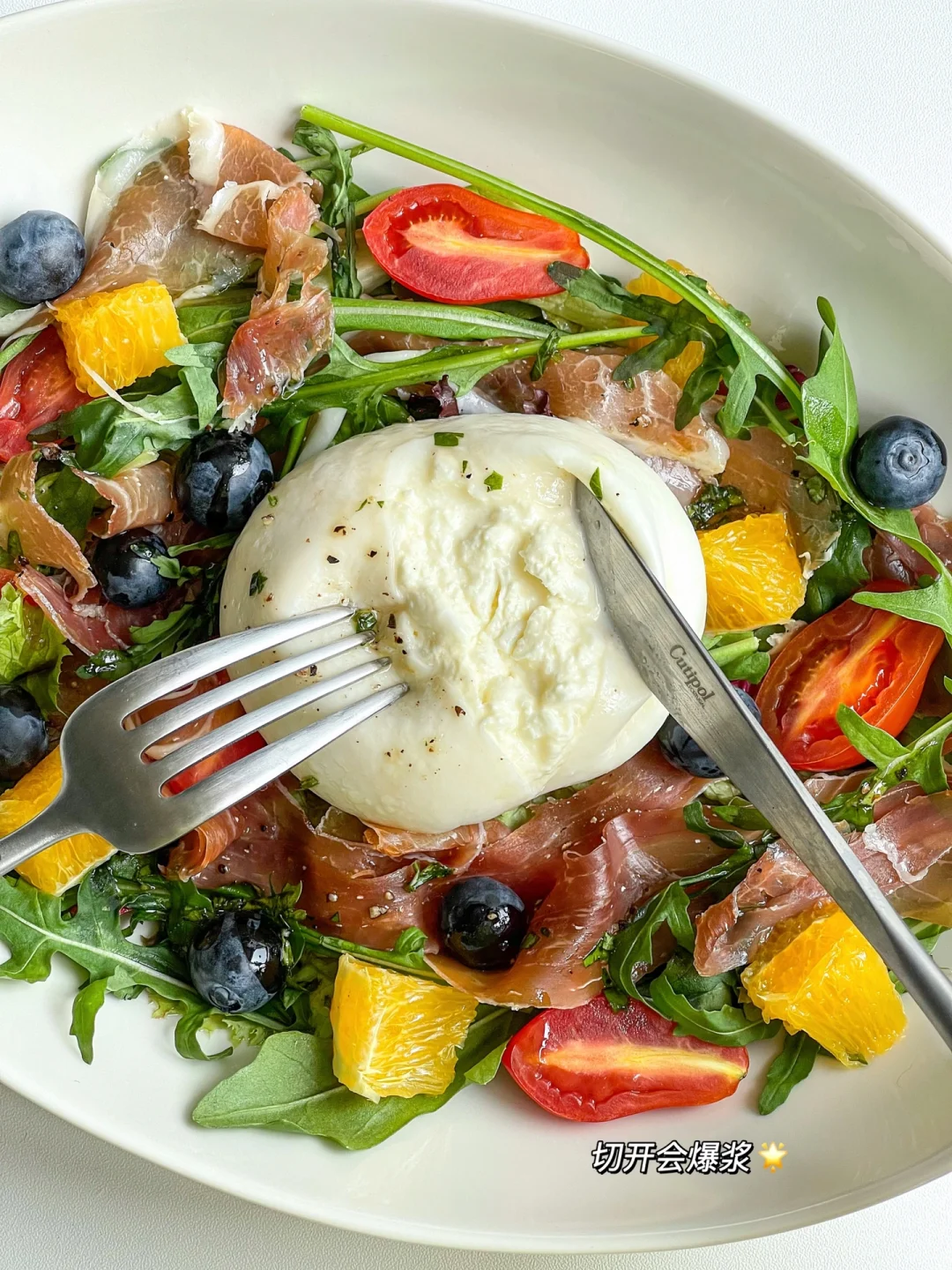 天气热起来就不想开火做饭,想吃简单易做、低卡饱腹的清爽沙拉,今天就来跟大家分享一款超简单的Burrata奶酪沙拉~它是意大利经典的一款沙拉,各种生菜打底,加上喜欢的水果,中间塞上一颗圆鼓鼓的布拉塔奶酪球,它外层是马苏里拉芝士,里面包的是呈豆乳状的凝乳碎块和鲜奶,切开还会爆浆,单独吃这款沙拉能量肯定不够,再搭配一杯帕梅拉同款的咖啡隔夜燕麦杯!咖啡味十足的燕麦杯,配上顶部的大颗蓝莓,一口下去,营养满分,回味无穷,大家一起学起来吧!