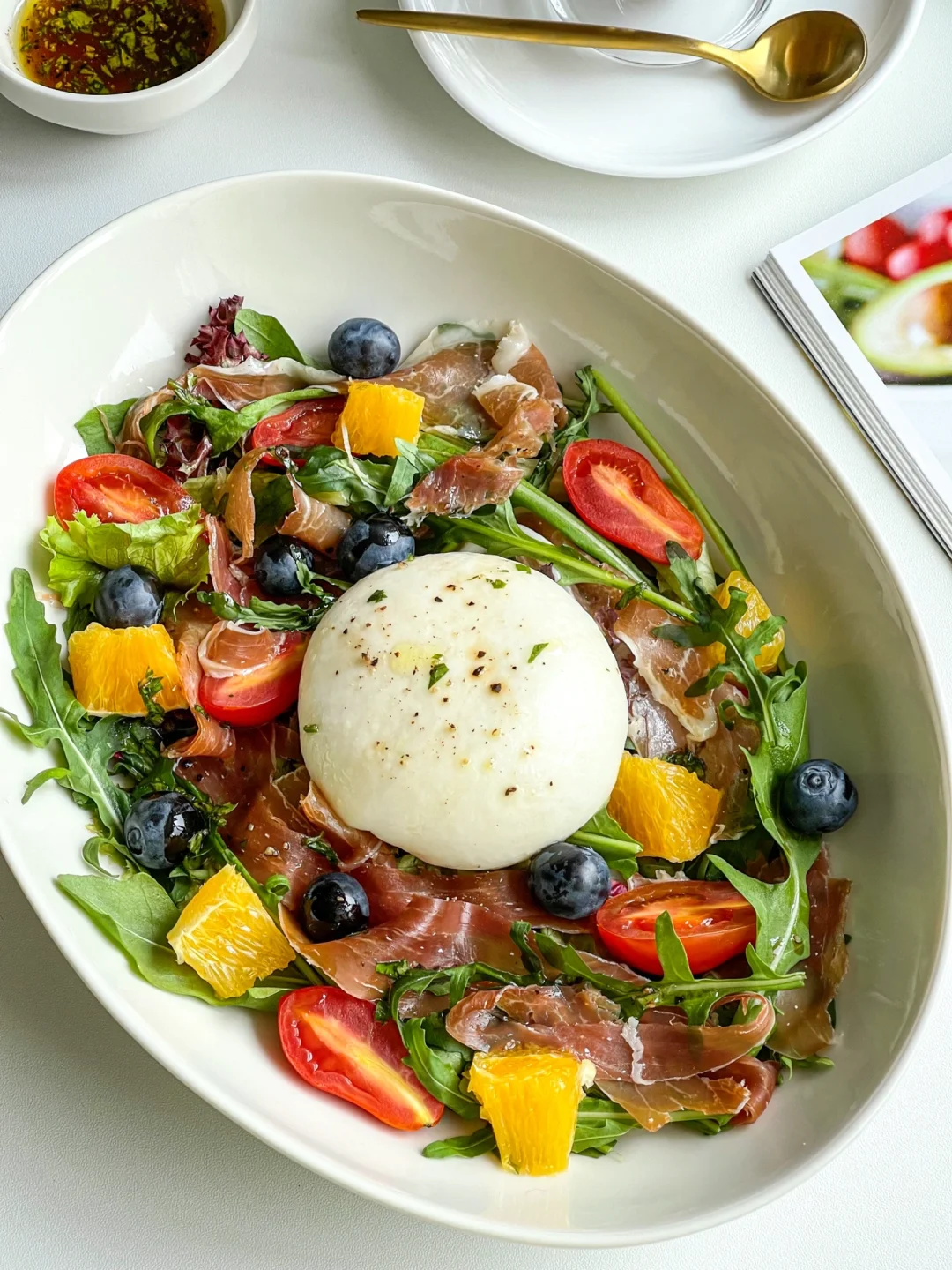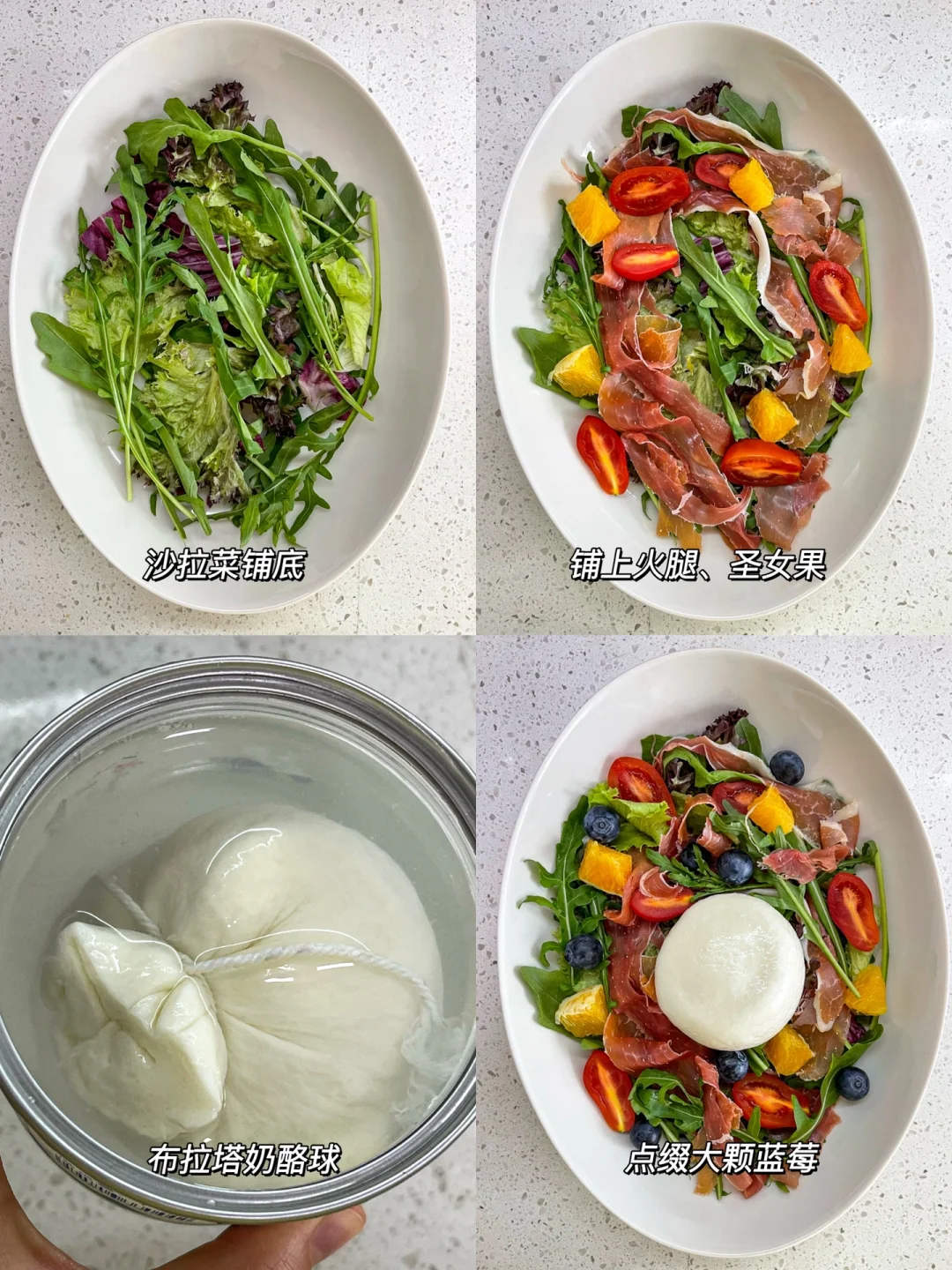 芝麻叶和生菜打底,铺黄瓜片,摆上切块的新鲜无花果、蓝莓。切块的小番茄,铺上意式风干火腿片,中间放上一个burrata奶酪球,吃之前淋上自制油醋汁~完成✅
