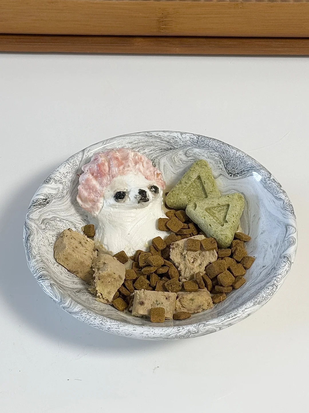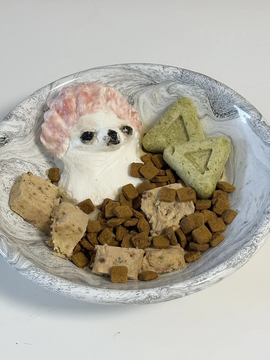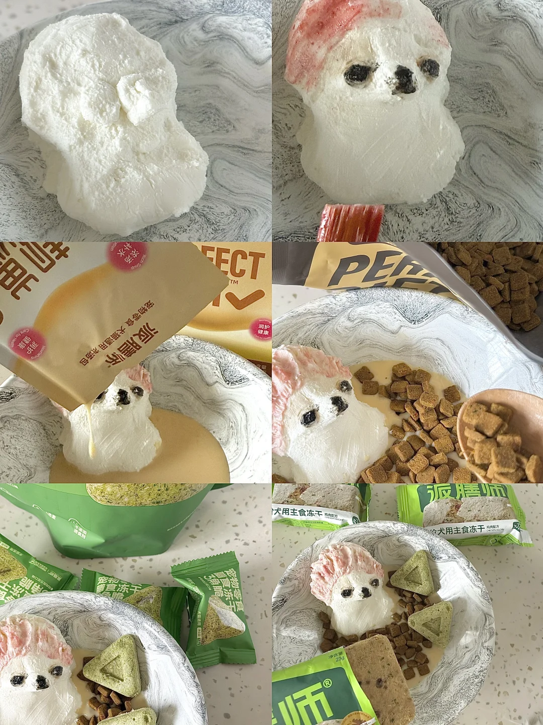1.酸奶做出吉娃娃的形状,用芝麻酱、角豆粉、草莓粉上色