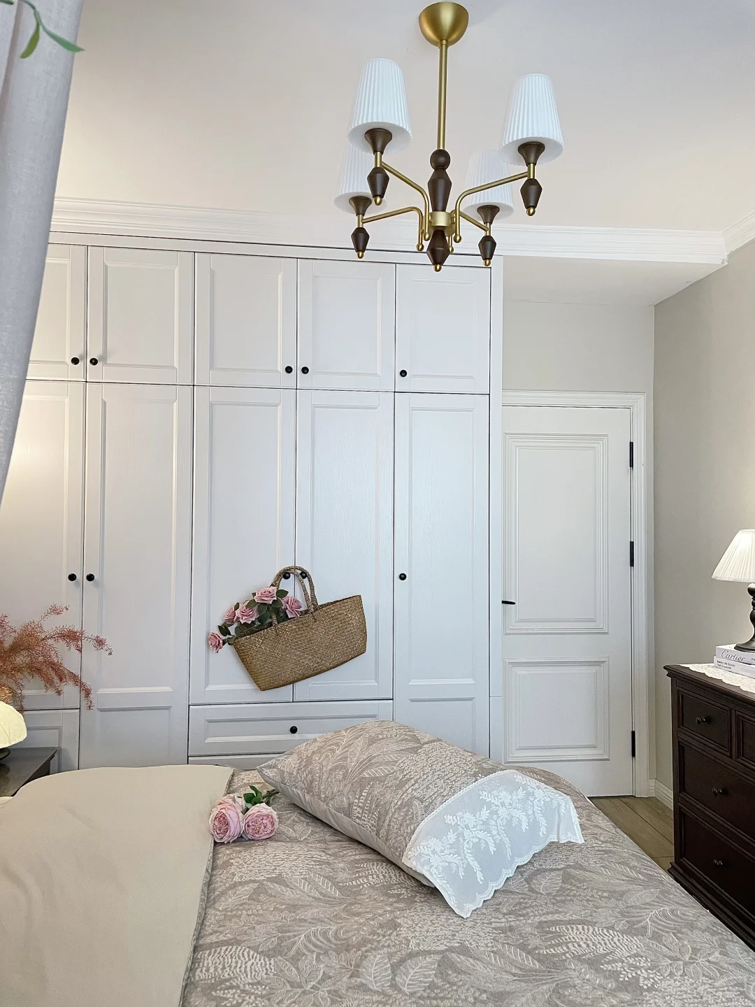 墙面选了奶咖色乳胶漆自带温馨感,顶面四周做了一圈石膏线,简单又有层次,再搭配喜欢的小灯和床品氛围感直接拉满~