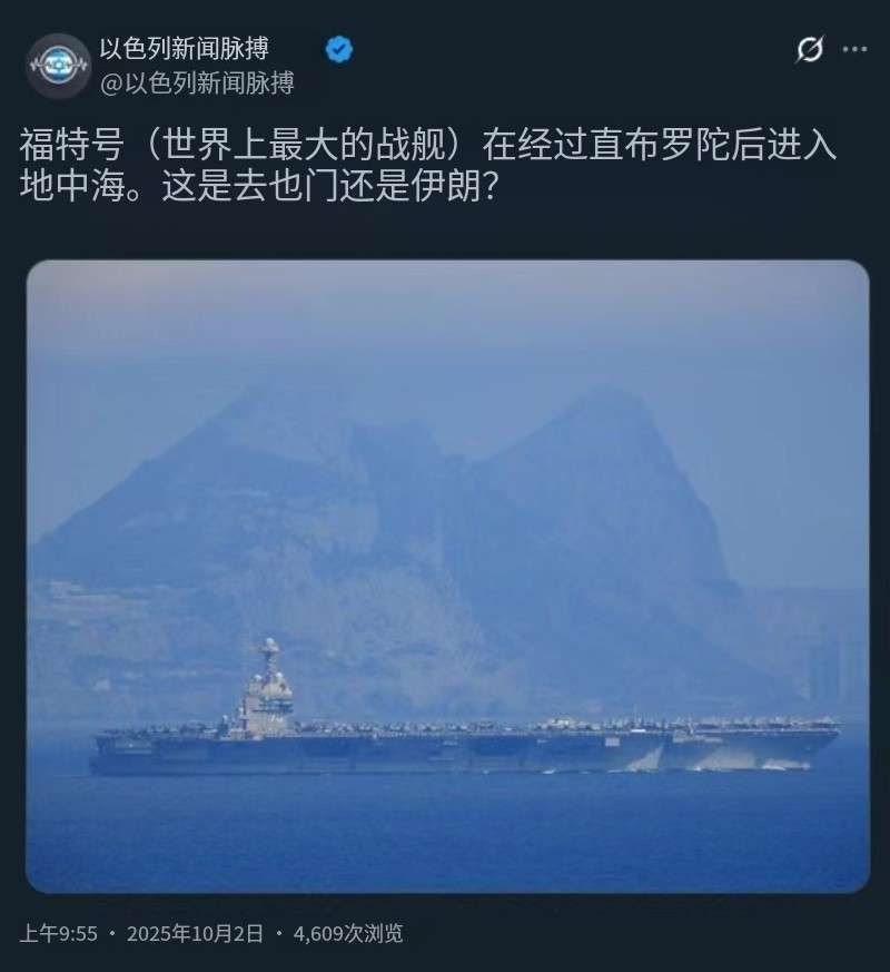 以色列新闻脉搏 :福特号(世界上最大的战舰)在经过直布罗陀后进入地中海。这是去也门还是伊朗?