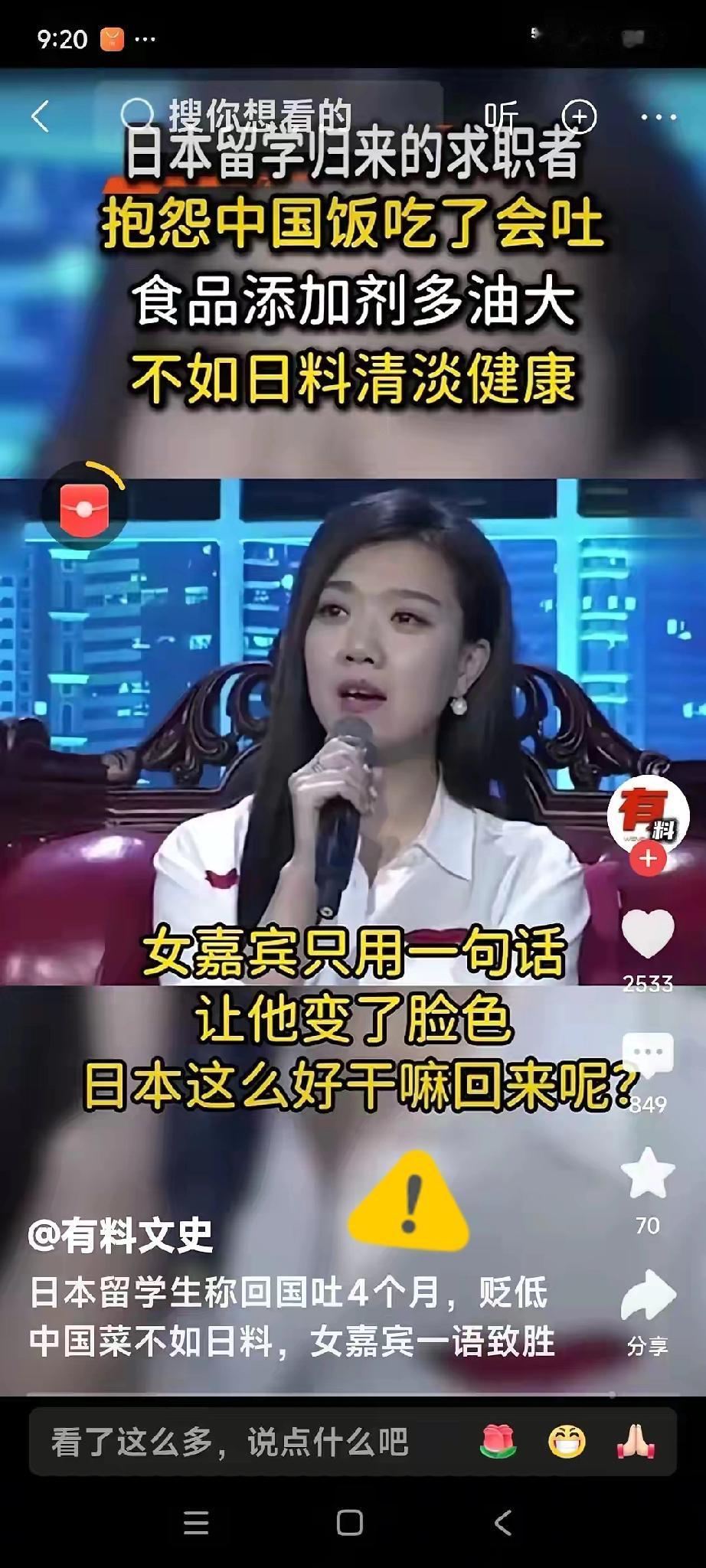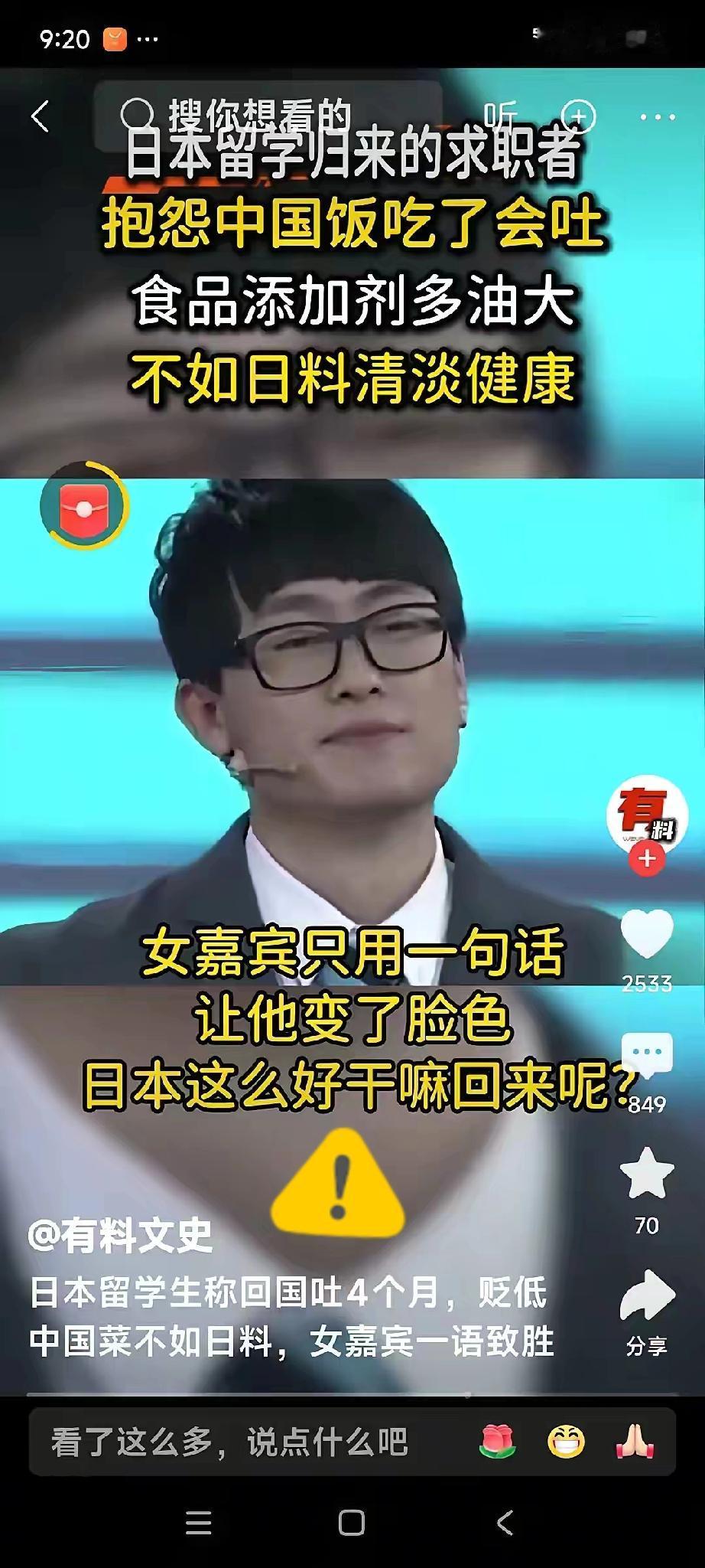 日本icon留学归来的求职者,抱怨中国饭吃了会吐,食品添加剂多,油大,不如日料清淡健康,女嘉宾一句话:中国不吃核辐射,日本那么好,你回来干嘛!让他变了脸色。 这场景简直比电视剧还戏剧化。女嘉宾那句犀利的反问,瞬间戳破了某些海归的优越感泡沫。留学经历本该让人学会客观比较,而不是养成居高临下的批判姿态。 每个国家的饮食文化都扎根于当地的生活环境和历史传承。日本料理讲究原味是真,但中华美食的烟火气里藏着多少代人的智慧。嫌弃中餐油腻的这位,怕是忘了大阪烧也要淋美乃滋,天妇罗更是油炸艺术的极致。 食品安全问题全球都存在,没必要刻意贬低一方。日本农林水产省数据显示,其食品自给率长期徘徊在40%左右,大量依赖进口。而中国近年来食品安全抽检合格率持续保持在97%以上,这是不容忽视的进步。 真正让人不适的,是那种用国外标准丈量一切的思维定式。不同国家的生活体验本该拓宽我们的视野,而不是变成评判故土的标尺。跨越山海之后,最珍贵的应该是理解多元的智慧。 那些年在异国他乡吃不到的家乡味,不正是我们心底最柔软的牵挂吗? 各位读者你们怎么看?欢迎在评论区讨论。