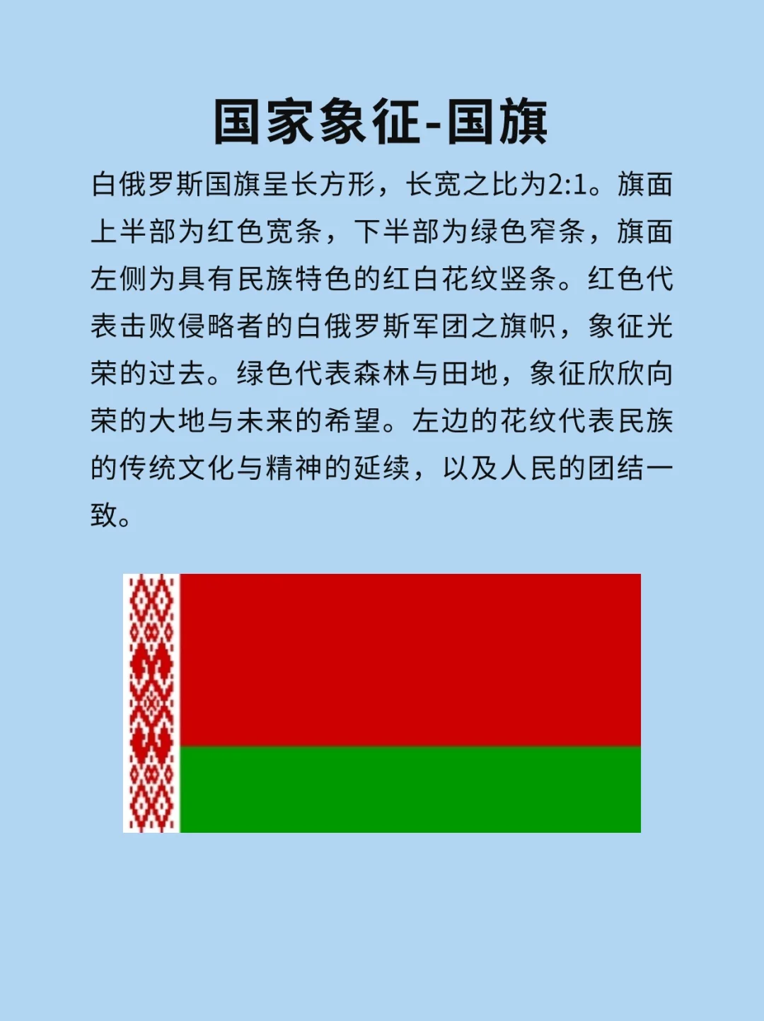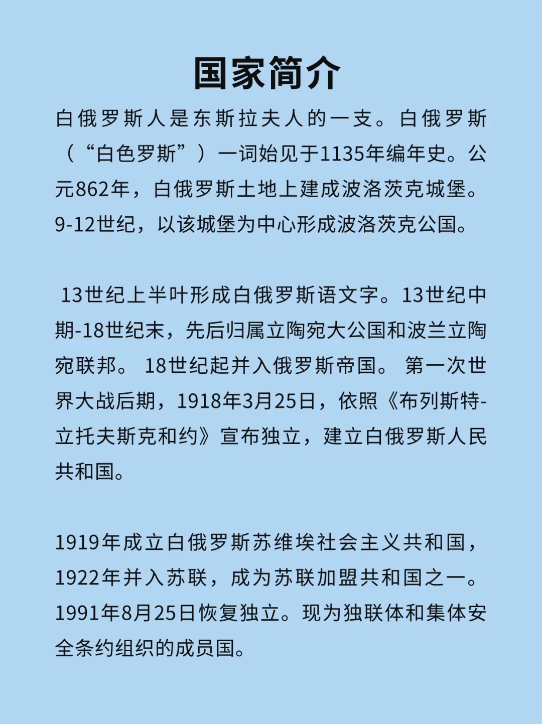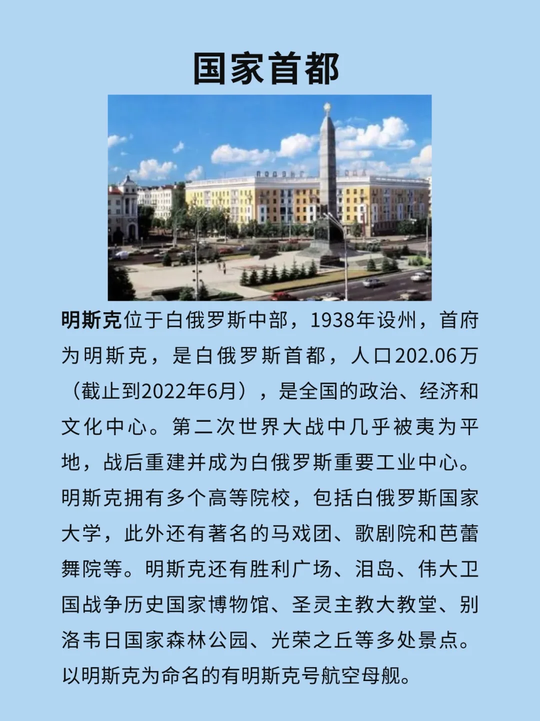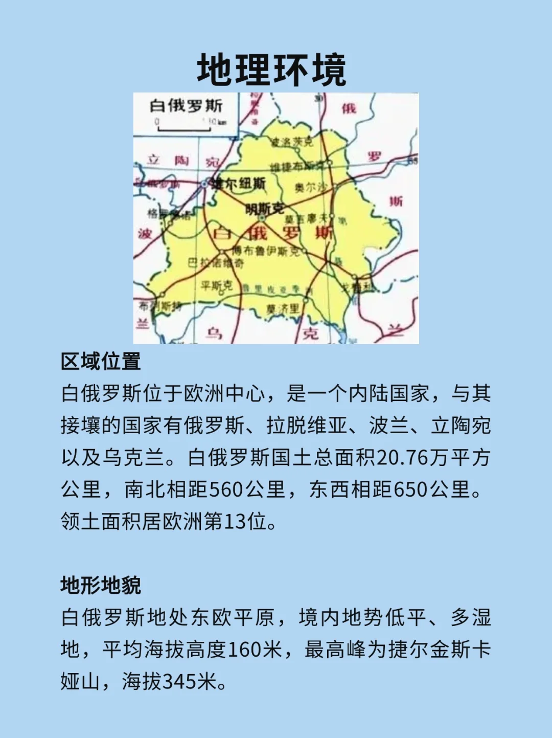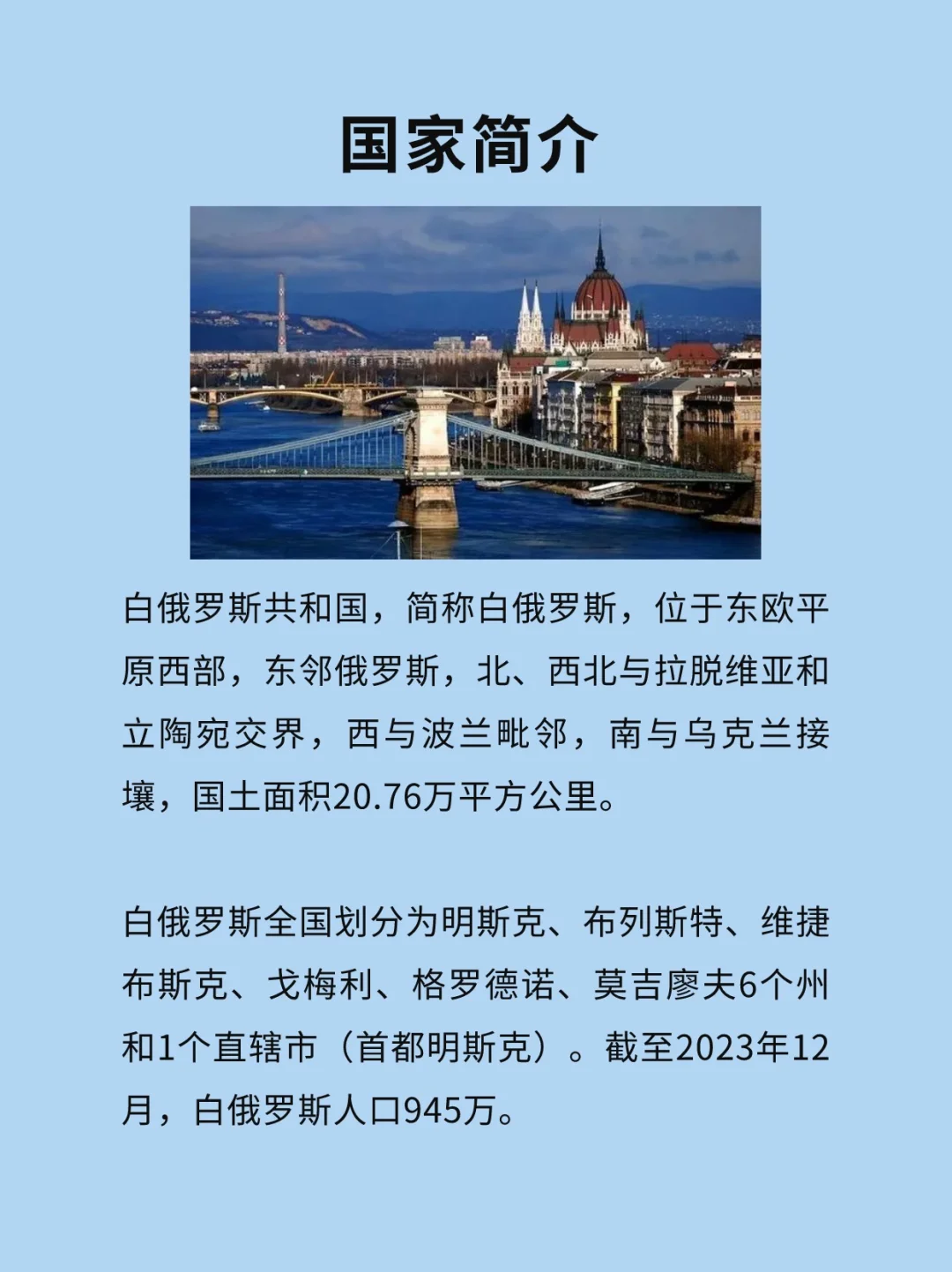 [打卡R]白俄罗斯共和国,简称白俄罗斯,位于东欧平原西部,东邻俄罗斯,北、西北与拉脱维亚和立陶宛交界,西与波兰毗邻,南与乌克兰接壤,国土面积20.76万平方公里。 [彩虹R]白俄罗斯全国划分为明斯克、布列斯特、维捷布斯克、戈梅利、格罗德诺、莫吉廖夫6个州和1个直辖市(首都明斯克)。截至2023年12月,白俄罗斯人口945万。