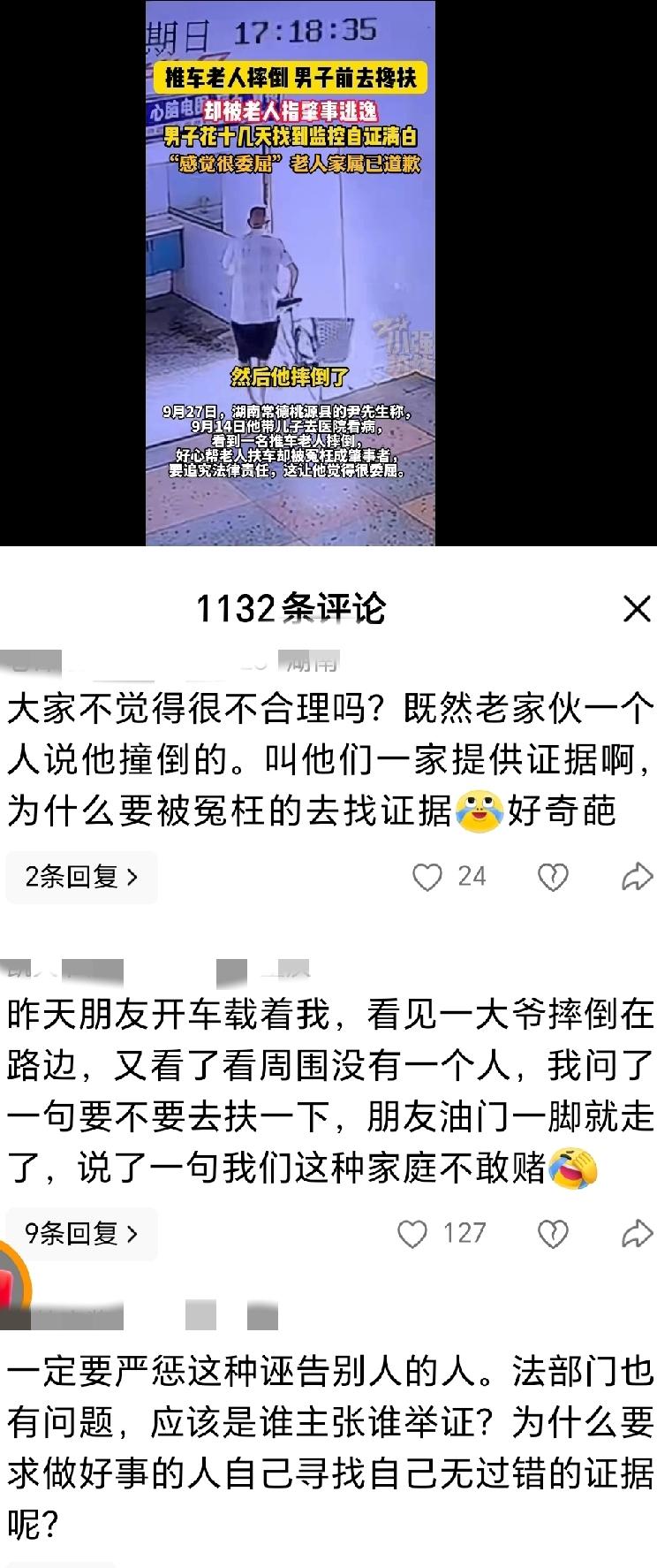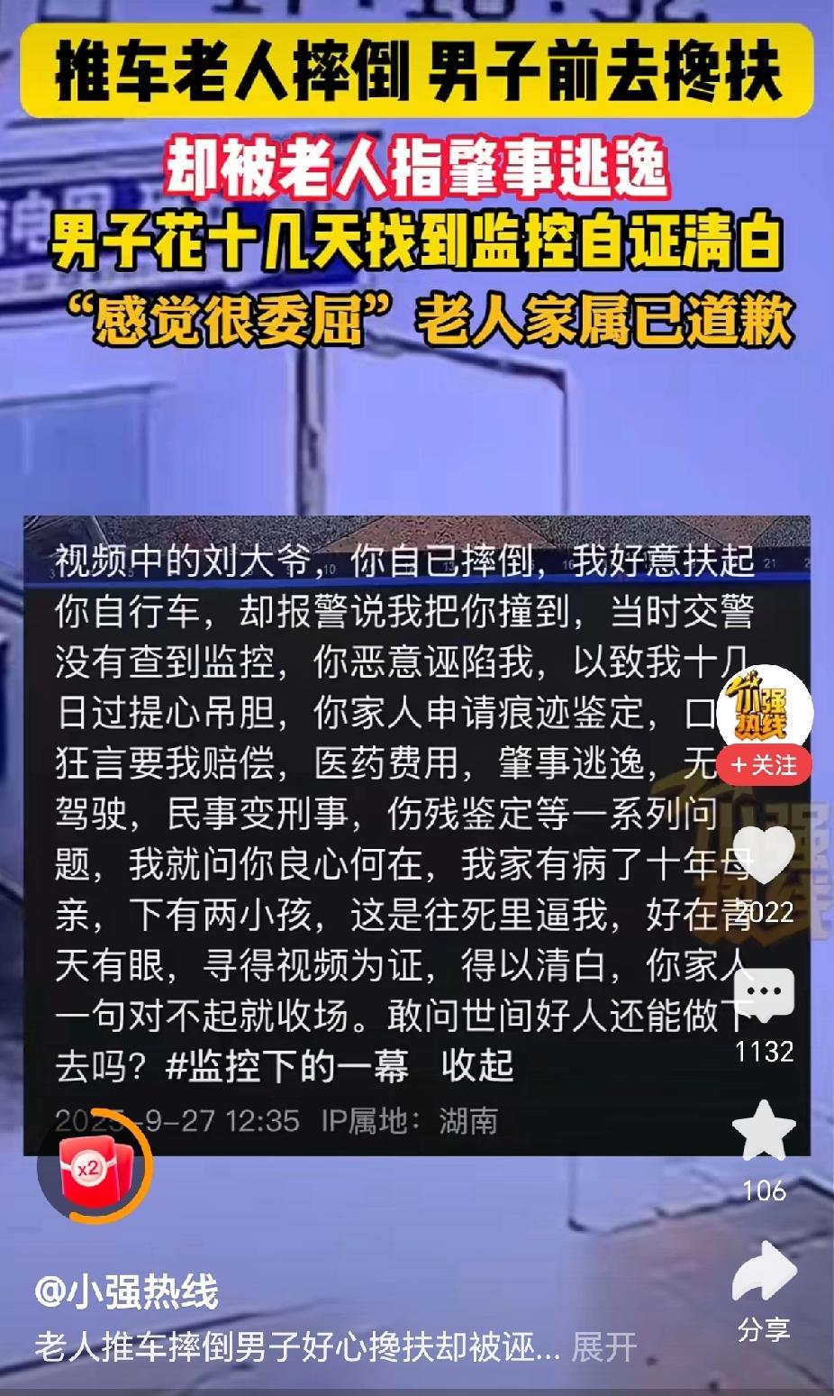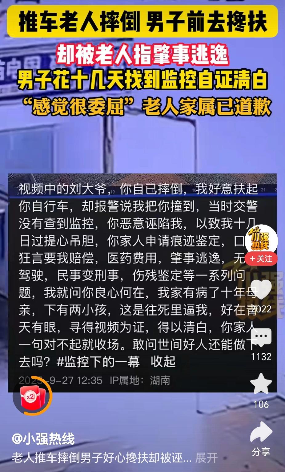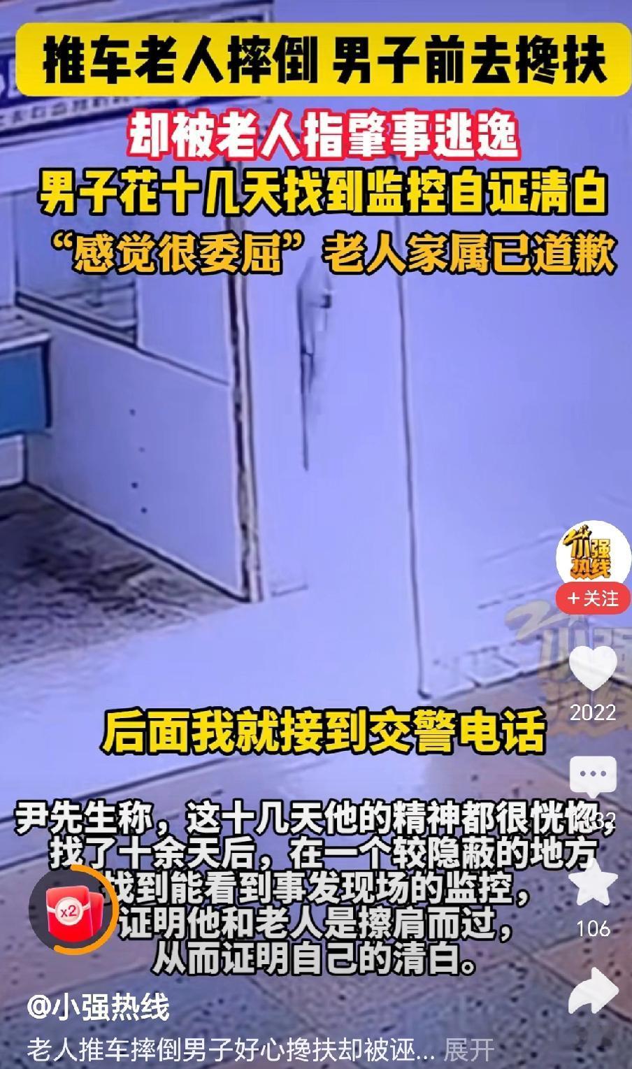 “清白了,男子找到监控视频,证实自己没有撞到老人!”近日,湖南常德,男子好心去搀