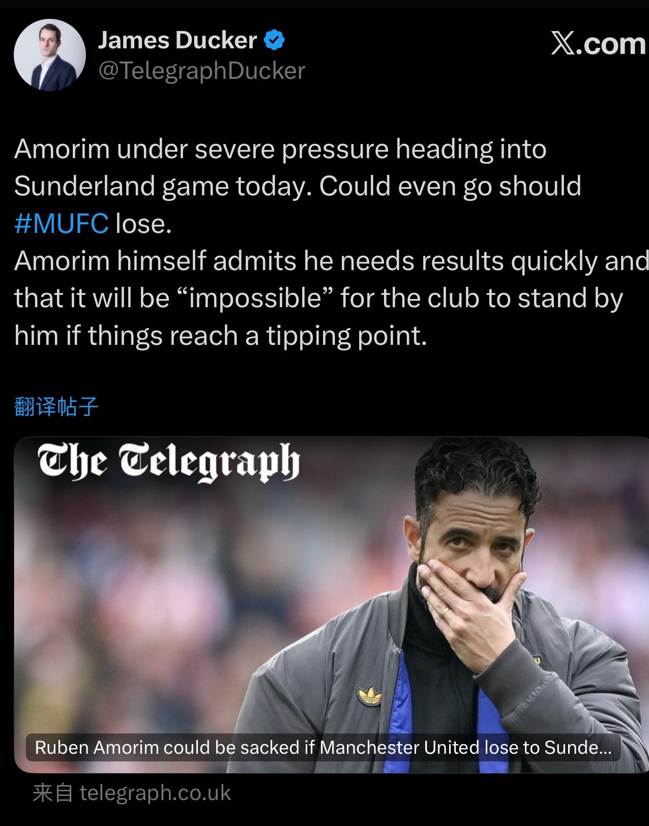 电讯报鸭子哥: 如果输给桑德兰阿莫林有可能不保