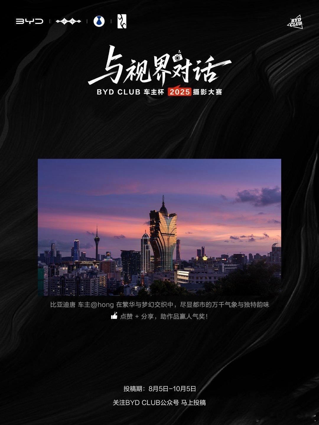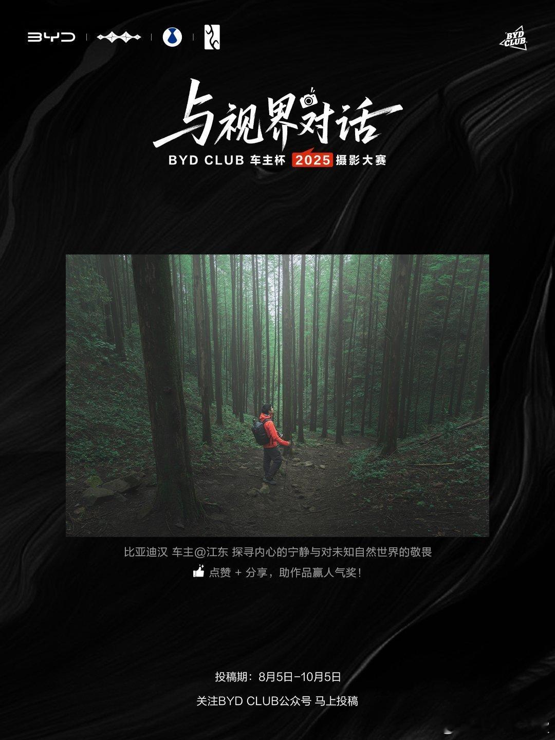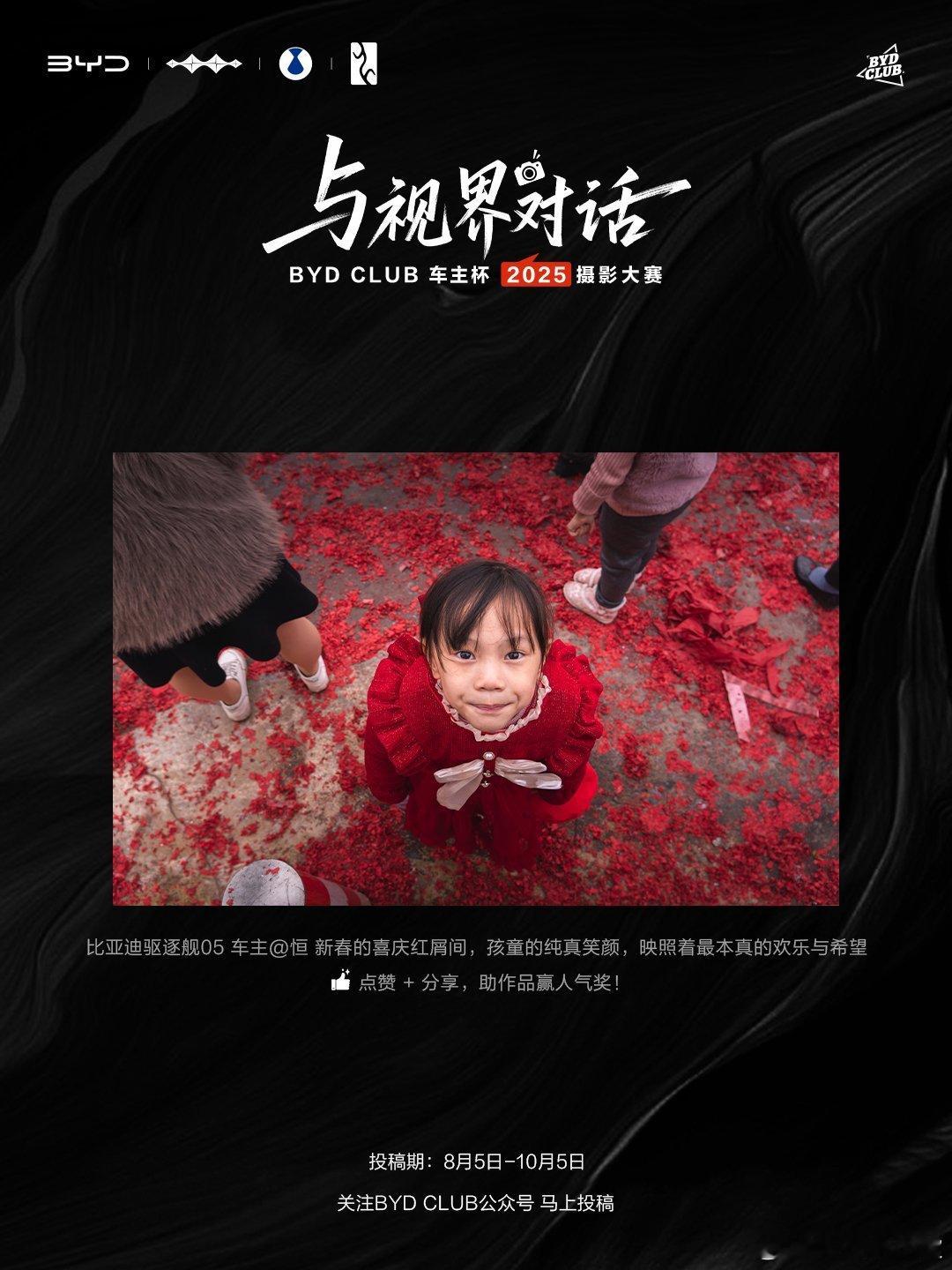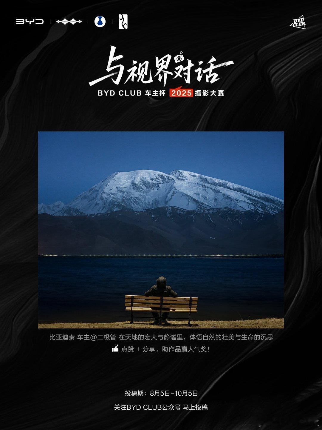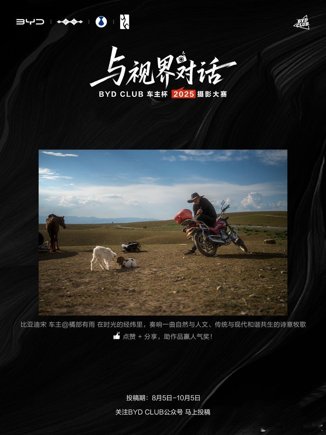 有山川湖海的壮阔风光,有日常里的温情瞬间,每幅作品都藏着车主们的出行故事与生活热爱,看一眼就忍不住被画面里的真诚打动。10月5日前投稿,用光影记录你的出行瞬间、日常美好,带大家看见你的专属视界吧~与视界对话比亚迪摄影大赛
