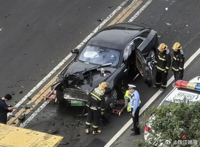 现场照片显示,一辆劳斯莱斯闪灵轿车停在公路上,车身损毁严重,安全气囊弹出。车外人员疑似知名车评人陈震。记者对比该车的车牌号,与此前媒体曝光的车评人陈震车辆为同一号牌。有网友称,该事故发生在万寿路。