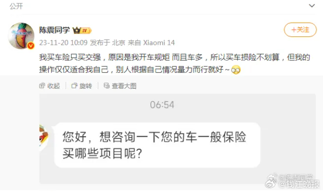记者查询发现,陈震2023年曾在微博发文称自己买车险只买交强险,原因是自己开车规矩而且车多,所以买车损险不划算。