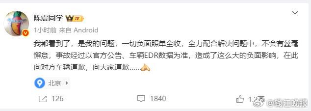 【#陈震致歉#:是我的问题,一切负面照单全收,全力配合解决问题中】#陈震称以车辆EDR数据通告为准# 10月4日下午,发文就车祸事件道歉:我都看到了,是我的问题,一切负面照单全收,全力配合解决问题中,不会有丝毫懈怠,事故经过以官方公告、车辆EDR数据为准,造成了这么大的负面影响,在此向对方车辆道歉,向大家道歉……