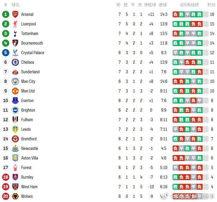 最新积分榜:利物浦输球本轮被阿森纳反超