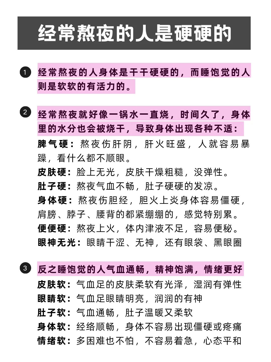 经常熬夜的人身体是干干硬硬的,而睡饱觉的人则是软软的有活力的。 经常熬夜就好像一锅水一直烧,时间久了,身体里的水分也会被烧干,导致身体出现各种不适。 而睡饱觉的人气血更通畅,精神饱满,情绪更好,身体也棒,所以为了健康能不熬夜就别熬夜,早点睡,晚安~