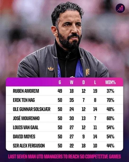 弗格森爵士之后的曼联主帅前50场战绩:滕哈赫35胜7平8负胜率70%穆里尼