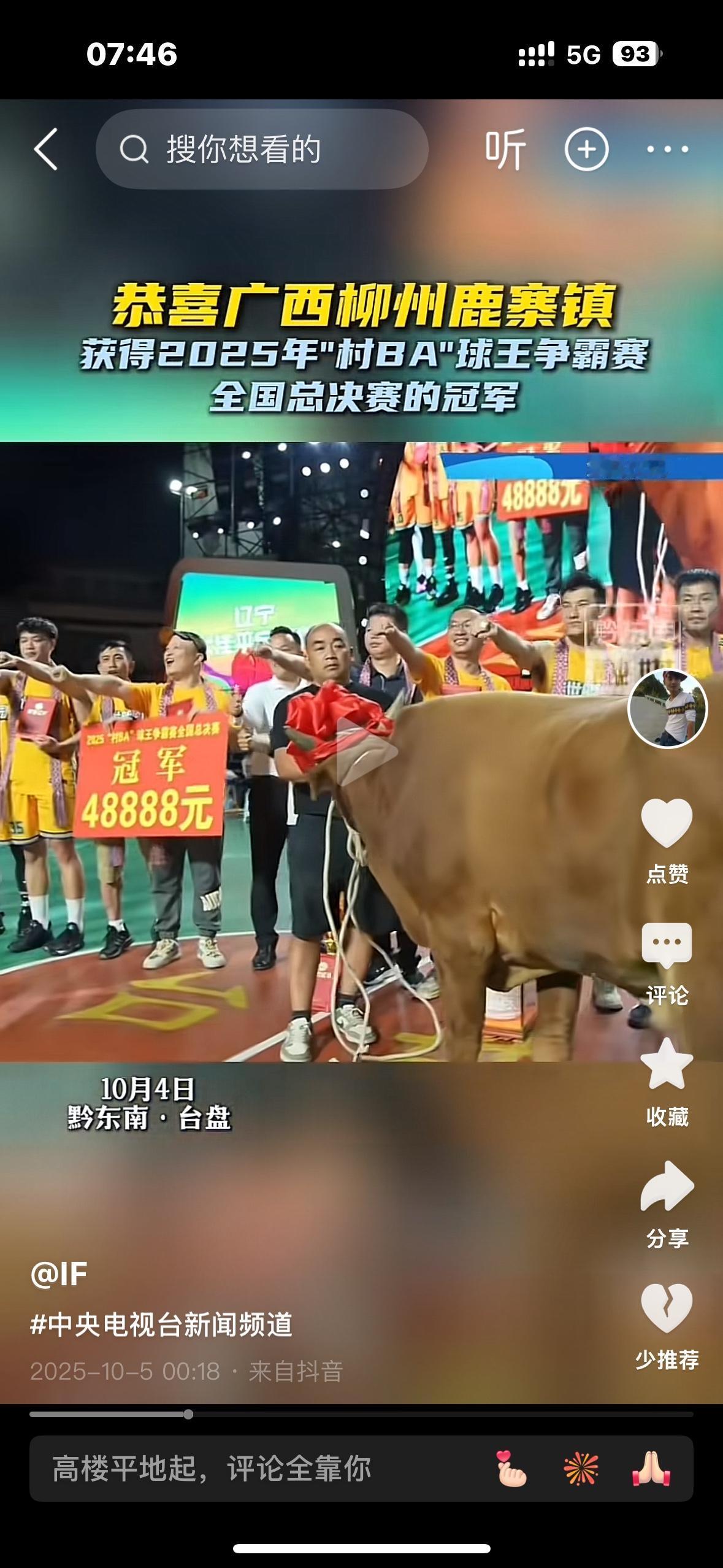 10月4日晚,备受瞩目的2025年“村BA”球王争霸赛全国总决赛在贵州台江县台盘村打响,巅峰对决是由柳州鹿寨镇队对阵辽宁大洼平安锦旭队,全国球迷欣赏到一场精彩绝伦的篮球赛,经过四节激烈的比拼,柳州鹿寨镇队以83:67拿下了比赛,成功登顶2025年“村BA”球王争霸赛全国总决赛的冠军宝座。让我们一起祝贺广西队吧!