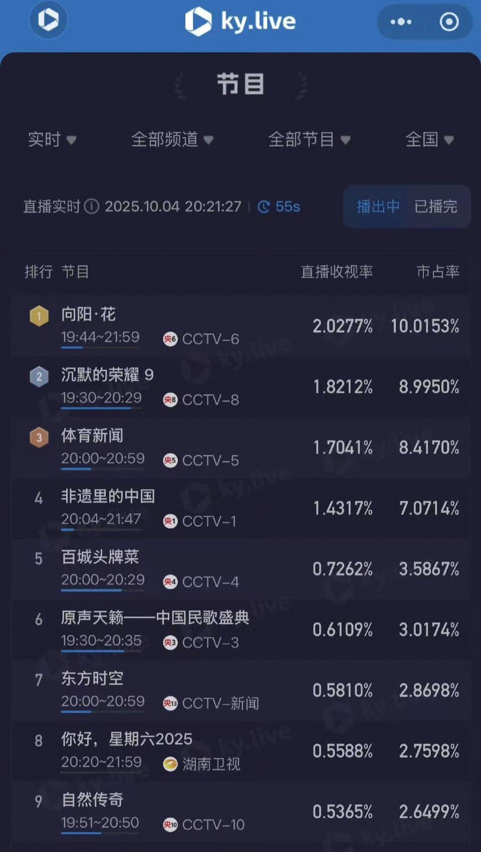近日,CCTV-6电影频道播出冯小刚执导,赵丽颖、兰西雅、啜妮、王菊、程潇等演员主演的电影《向阳·花》,赢得观众喜爱与好评。[礼物] 据酷云数娱ky_live 数据显示,该片实时直播收视率破2%,位列全频道第一位。 不得不说,赵丽颖《向阳花》里的演技,真的很惊艳![小鼓掌]