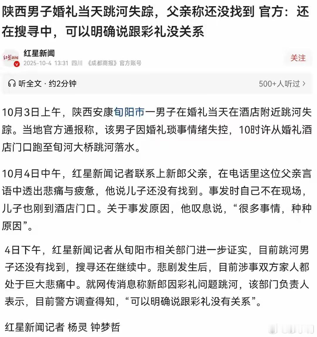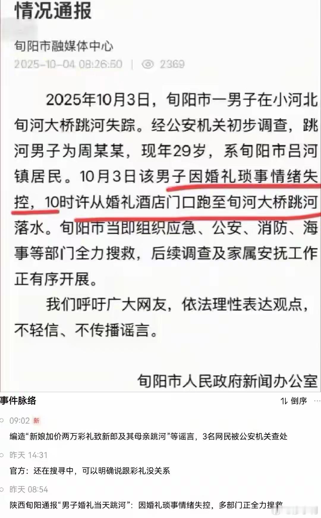 旬阳警方辟谣新郎母亲跳江现在看来当地官方的第一篇通报是失败的,仅仅一句“因婚礼琐