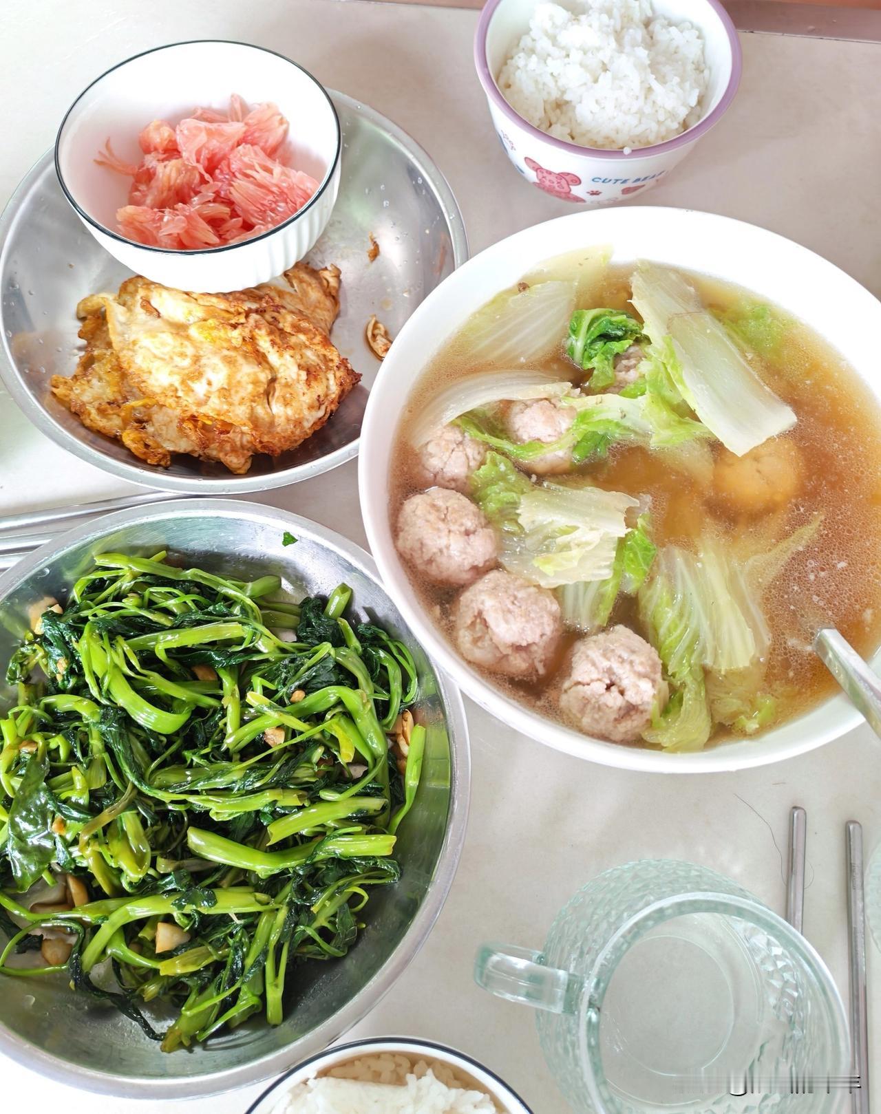 这样的家常菜,吃一辈子都不腻! 家人们谁懂啊!就这一桌普普通通的家常菜,愣是把我吃感动了![呲牙][呲牙][呲牙][呲牙] 你看这青菜肉丸汤,肉丸弹牙入味,白菜吸饱了汤汁,喝一口暖到心窝里;炒空心菜脆生生的,蒜香十足,配米饭绝绝子;还有这煎蛋,焦香焦香的,咬一口滋滋冒油;饭后再来碗红柚,酸甜解腻,完美! 没有花里胡哨的摆盘,也不是山珍海味,但就是这种家常的烟火气,才最抚凡人心。每天下班回家,能吃到这么一桌热乎菜,日子再平淡也有滋有味!你们家最常做的家常菜是啥?快来评论区晒晒,让我羡慕一下!