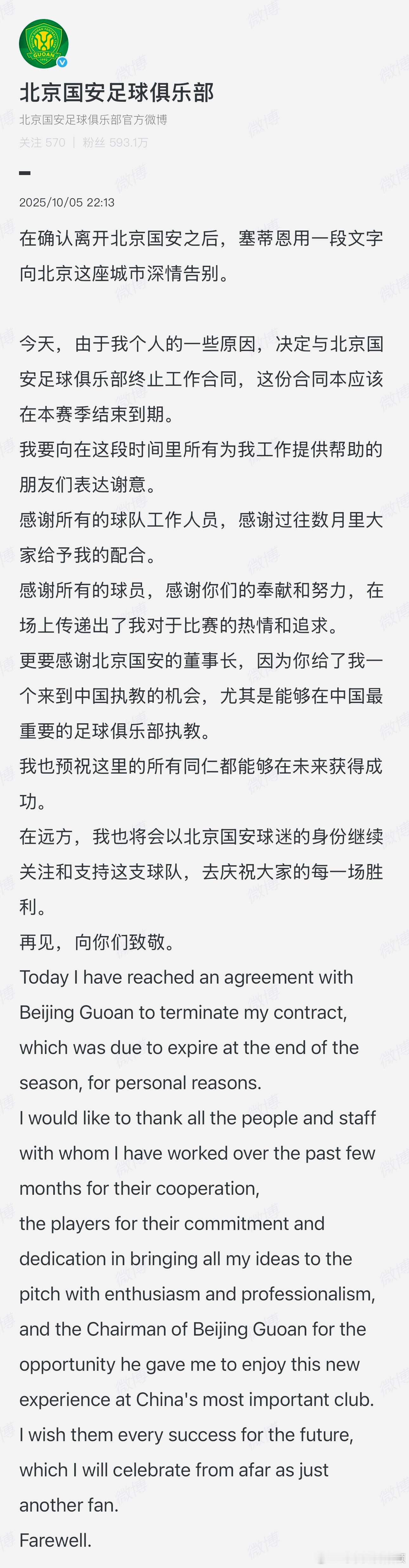 塞蒂恩没把一个中超赛季坚持完。国安还有个足协杯争冠的事儿得拼一把。