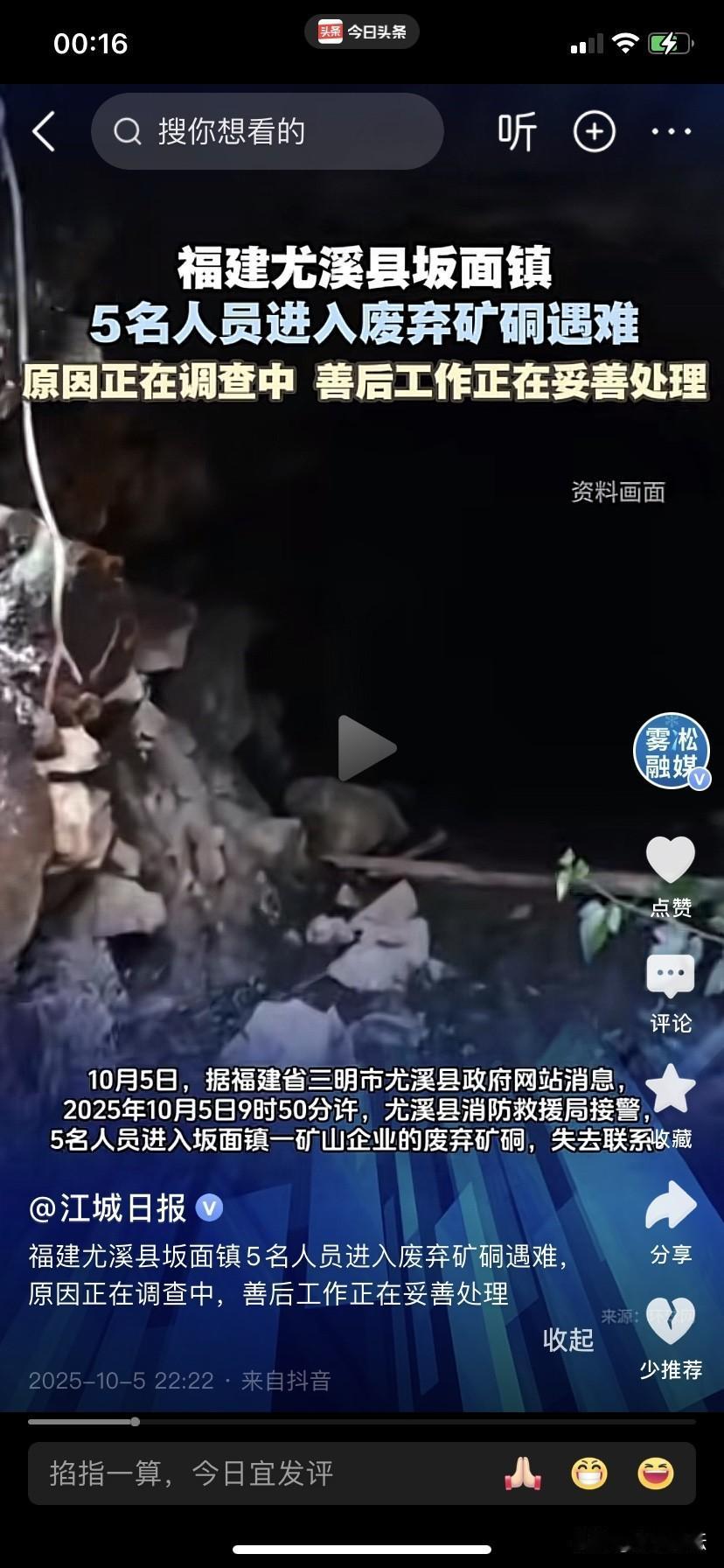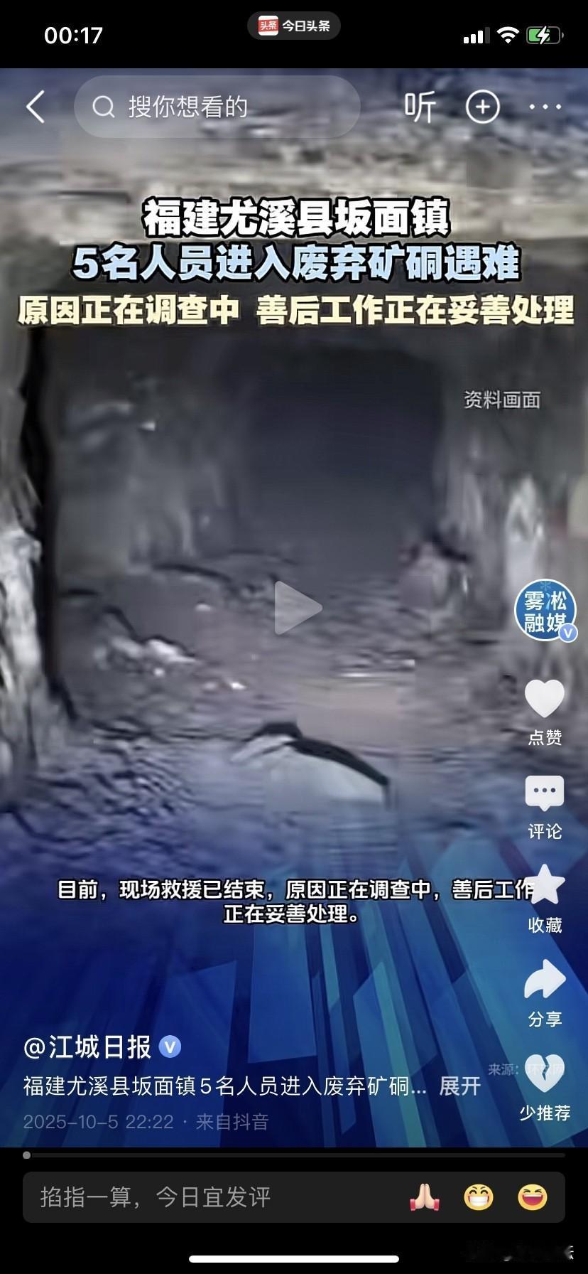 太无知了,5名村民私自进矿硐遇难 中秋将至,在福建省龙溪县板面却发生了一起悲剧,有五名外地村民私自闯入一处废弃的矿硐导致中毒身亡。 2025年10月6日上午9:50许,福建省三明市接到群众报警称:有五名人员进入了龙溪县版面一处废弃矿硐后失联。接警后,消防救援人员第一次时间赶赴现场,找到了五名失联人员并紧急送医救治,到下午15:00许,医院宣布抢救无效死亡。画面看到事发地井口有安全警示牌。 提示:在开采矿洞过程中会产生粉尘,还会产生如一氧化氮,二氧化氮,硫化氢等有毒气体。为了自己的安全千万不要冒然进入不明洞口捡不明物品,以免发生中毒事件。原企业负责人应该将废弃矿硐口封死,以免无知者闯入引发悲剧。 目前,事故原因正在调查中。