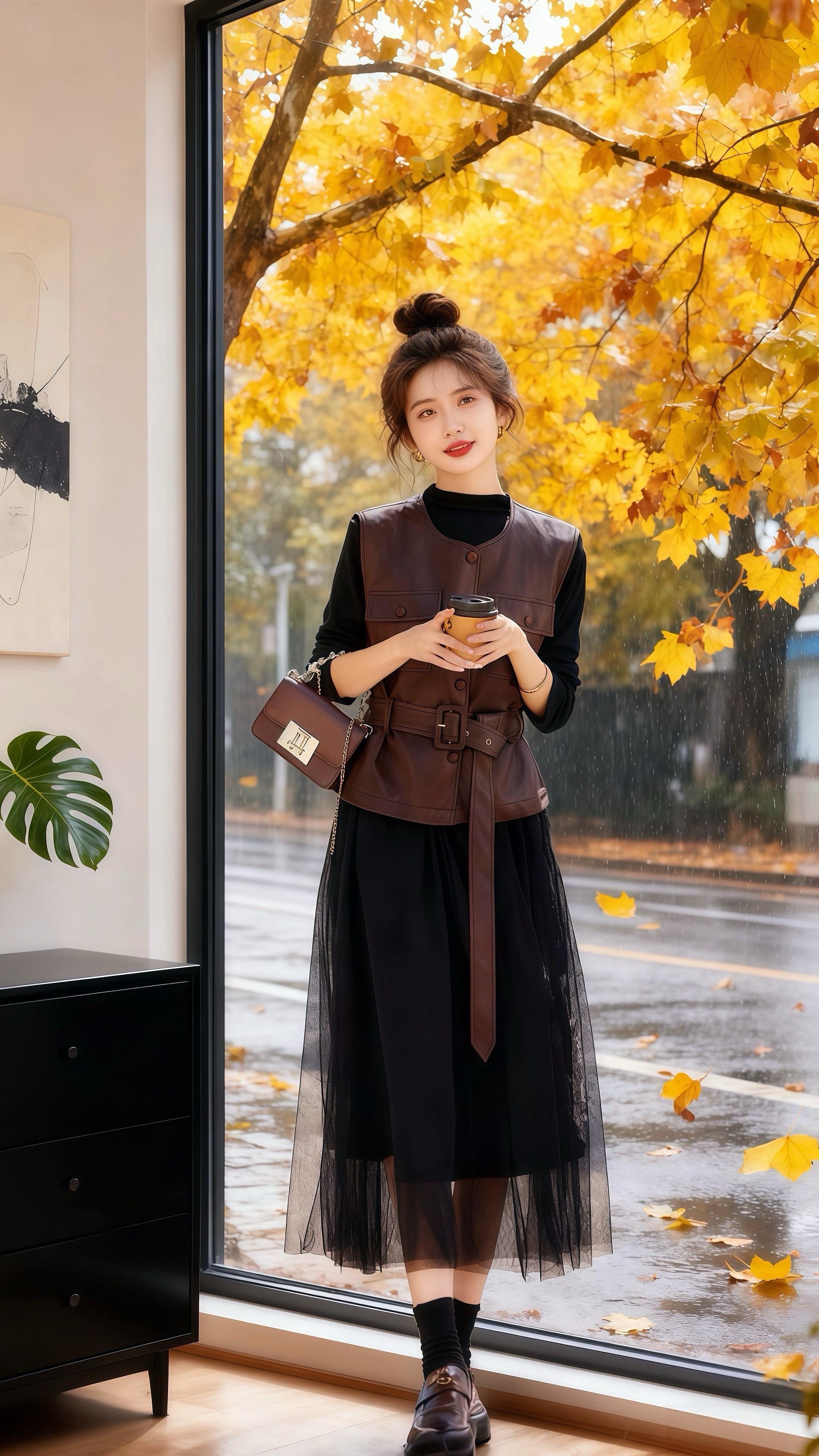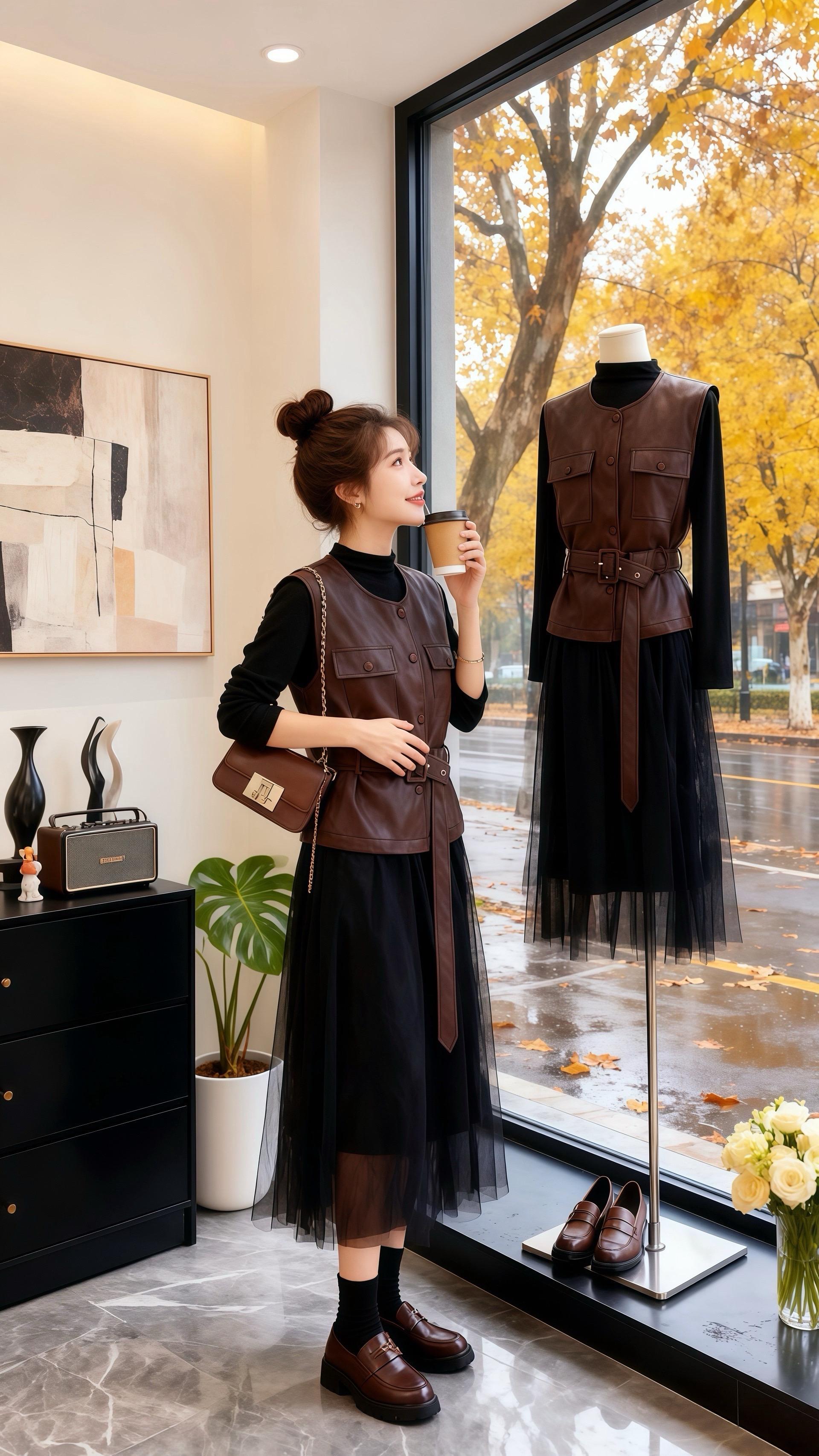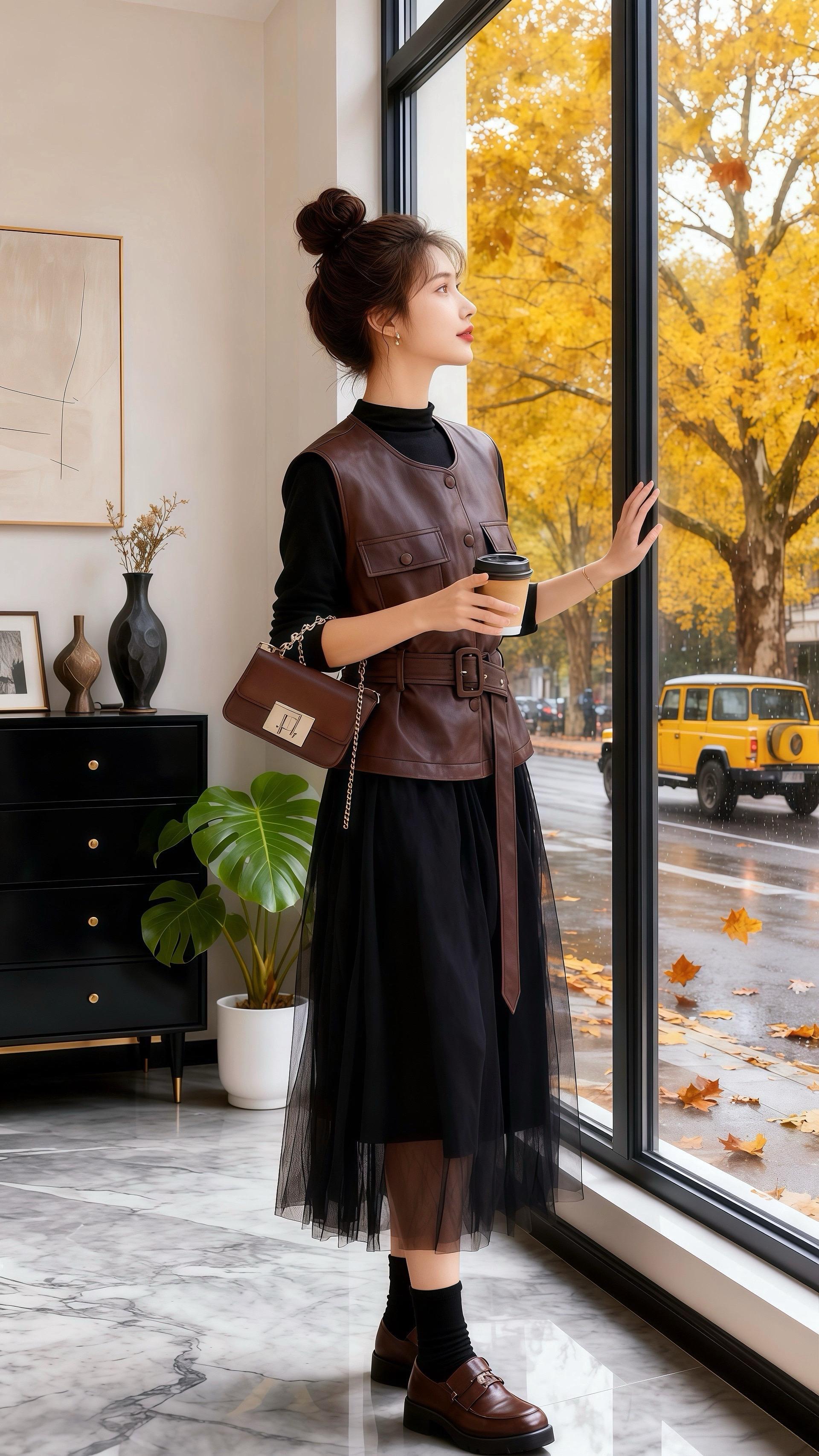 秋日的午后,许妍在自己的服装工作室里,身着棕色皮马甲搭配黑色网纱裙,正望着窗外金黄的梧桐叶出神。