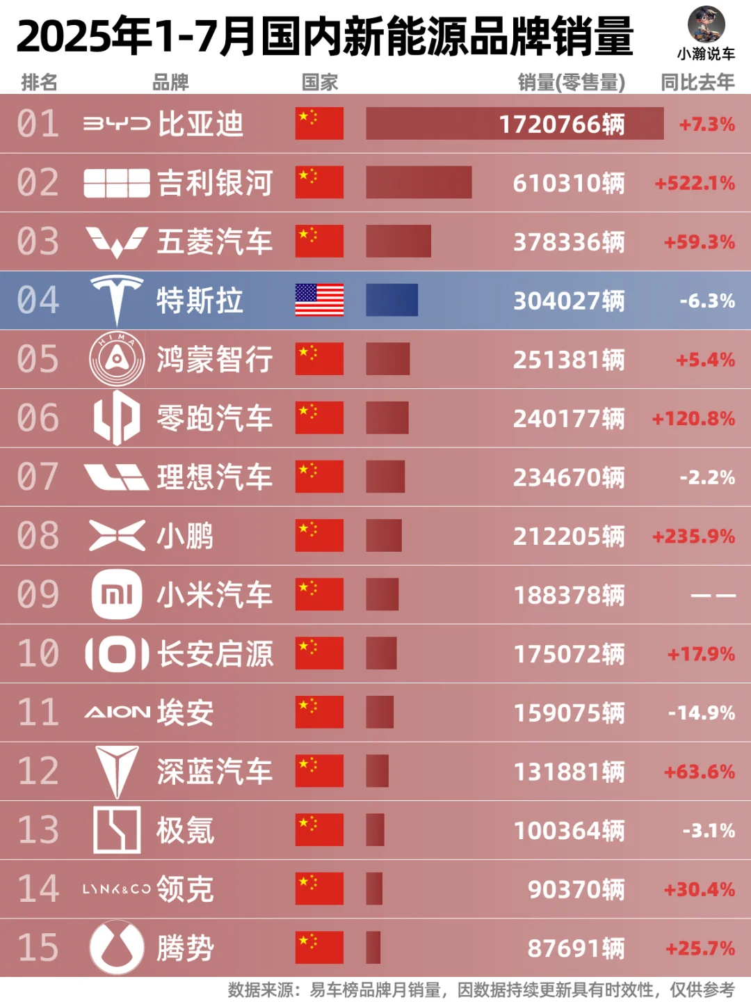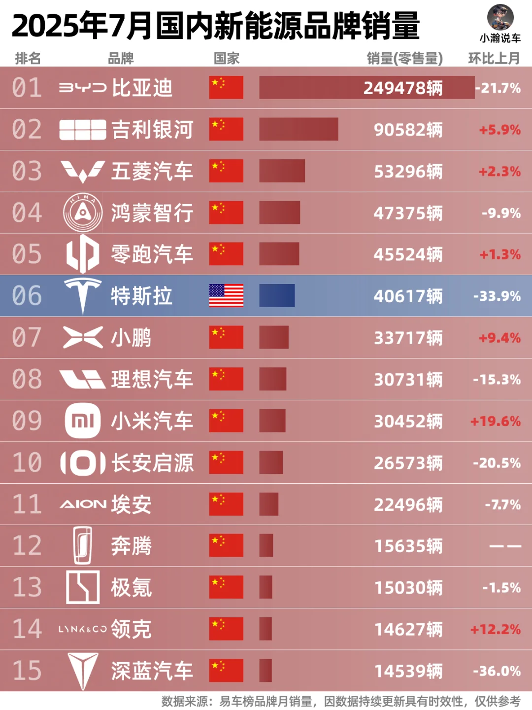🌟 新能源榜仍是一片中国红!独苗特斯拉销量环比亦下跌超30%, 这与本月交付量突破3万辆的小米汽车或存在关联。纵观全年,吉利银河、小鹏、零跑增长势头强劲,而理想、极氪这两个去年表现优异的国产豪华品牌,当前均略显乏力。未来究竟是新锐势力崛起主导,还是定位高端的国产新势力重回巅峰? 下半年让我们共同期待!