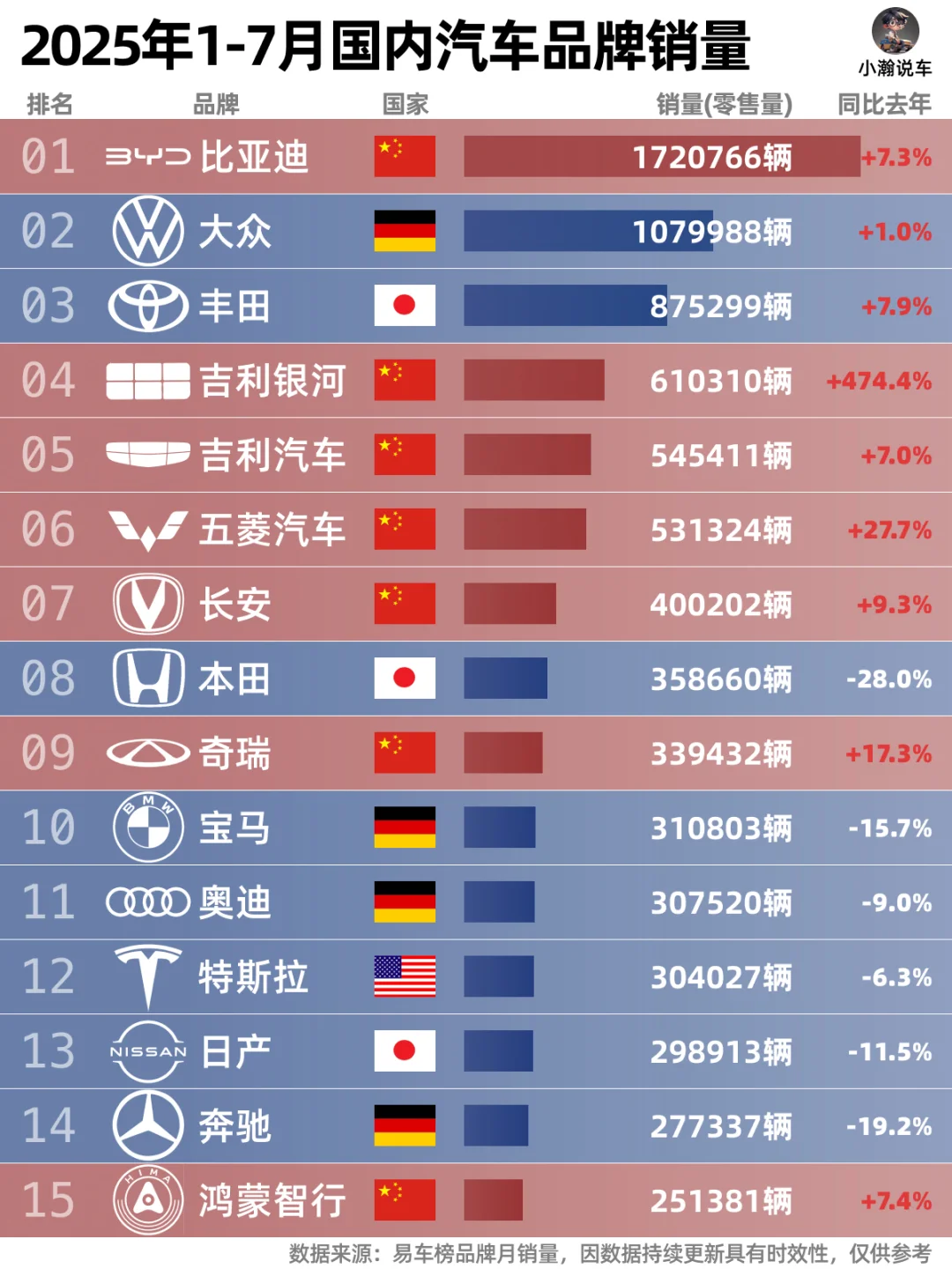 7月汽车销量 汽车销量排行榜 合资品牌 国产品牌 比亚迪销量 特斯拉 小米 造车新势力 比亚迪今年还能完成销量目标吗 [PK]
