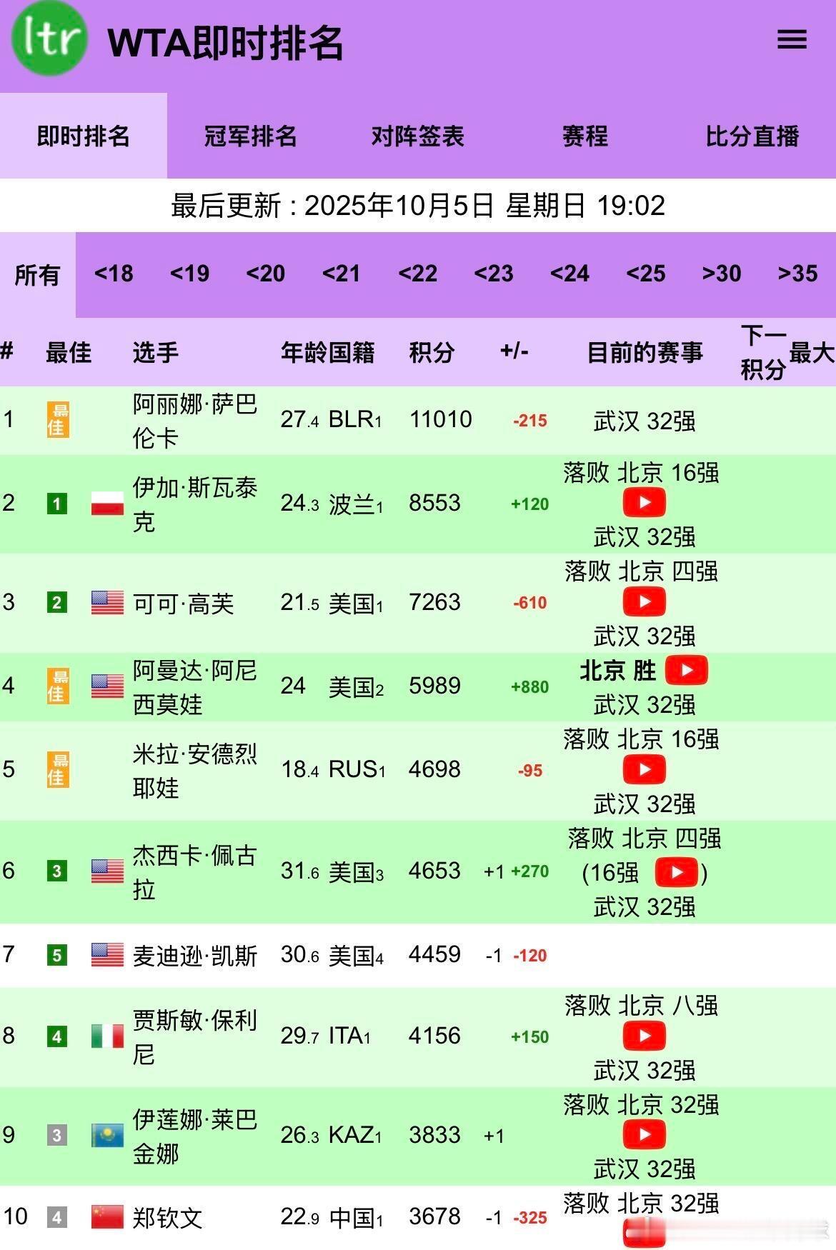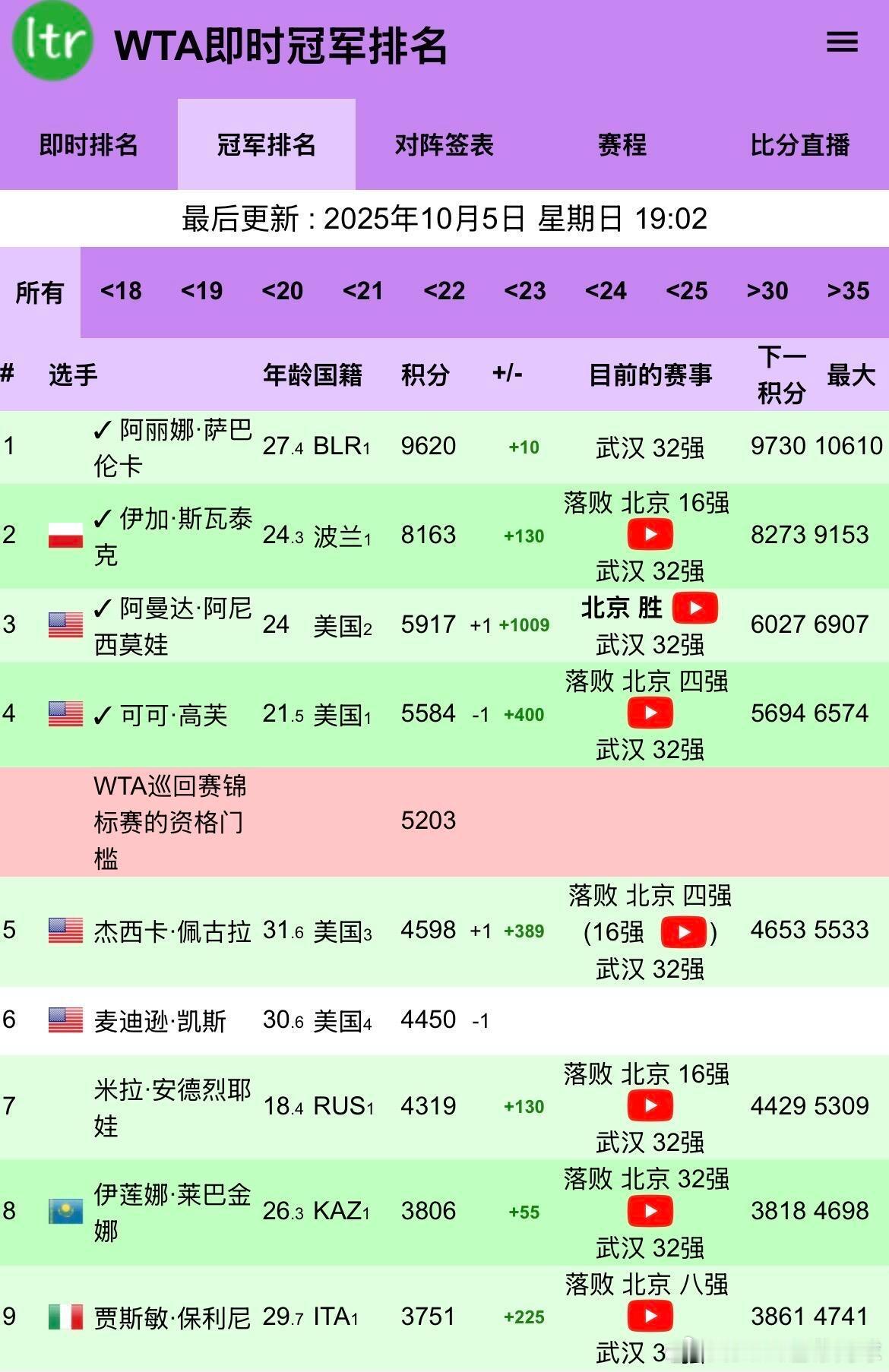 💥 WTA即时冠军排名第三位 ✅,即时排名稳定在前4️⃣;