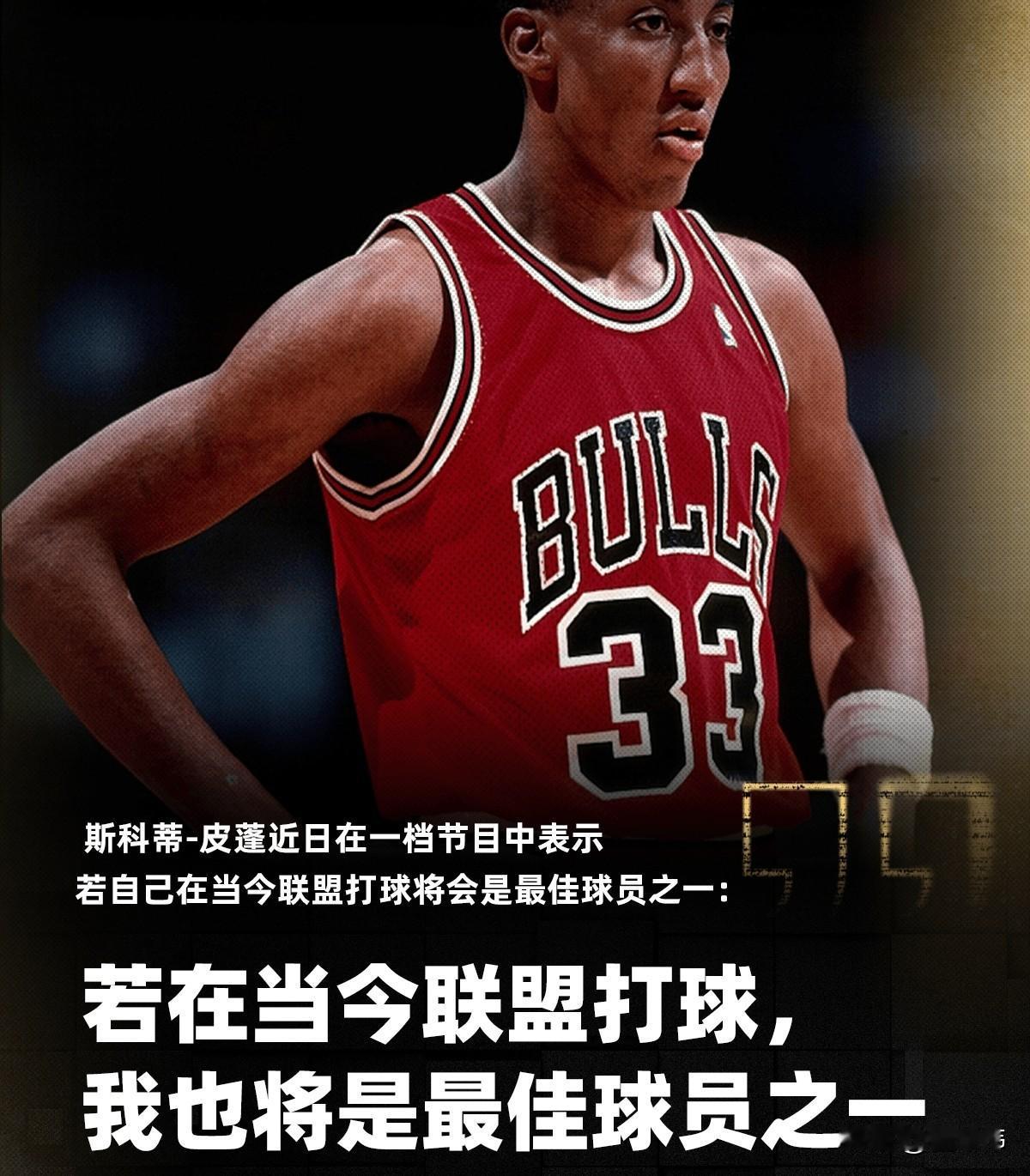 你认同吗?皮蓬在节目中表示,如果他在现在这个时代打球,他会是最佳球员之一! 皮蓬作为乔丹身边顶级帮手,职业生涯六夺总冠军,是最为出色的二当家! 但是,在离开乔丹之后,皮蓬并没有证明自己带队能力,带队成绩一塌糊涂! 职业生涯,皮蓬场均可以得到16.1分6.4篮板5.2助攻! 入选3次最佳一阵,2次最佳二阵,2次最佳三阵,8次最佳防守一阵,2次最佳防守二阵! 皮蓬如果在这个时代打球,依旧会是非常出色的球星,但是,他的特点,还是适合成为二当家! 皮蓬需要有乔丹这样的绝对强点,二人互相成就,但是如果让皮蓬一个人带队,那还是不行! 你觉得,皮蓬在如今这个联盟,能够达成怎样的成就?