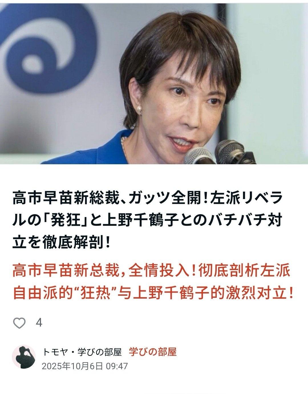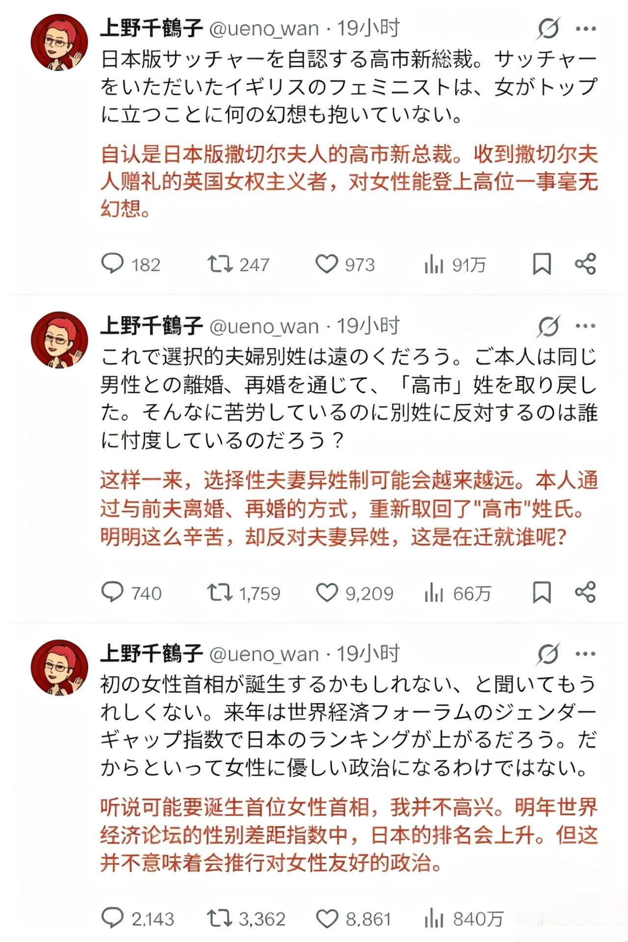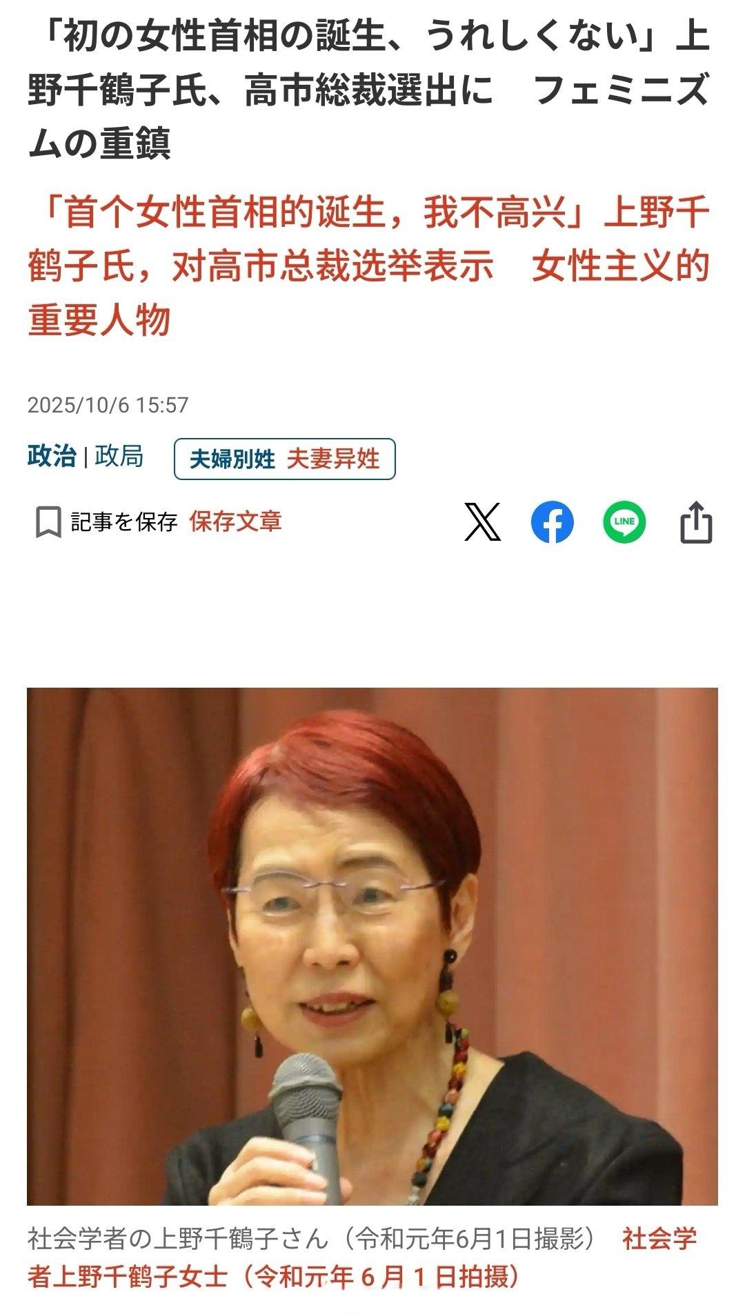 一根筋变成两头堵?日本某拳代表人物上野千鹤子猛烈攻击高市早苗,对日本产生首位女首相表示不满! 精彩!日本开始内讧了 上野千鹤子怒批高市早苗! 高市早苗2004年第一次结婚时,她随夫姓改叫“山本早苗”,2017年离婚后,恢复本姓“高市早苗”,等到2021年复婚,这次轮到丈夫改姓“高市”了。 所以上野千鹤子就认为,你高市早苗自己都是这样的状况,身为女性领导人,却仍在反对允许夫妻婚后保留本姓或是自由选择姓氏的制度。 她质疑这种立场是"揣测男性保守群体意图",有助于她巩固党内保守派的支持基础。上台后若不改变,将使得日本社会的性别平等改革开倒车!!! 我直接吃瓜看戏,要我说,最好把脑子打出来。[狗头]
