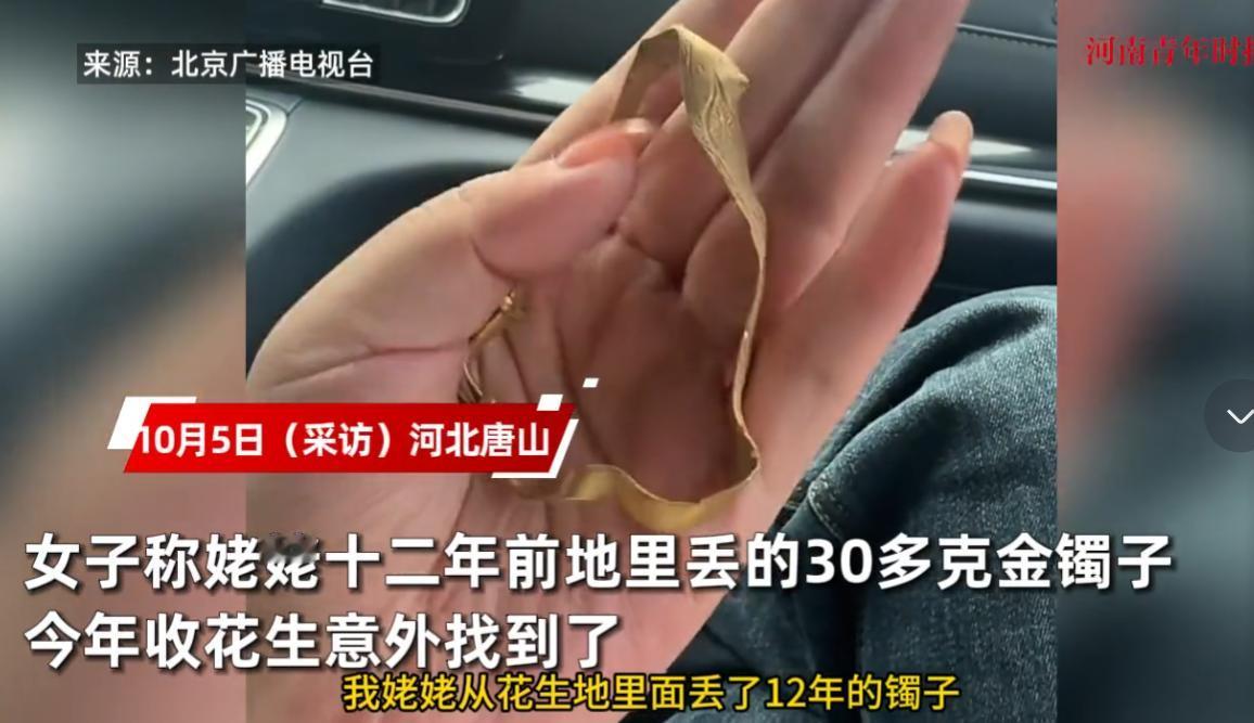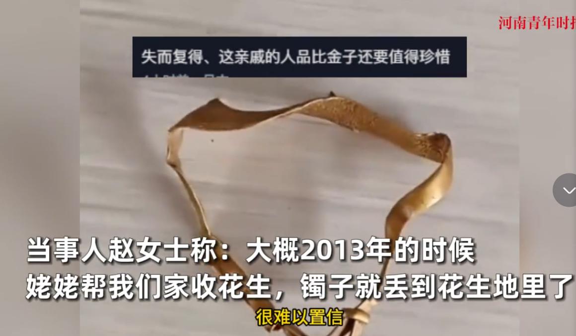“这就是命啊!”10月5日,河北唐山,一女子亲戚挖花生时竟然挖到了30多克的大金镯子,折合人民币3万余元,这个金镯子是女子姥姥12年前在地里遗失的,亲戚挖到金镯子后赶紧交给了女子,网友:躺地里十多年,身价涨了17700元! 几乎没有女性不喜欢金首饰,金光闪闪给人一种富贵华丽的感觉,可金价现如今越来越高,那些早年间买了不少金子的人可是赚大发了。 一女子姥姥在女子家地里帮忙刨花生时,不慎将自己30多克的大金镯子弄丢了,前前后后找了很多次都没有见到金镯子的踪影,虽然着急,可也只能认栽。 转眼十多年过去了,这块地送给了女子家亲戚种,一家人早就把金镯子的事情忘得一干二净,谁知,前几天亲戚收花生时,竟意外挖到了一个大金镯子,他赶忙交给了女子。 这个金镯子早已经扭曲变形,但上面的图案依稀能辨认出这是女子姥姥的金手镯,失而复得让女子一家十分高兴,而且大金镯子在地里躺了十多年,身价还翻了好几番。 不少网友表示,和金子相比,亲戚的人品更加宝贵,如果亲戚自己昧下金镯子,女子一家也不会知道,但他还是选择了交还金镯子,女子家和这个大金镯子还真是有缘,缘分有时确实挺奇妙的! 信息来源:《挖花生挖出30克金镯,女子惊呆:12年前丢的!网友:涨了17700元》
