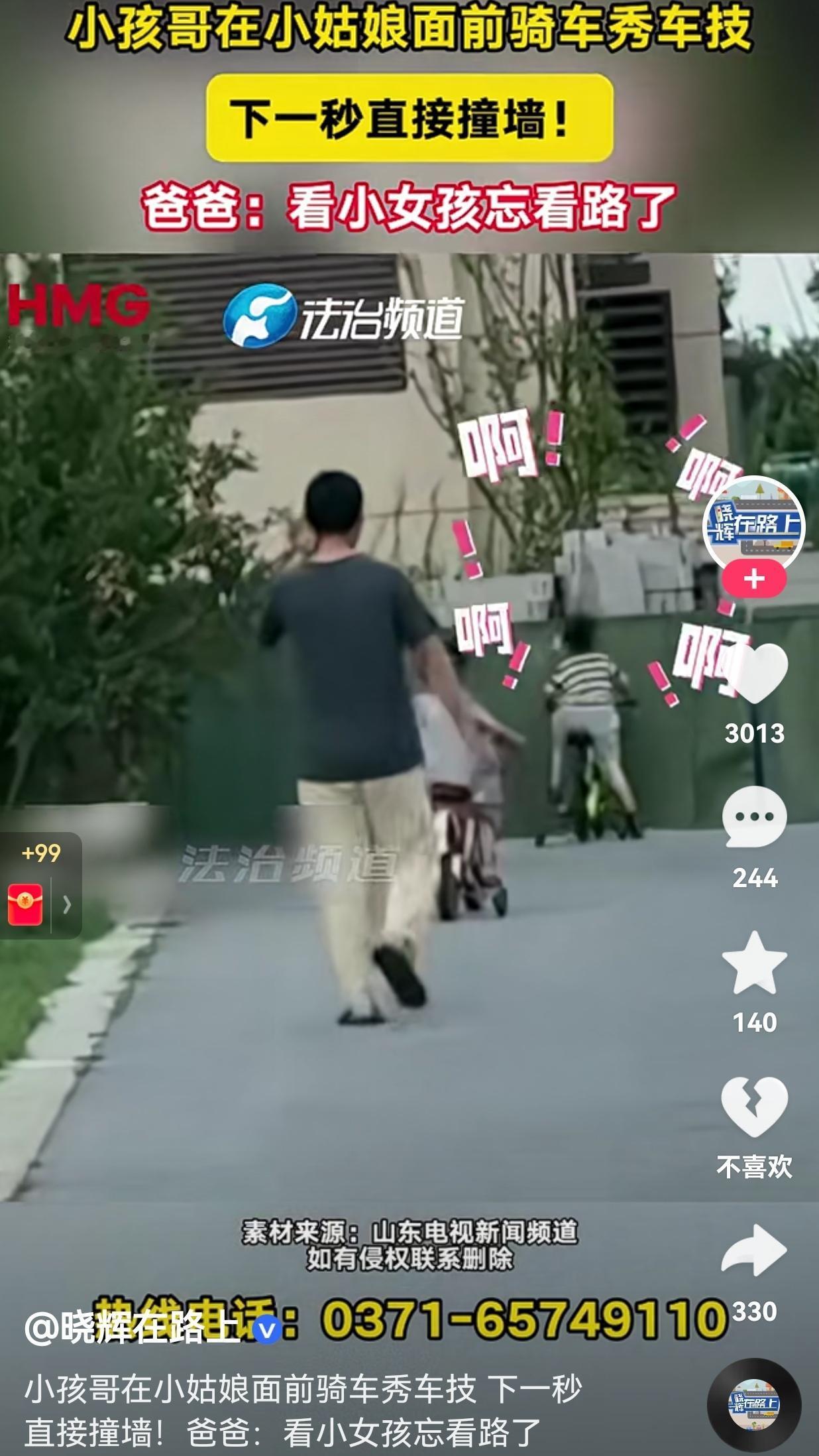 笑不活了!小孩哥骑自行车,看到自己的前方有一个小姑娘也在骑车,心情瞬间开心了。 小孩哥此时此刻想要在小姑娘面前表现一下自己,因此,快速超过小姑娘。 当小孩哥看到小姑娘的容貌后,心里不淡定了!小孩哥心里在想唉呀!怎么这么好看呢?因此,小孩和的注意力一直在小姑娘的身上,也不看路了! 等到小孩哥意识到有危险了,可惜的是已经来不及了,瞬间就撞墙上了! 网友看到后评论说,男人的天性就是喜欢看美女,原来不管什么年龄的男人,都喜欢看美女。 还有的网友说,真的是不撞南墙不回头!这次撞南墙了,下次估计还会看美女。 喜欢看美女很正常,看美女能赏心悦目,心情变美。但是,在路上骑车,还是长点心吧?这也太危险了,如果你想看美女,可以停下车看。 大家觉得呢?欢迎大家评论区讨论留言。