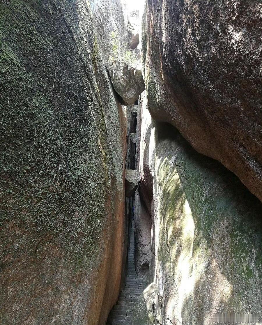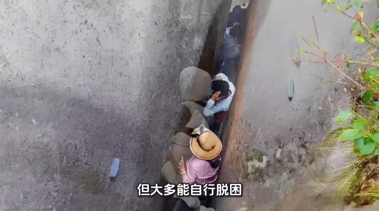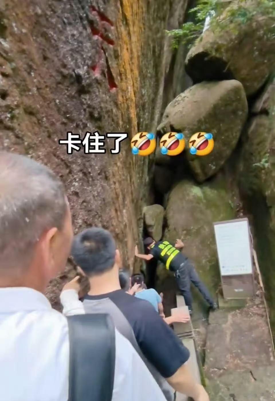 福建太姥山180斤游客被卡石缝这么窄呢,保安大哥还说大哥可能进不去,大哥还逞强说可以,结果卡了吧[允悲]
