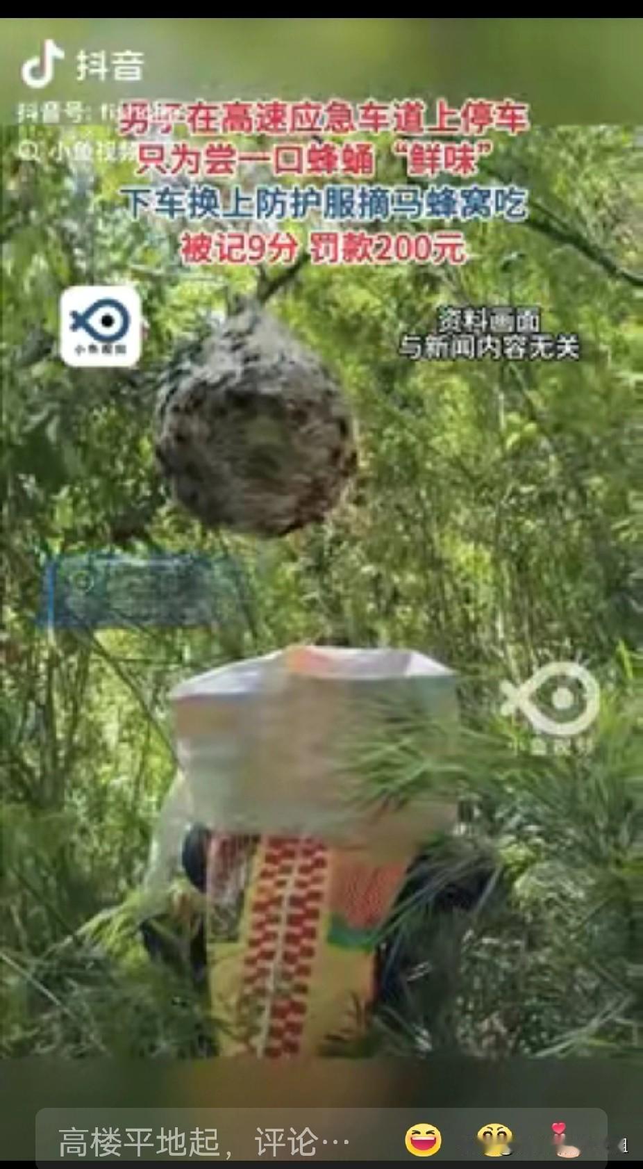 真是个人才!”一男子在高速上开车时,突然在应急车道上停车,直接全身武装换上防护服跑到中间的隔离带,接着爬树去摘马蜂窝,不料很快被交警抓个现行,原来男子处心积虑了很久,就想吃一口蜂蛹尝尝鲜,最终交警给他记了9分,还罚了200元,网友:这是专业找蜂的吧,不管多快都能发现! 这事儿发生在S29临金高速桐庐方向的路段。杭州高速交警八大队民警视频巡查时发现一辆黄色平板拖车突然减速停在应急车道,既没打双闪也没放警示标志。黑衣男子姜某快速下车,瞅准车流空隙翻过护栏冲进中央隔离带,麻利地换上白色防护服,掏出抄网准备摘取马蜂窝。民警立即通知附近警力处置,到达现场后拉响警笛做好安全预警,迅速将男子带离危险区域。 姜某是建德某汽车销售公司的员工,之前因工作路过就留意到隔离带里的马蜂窝,一直惦记蜂蛹的“鲜味”。这次途经时心存侥幸停车“试手”,没想到整个摘蜂窝过程被监控拍得清清楚楚。最终因“非紧急情况下在高速公路应急车道停车”,被依法处以驾驶证记9分、罚款200元的处罚。 高速应急车道被称为生命通道,法律明确规定只有车辆突发故障、发生事故或执行紧急任务的车辆才能使用。姜某为满足口腹之欲擅自占用,还横穿车流翻越护栏,这种操作简直是把高速公路当自家后院。蜂蛹再鲜美也不值得用生命冒险,万一后方车辆避让不及发生追尾,后果根本不是一碗蜂蛹能承担的。 类似占用应急车道的荒唐事还真不少。广西有司机因为衣服脏了想换件干净衣裳,把车停应急道上光膀子换衣服;商丘有位司机觉得天太热,距离服务区不到两公里却非要停在路边脱衣服。这些行为都被处以同样处罚——罚款200元、记9分。说明很多人对应急车道的危险性缺乏基本认知,总觉得“就停一会儿没事儿”。 专业吃货精神用错地方反而暴露了安全意识薄弱。姜某连防护服和抄网都备齐了,说明计划不是一天两天,偏偏忽略了最关键的交通安全。高速交警提醒过无数遍“车靠边、人撤离、即报警”,但总有人觉得意外不会发生在自己身上。要知道高速车速快,应急车道停车不设警示标志,相当于给后方车辆埋下隐形炸弹。 处罚力度引发不同看法。有人认为记9分罚款200元对这种危险行为太轻,应该加重惩戒;也有声音说姜某至少做了安全防护,比完全赤手空拳摘蜂窝的人强。其实处罚不是目的,关键是让当事人和公众明白,任何个人需求都不能凌驾于公共安全之上。蜂蛹再美味也不值得赌上自己和他人的生命安全。 这件事背后藏着更深层的社会心态。现代人追求新鲜刺激没错,但把高风险行为当生活情趣就很危险。类似还有为了拍抖音视频高速停车跳舞、高速公路上摆拍婚纱照的案例。这种“流量至上”“体验至上”的思维正在挑战公共安全底线。倘若人人都为个人喜好随意占用应急通道,生命通道就会变成死亡通道。 各位读者你们怎么看?欢迎在评论区讨论。