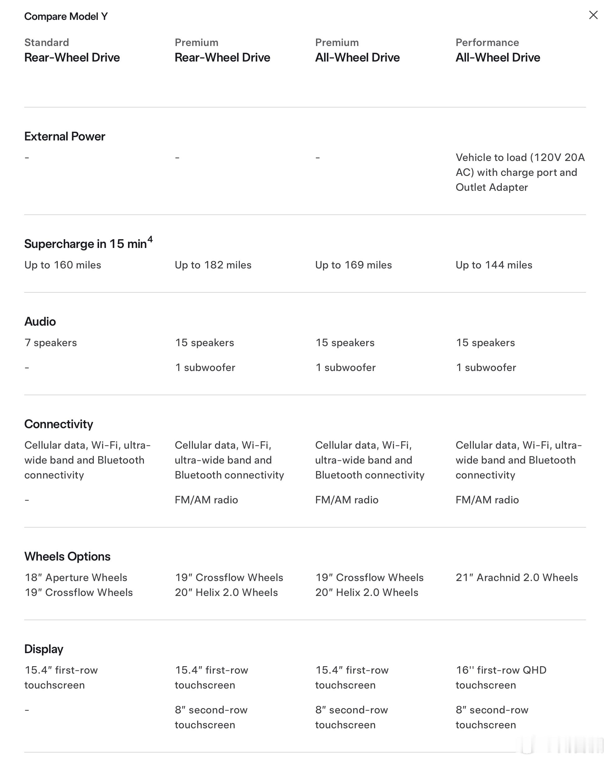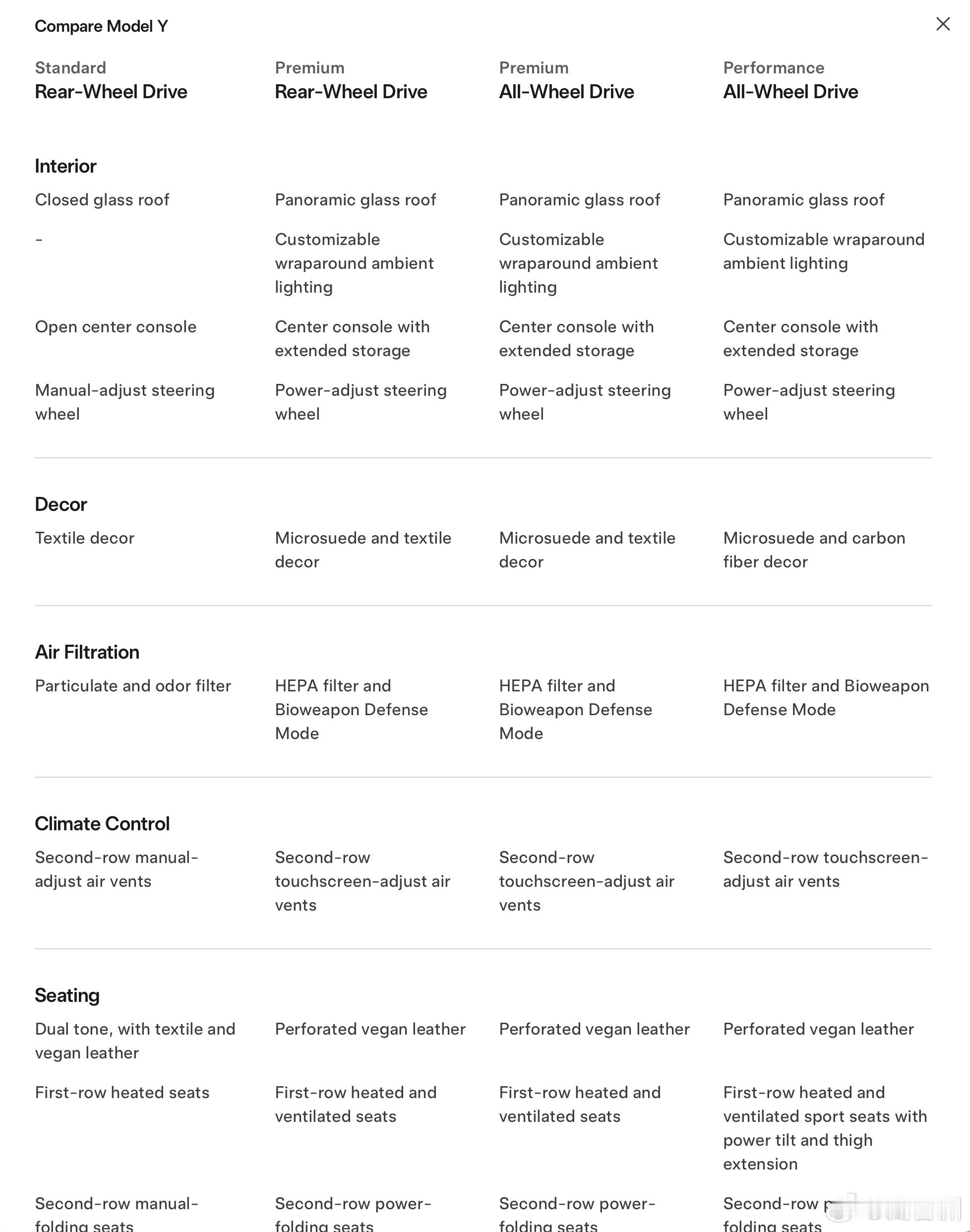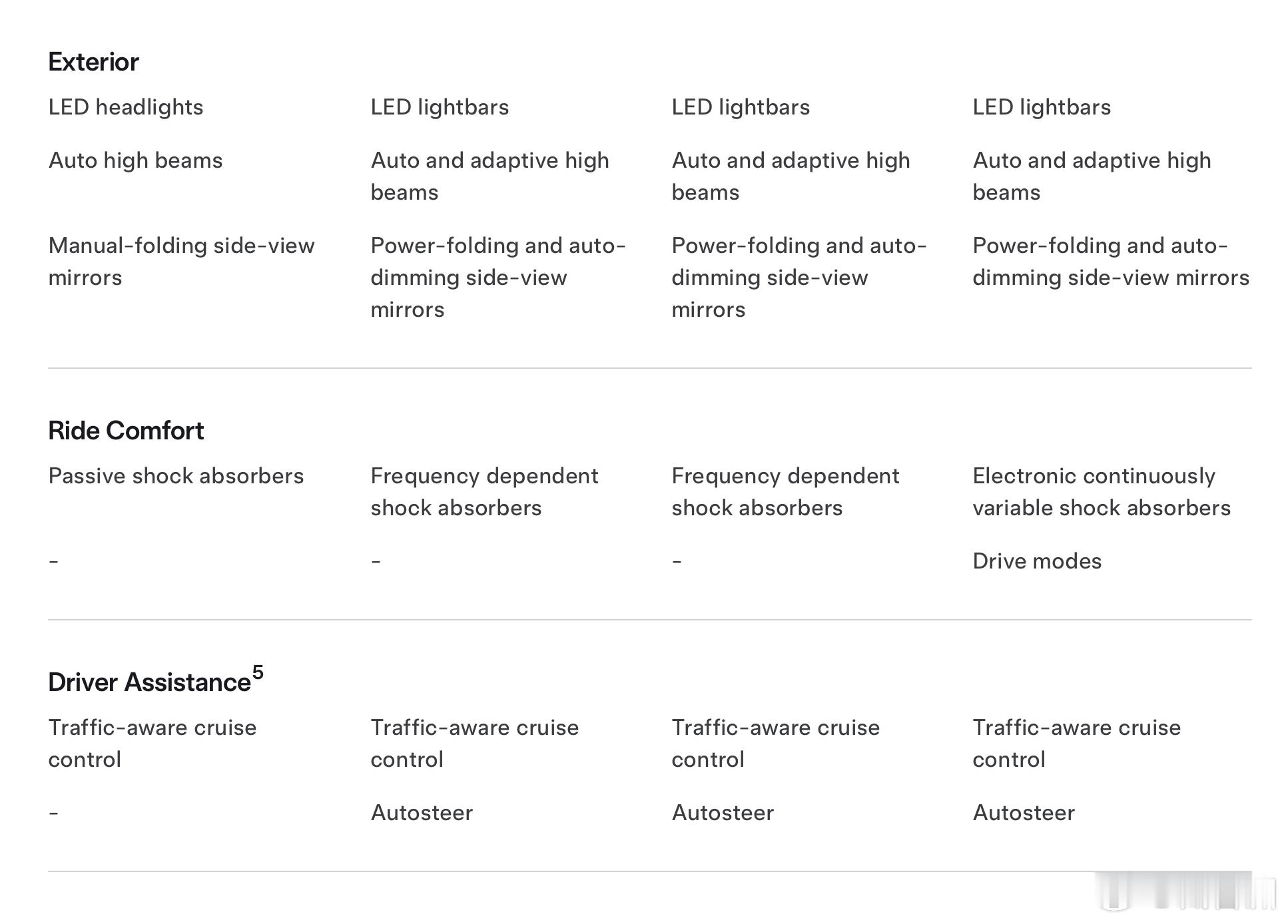 7个扬声器,没收音机(在美国还有点用),18寸轮圈,手动调节方向盘,没有HEPA滤网,二排手动空调,织物素皮座椅,手动后视镜,没有条形行车灯,没有AutoSteer。