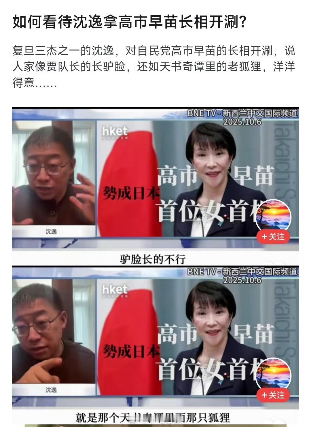 高市早苗否认南京大屠杀沈逸说高市早苗外貌丑陋,很像地下交通站的贾队长和天书奇谈的老狐狸,居然被骂……烽火问鼎计划热点观点