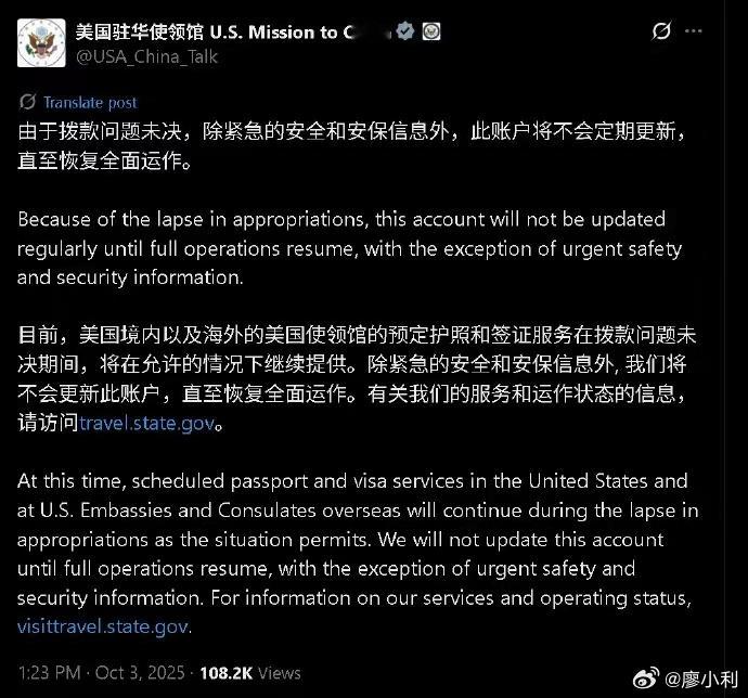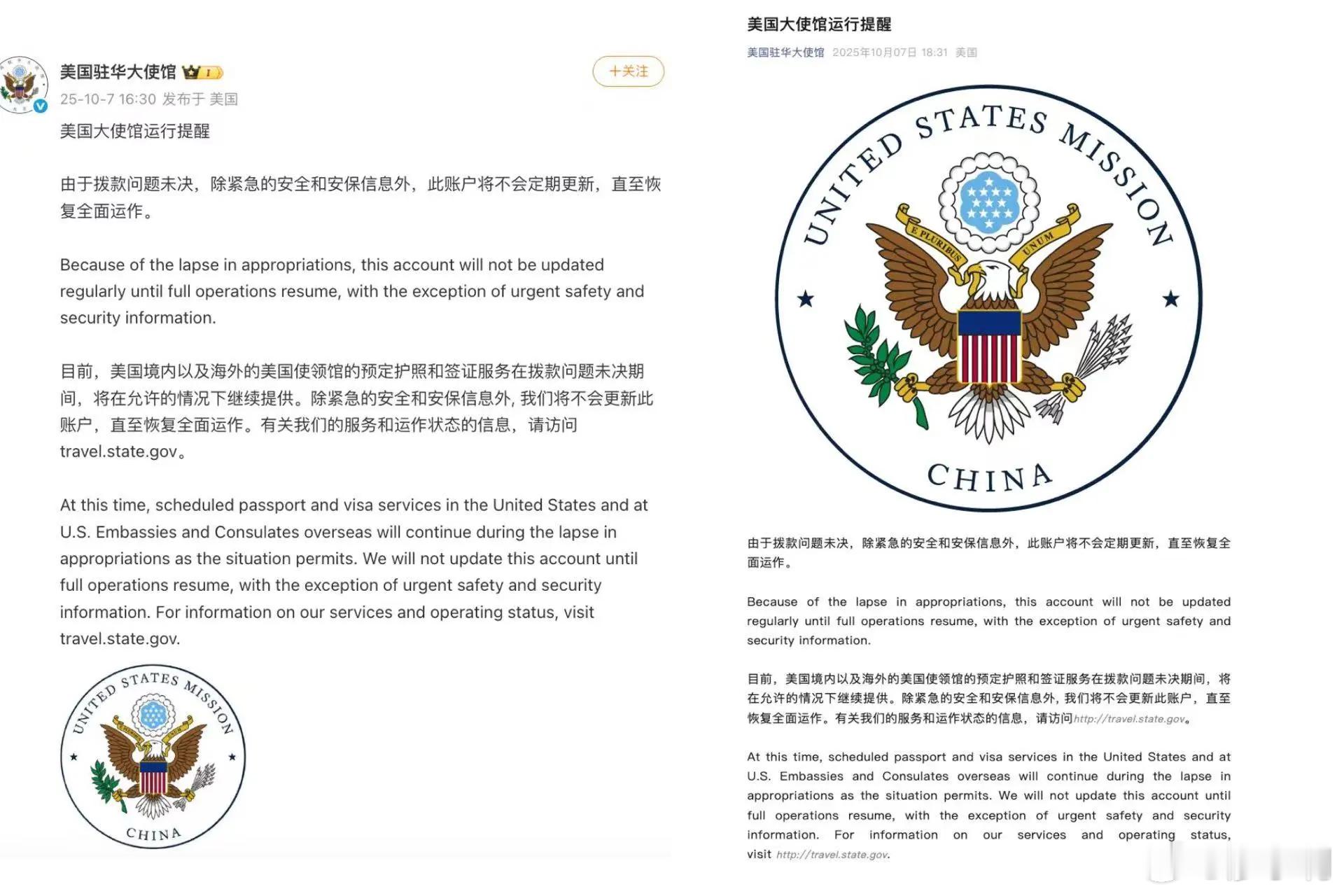 刚刚发生美驻华大使馆突然宣布了!当地时间10月7日,美国驻华大使馆宣布停更,