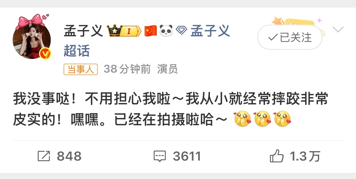孟子义拍戏摔了孟子义[超话] 孟子义拍戏摔到了,不过,刚孟子义发文回应没事了,已经在拍戏了[来抱抱]