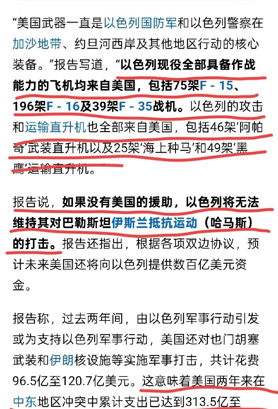 乖乖现在才知道,哈马斯不是和以色列国防军在打仗而是和老美在打仗啊! 据报道,以色列现役能够作战的飞机装备全部来自美国,你没有看错是全部,75架f15,196架f16,39架f35,还包括56架阿帕奇武装直升机,以及多架运输机,这两年来,美国援助以色列200多亿美元。 看来哈马斯在和世界老大再打仗吧,怪不得那么吃力,报道还说,如果没有美国的援助,以色列将无法维持其对巴勒斯坦哈马斯的打击。 怪不得胡塞武装一直袭击美国的船只,船上都是支持以色列的武器装备啊。