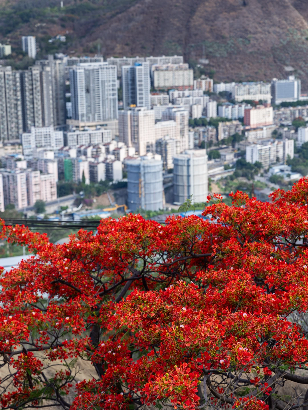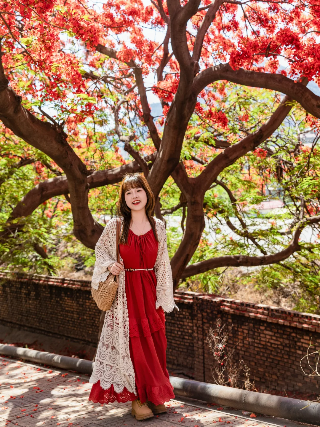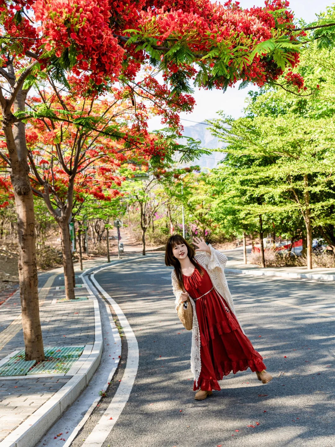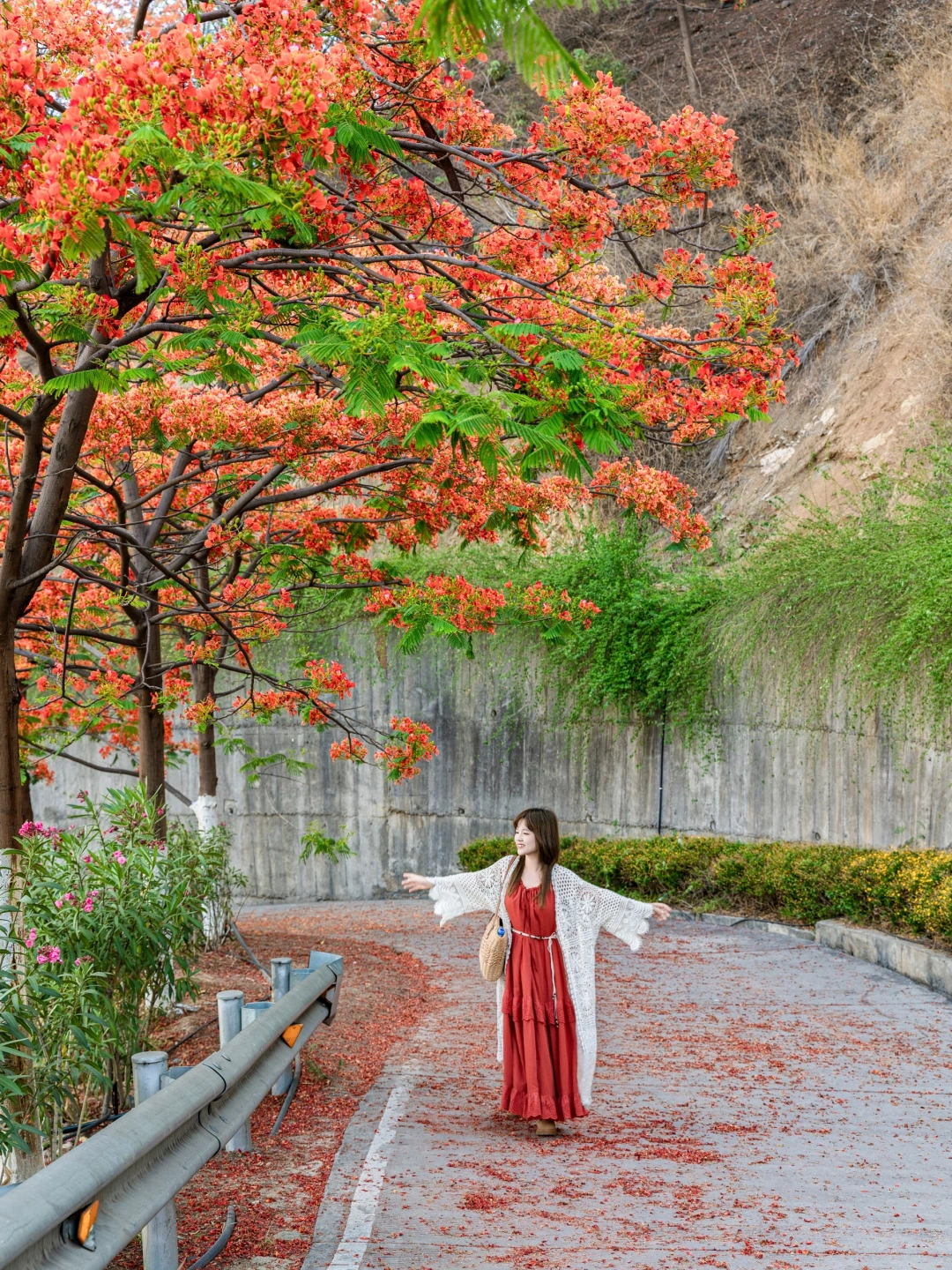街道两旁都是凤凰树,火红一片,随手拍都是无人花海大片。