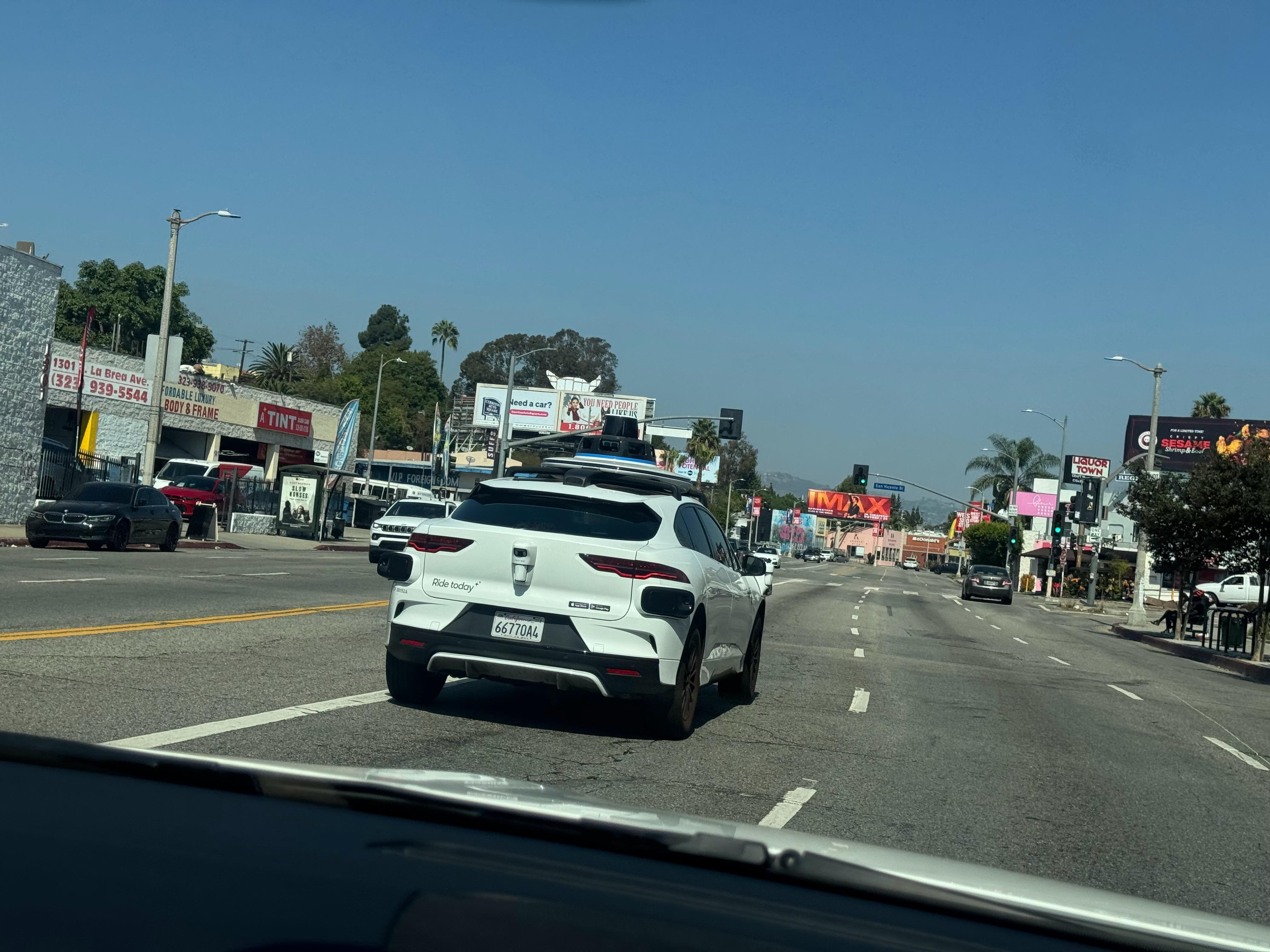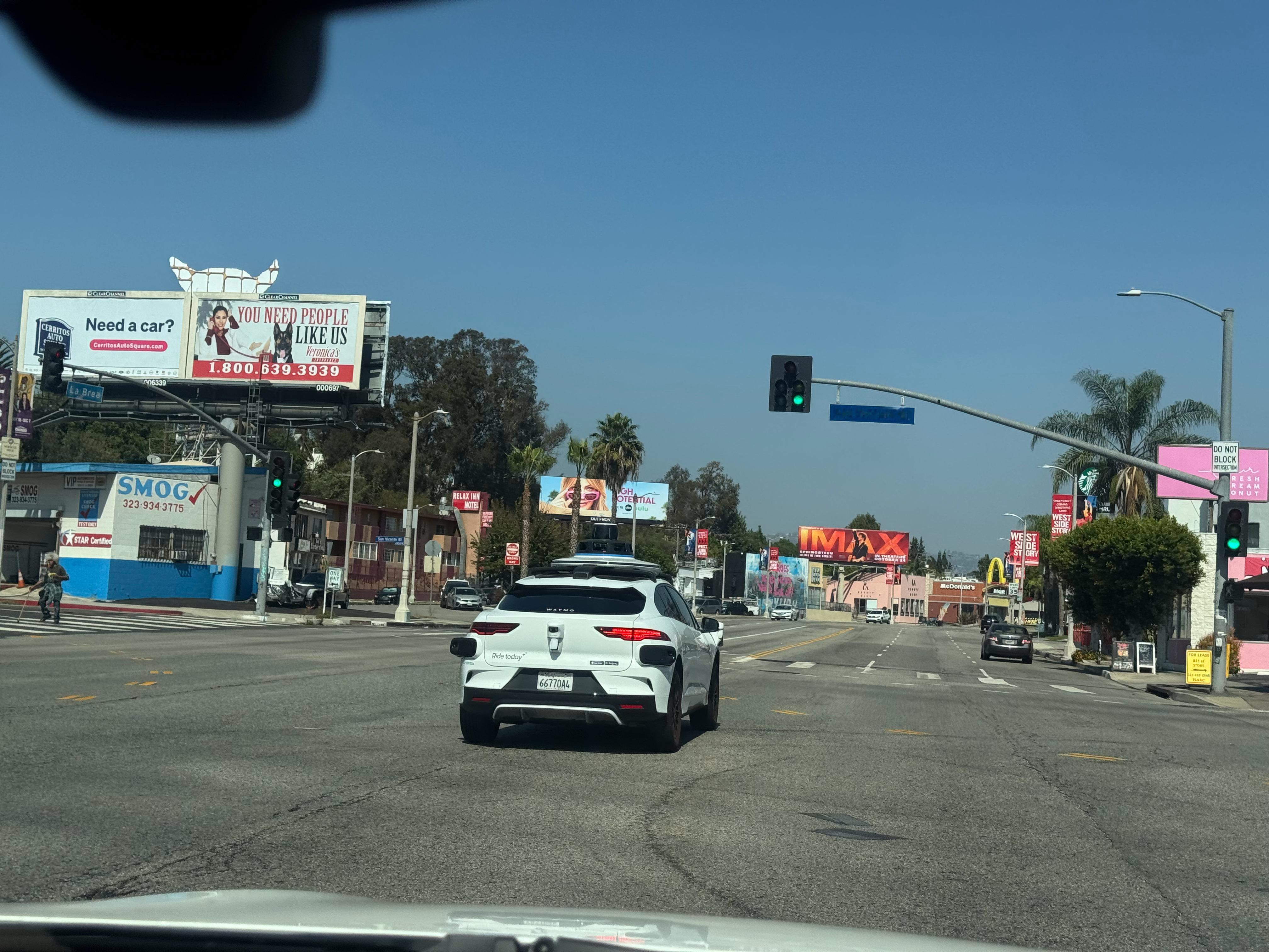 LA街头的无人驾驶车,他试图并道,我们离他有一车半距离,他就一直犹豫,最终放弃了哈哈哈哈哈好可爱,最后我们离开更远一些,他连续并道右转了