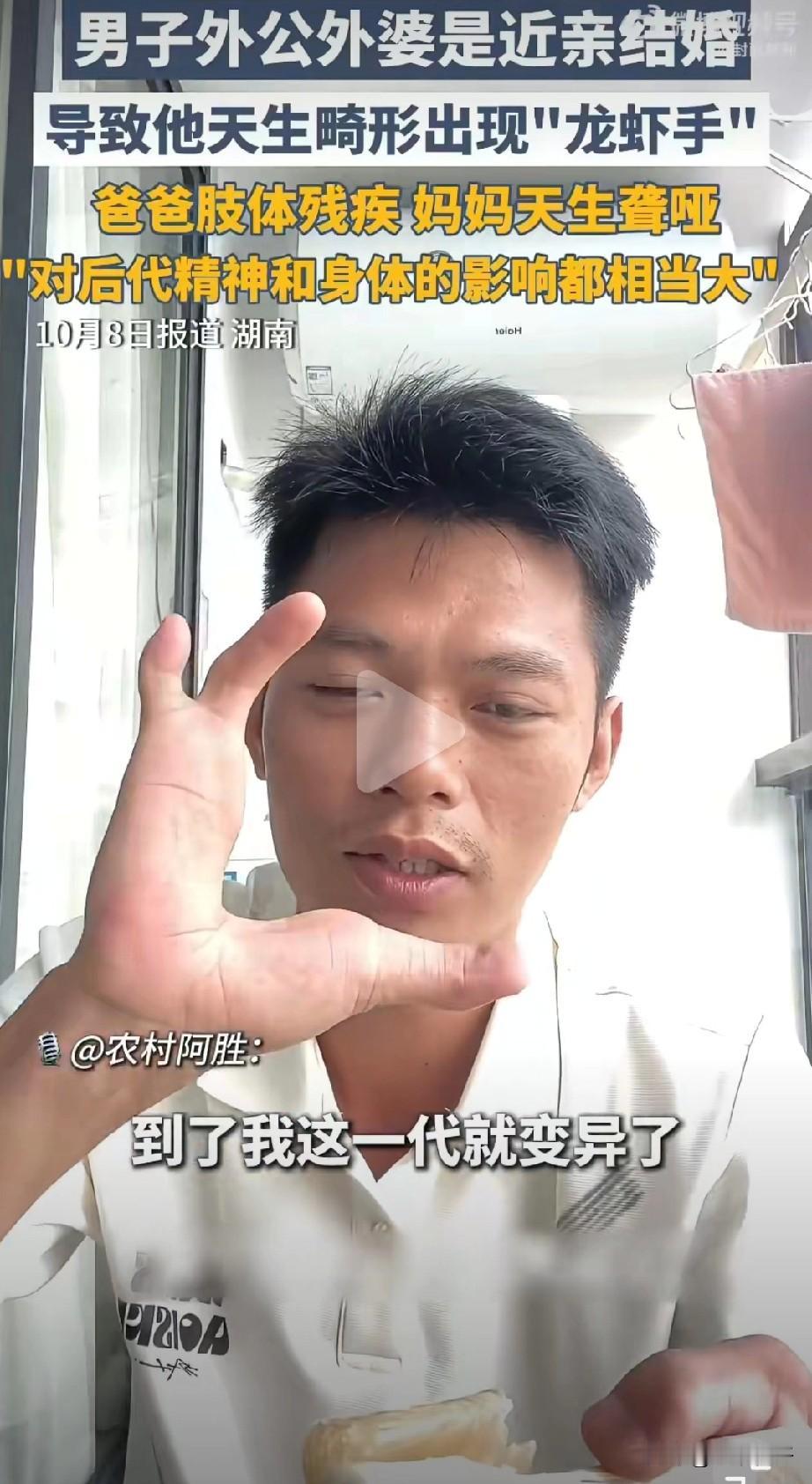 湖南一名90后男子因外公外婆为亲堂兄妹(三代旁系血亲)近亲结婚,导致家族三代健康连锁受损:母亲:天生聋哑(第二代遗传显性);本人:双手双脚呈“龙虾状”畸形(医学称裂手/足畸形),表现为手指缺失、手掌分裂如龙虾螯;近亲👰🏻♀️最多听到的就是表亲,头一次听说堂兄弟姐妹有👰🏻♀️的。 看到这个新闻,心里真的挺不是滋味的。这不仅是一个家庭的悲剧,也让我想到了以前那辈人的一些无奈。我身边上一辈就有表妹嫁给表哥的,但庆幸的是生的孩子没事。但是这肯定是侥幸!近亲结婚,不出问题是侥幸,出了问题就是一辈子甚至几辈子的悲剧…