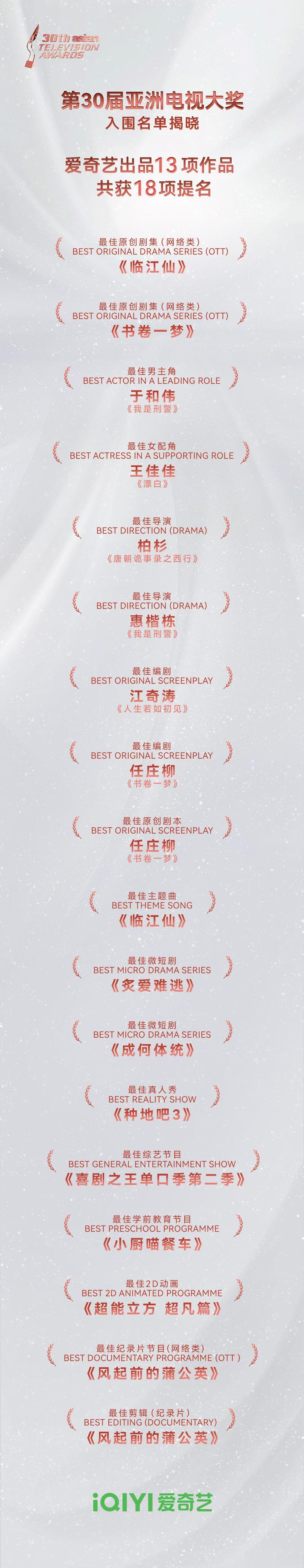 《临江仙》《书卷一梦》成为第30届亚洲电视大奖入围最大赢家