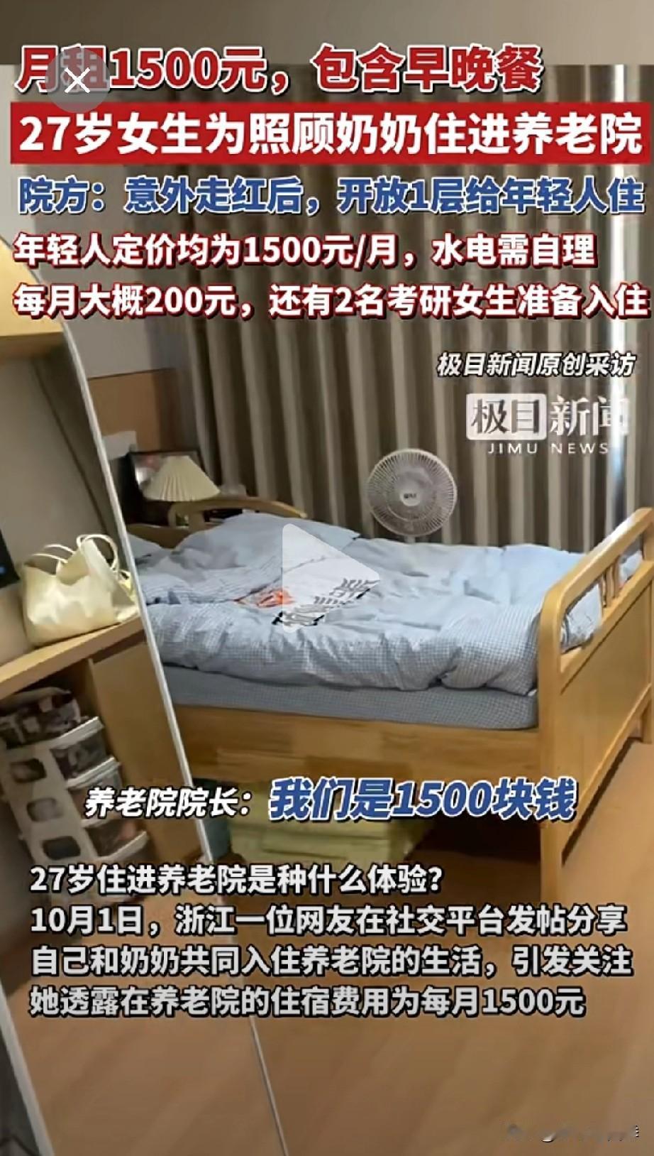年轻人住进养老院,一个月包吃住才1500!水电费也不超过200!佩服现在年轻人的思路! 浙江一个网友开始是为了照顾奶奶,住进养老院走红,后来养老院专门开放了一层给有需要的年轻人,现在又有两个年轻的研究生准备入住,已经交完了费用! 挺好的选择,在费用上比外面找房子要便宜好多,1500还包含早晚餐,肯定比吃外卖要健康还省下很多费用! 等你老了愿意去养老院还是回农村老家养老 养老院 图片来源于极目新闻