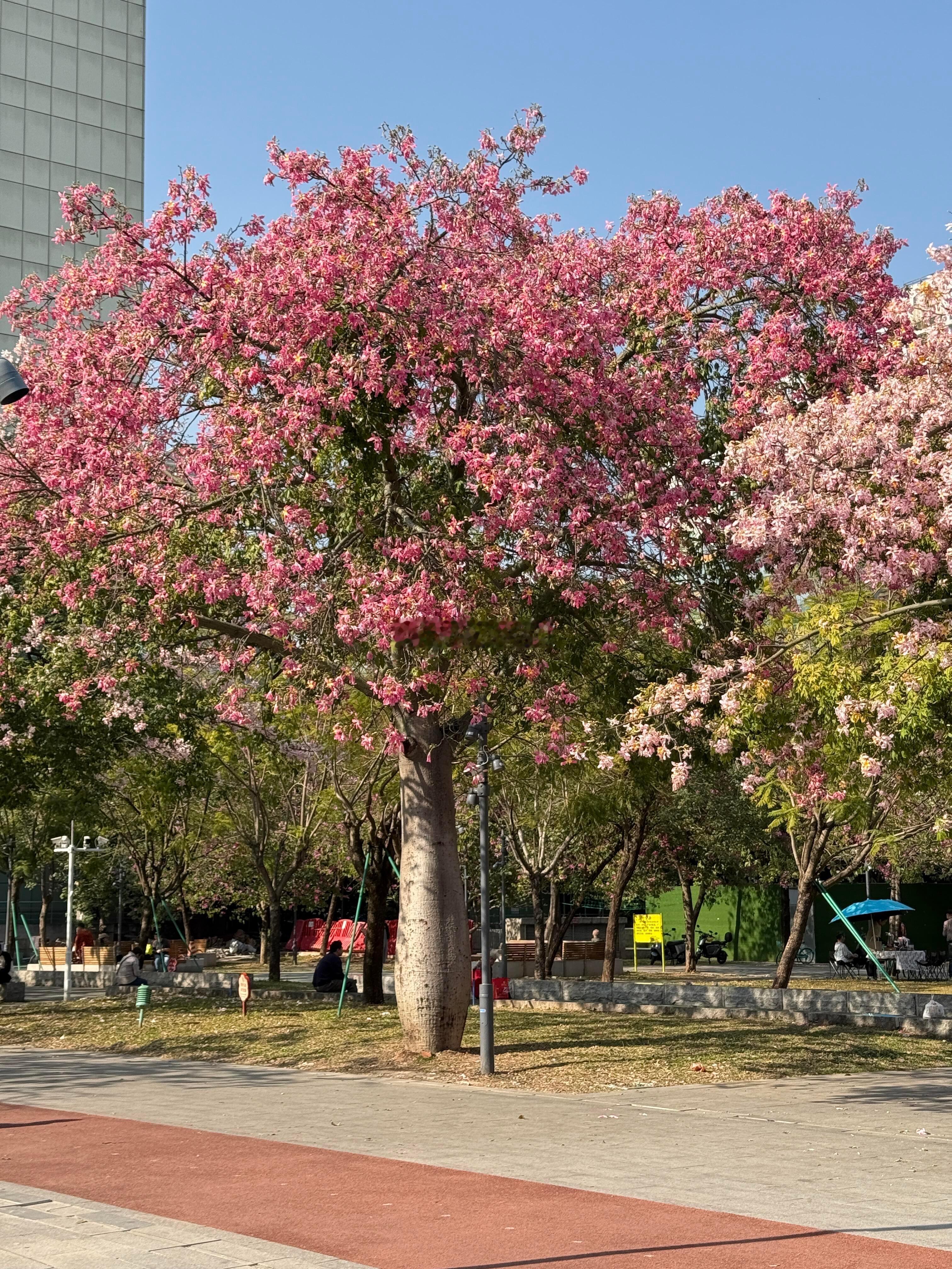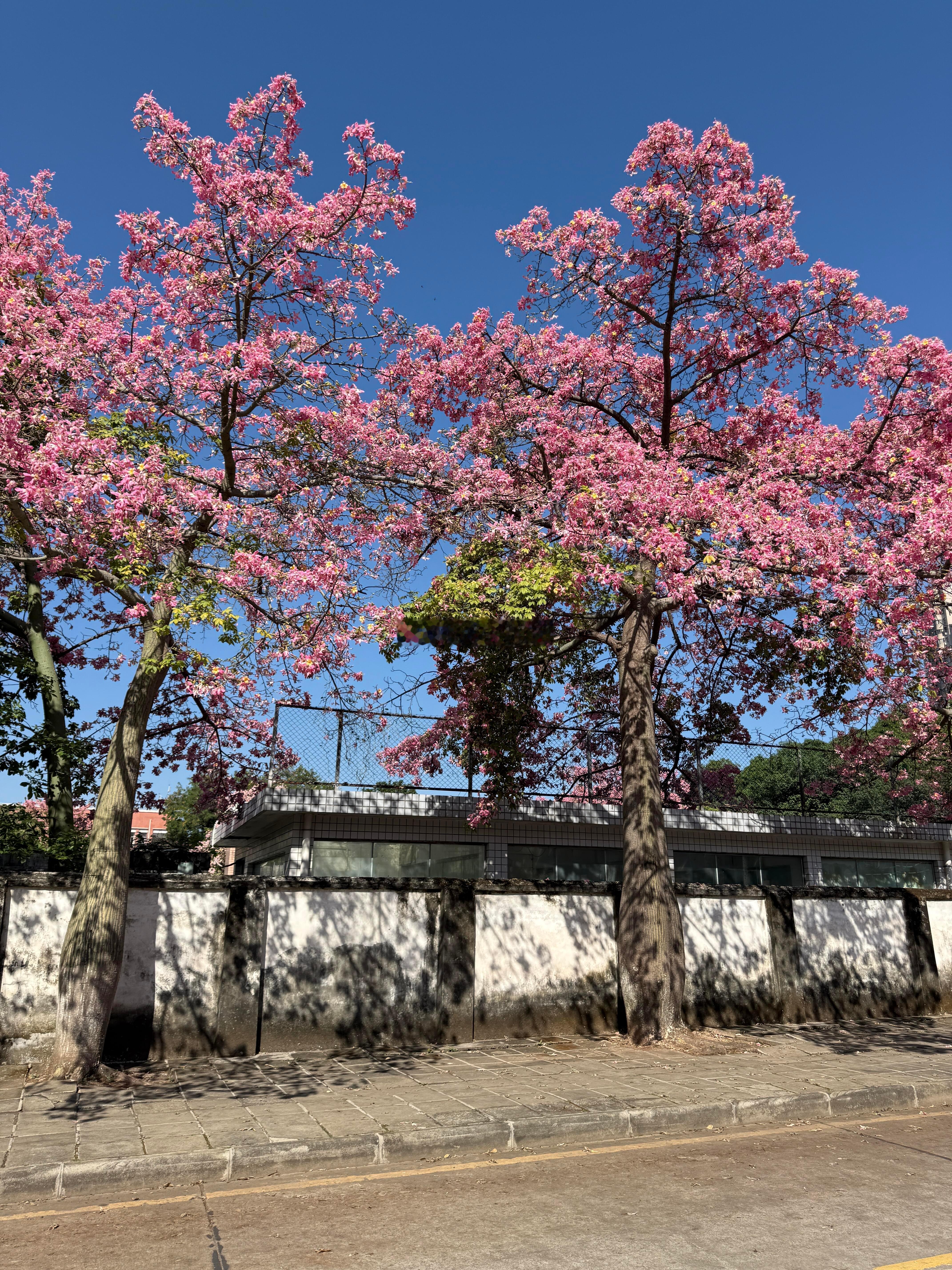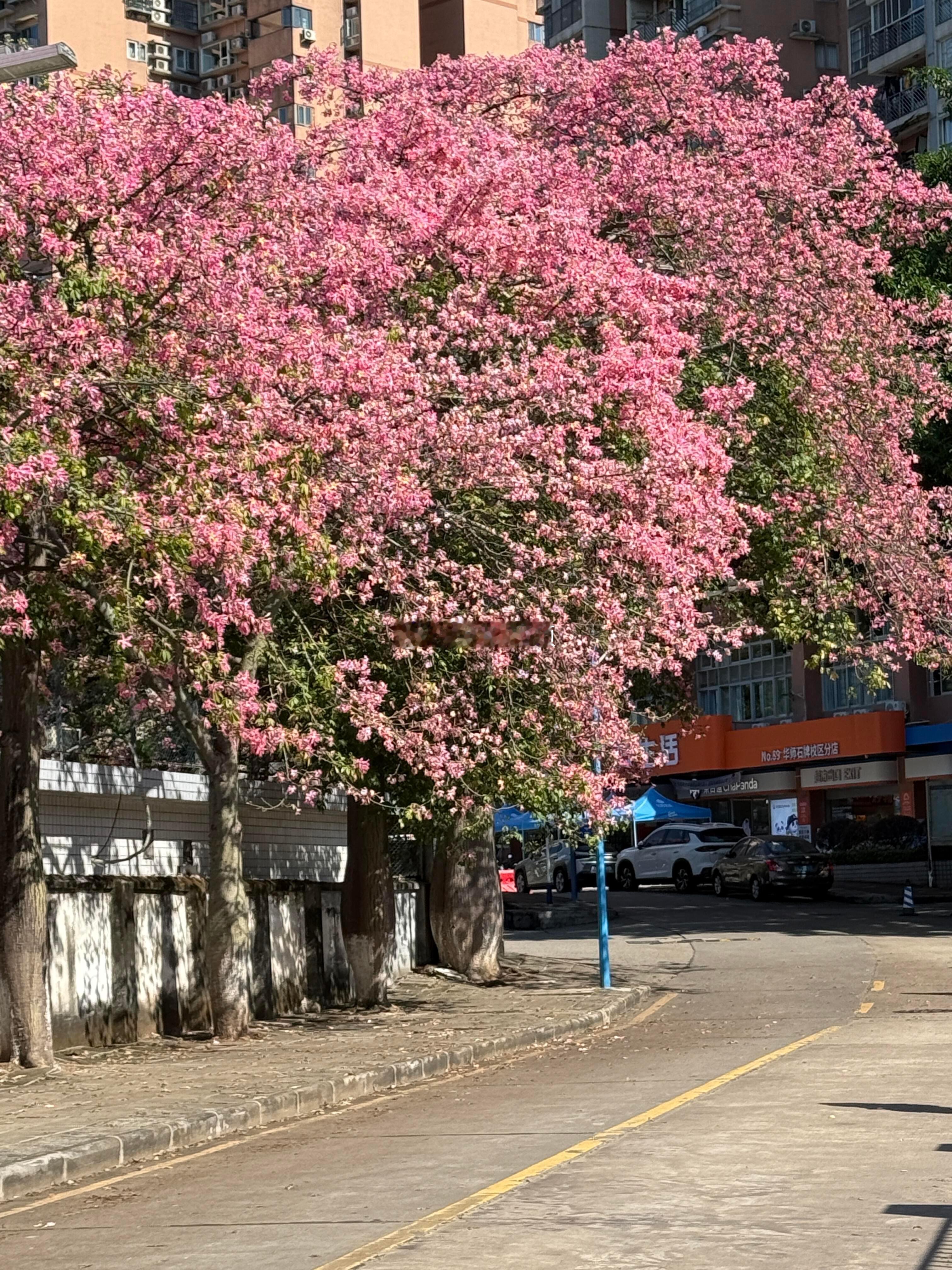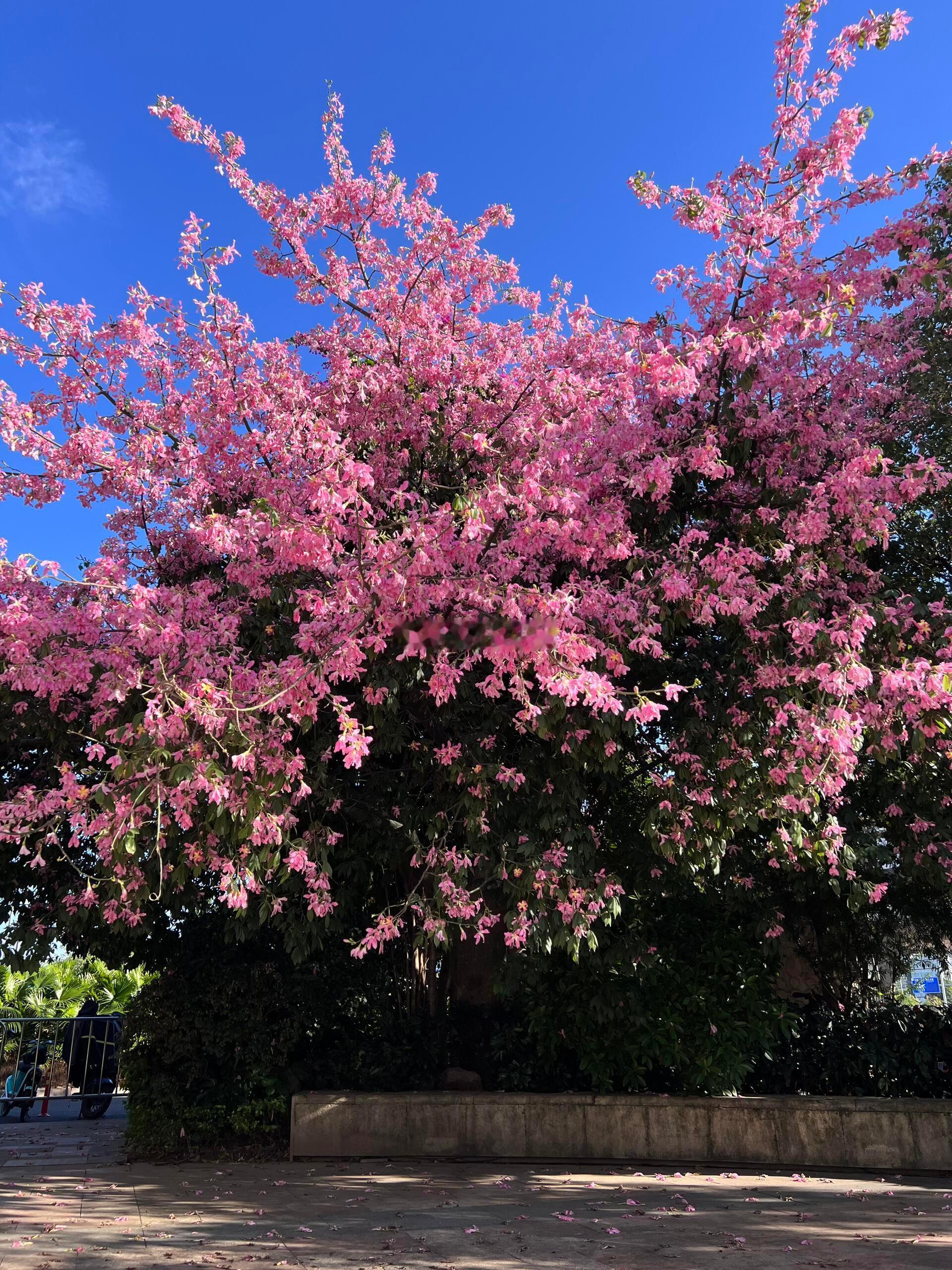 蓝天白云映衬着粉色的花好像走进了漫画一样
