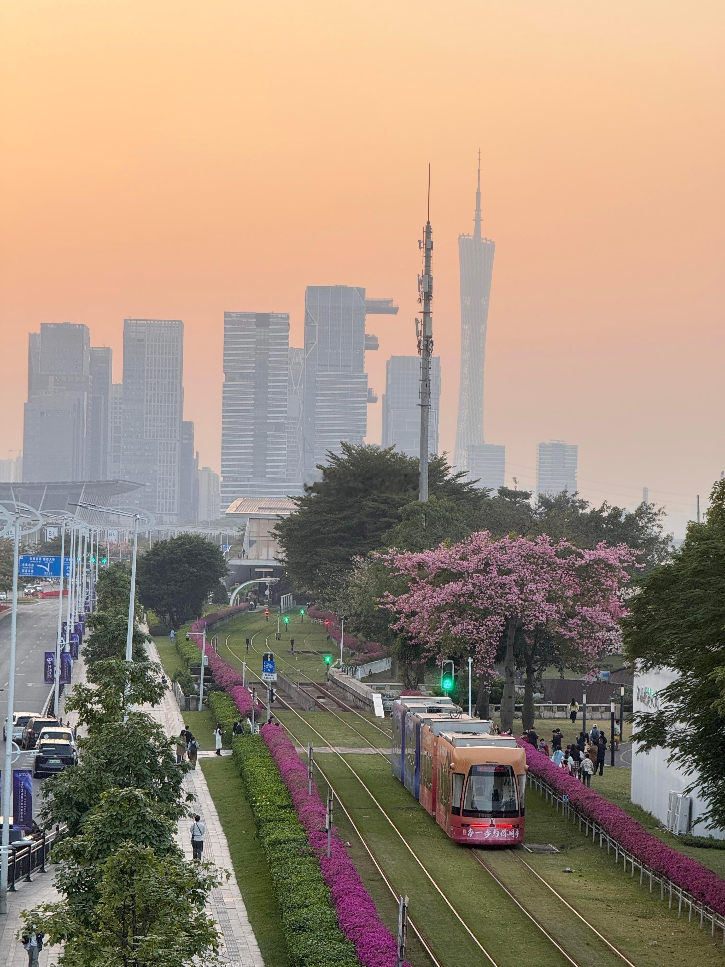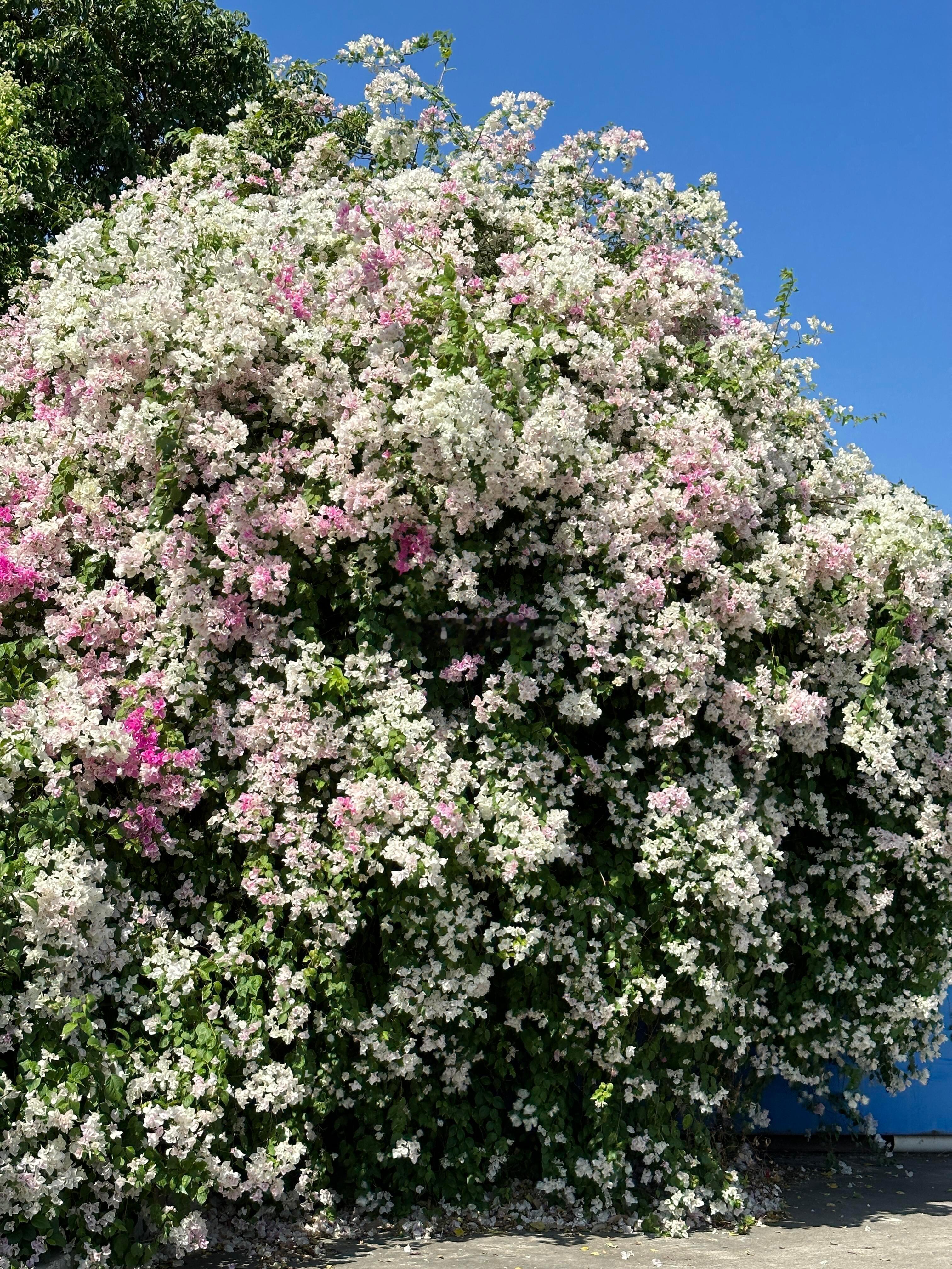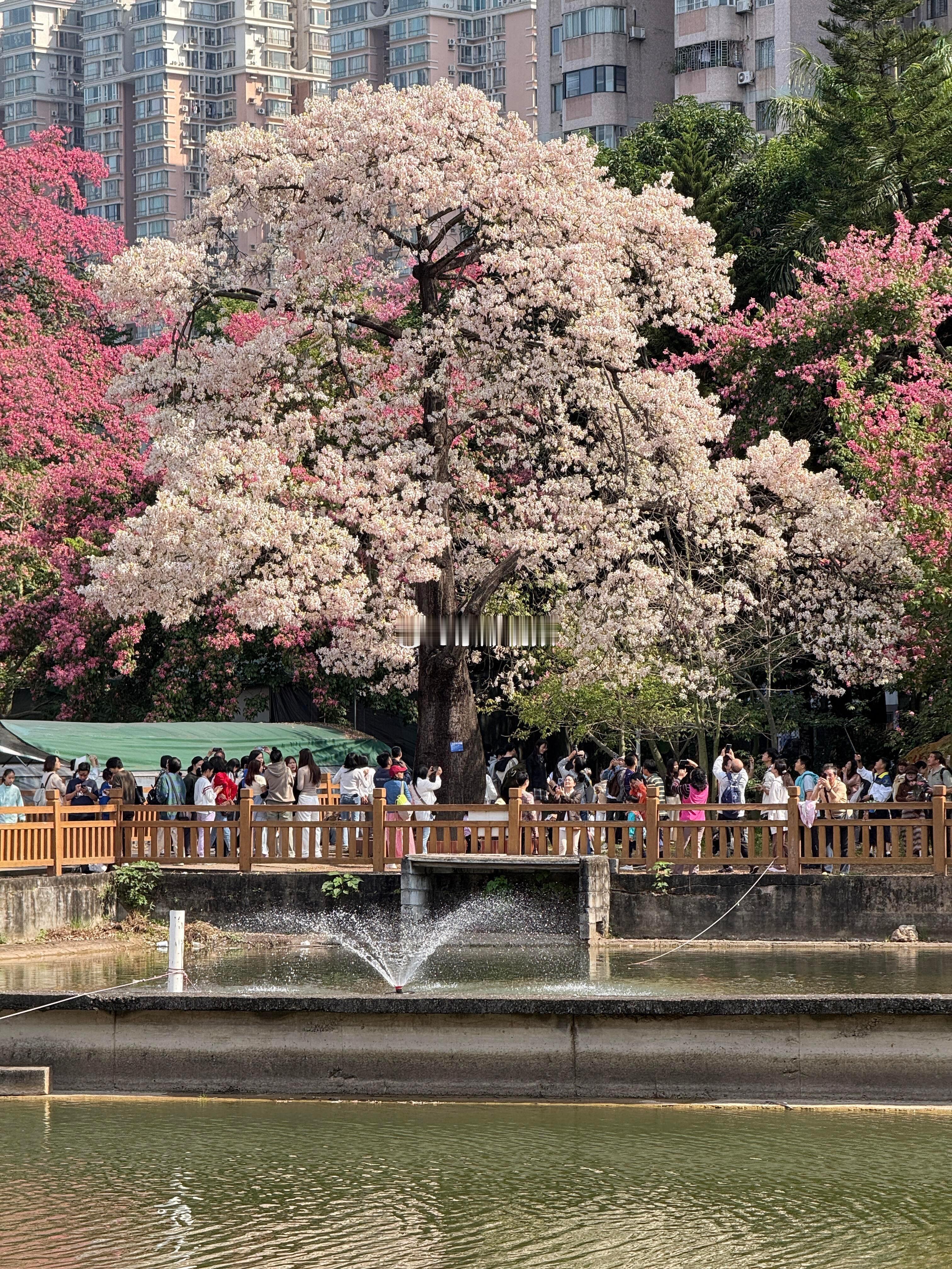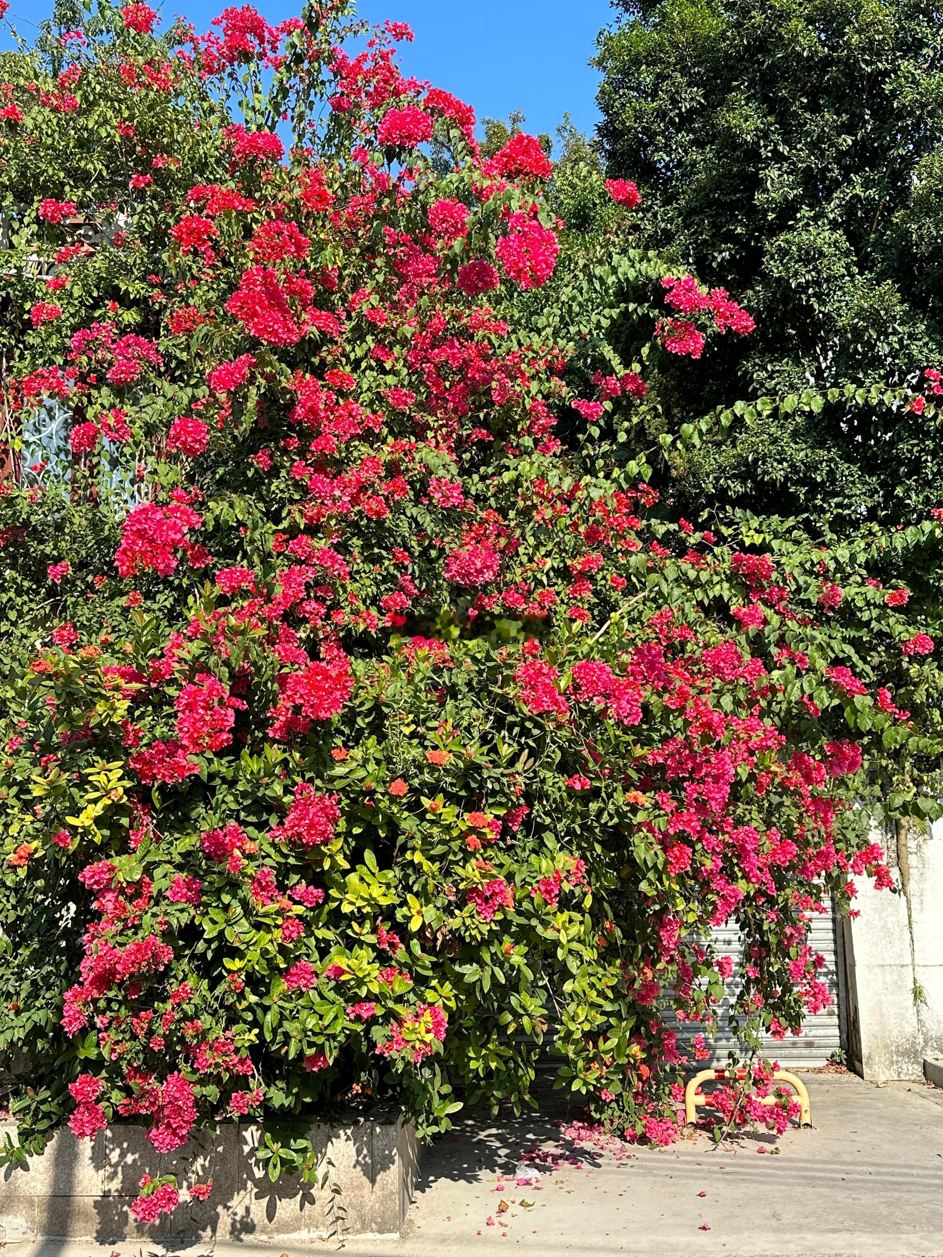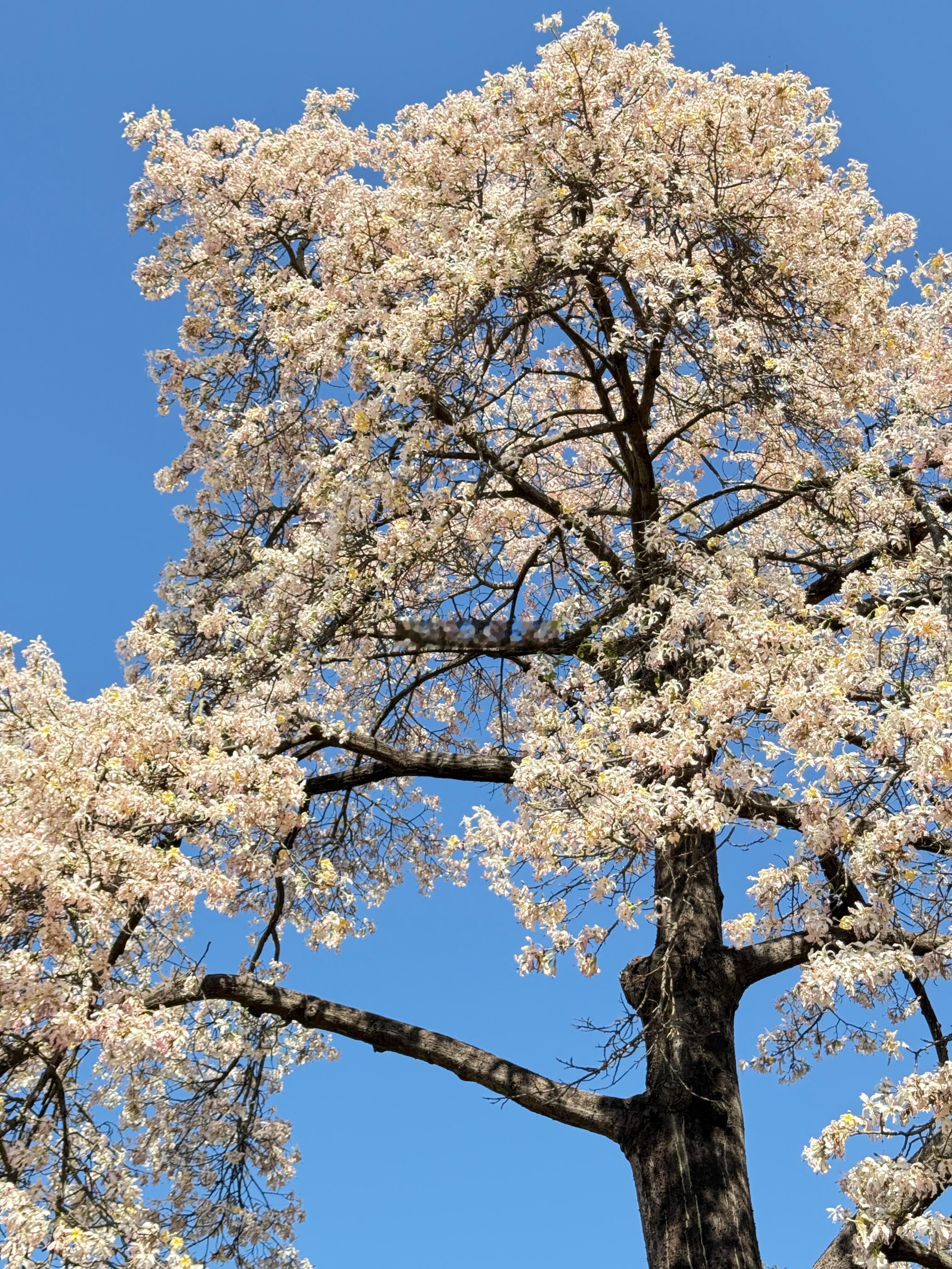 蓝天白云映衬着粉色的花好像走进了漫画一样