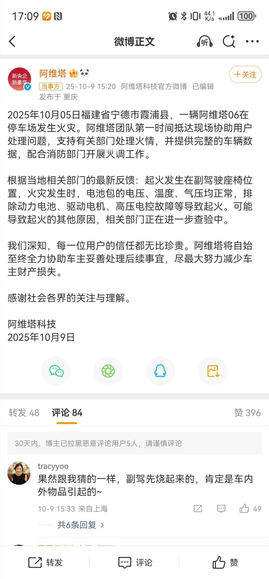阿维塔回应一车辆起火致7车烧毁,起火点在副驾驶,电池、电控、电机正常,也就是说不是车自身原因。初步判断,大概率是车内放的物品引起的。那些带节奏的可以歇歇了,别一出事就往前冲[doge]