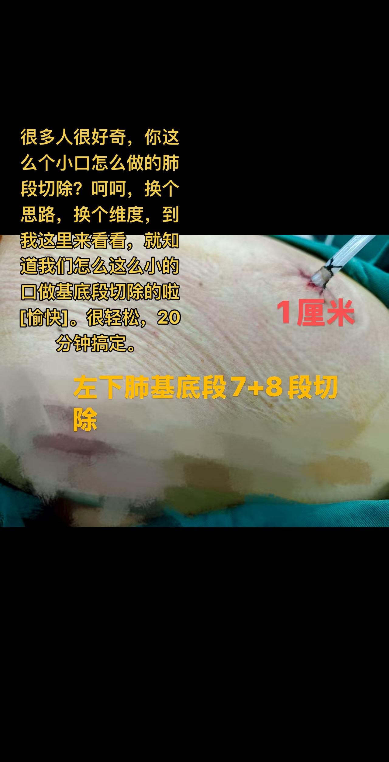 1厘米超微创基底段切除。很多很好奇,你这么个小口怎么做的肺段切除?呵呵,换个思路,换个维度,到我这里来看看,就知道我们怎么这么小的口做基底段切除的啦[愉快]。很轻松,20分钟搞定,而且肺段的剪裁非常满意,做到以结节为中心的标准切除。满意[微笑]